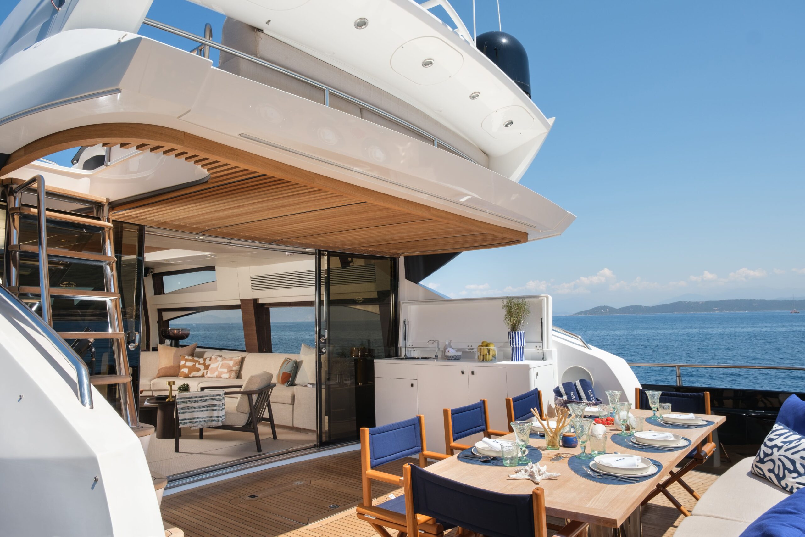 Spacious exterior areas with sunpads, aft cockpit dining, and open sun deck.