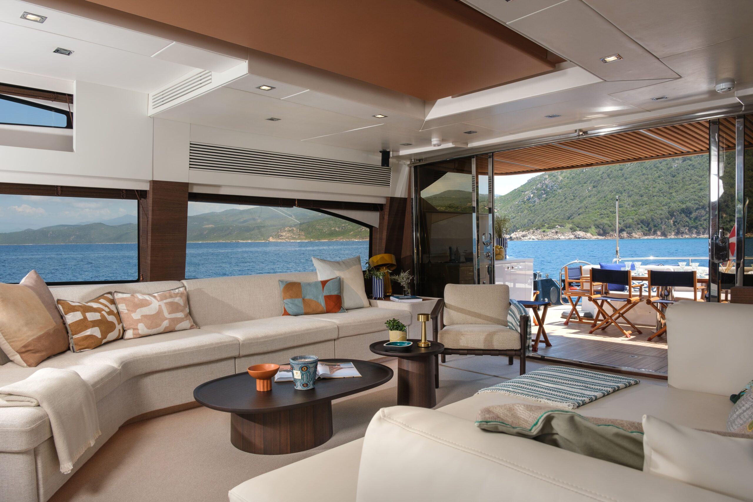 Her inviting exterior spaces are designed for effortless sociability and sun-soaked leisure. Relax on expansive foredeck sunpads, gather for al fresco dining in the stylish aft cockpit, or soak up panoramic views from the open sun deck. Steps from the cockpit lead directly to the water via a generous swim platform, enhanced further by a floating dock with sea pool – perfect for spontaneous dips and water play.