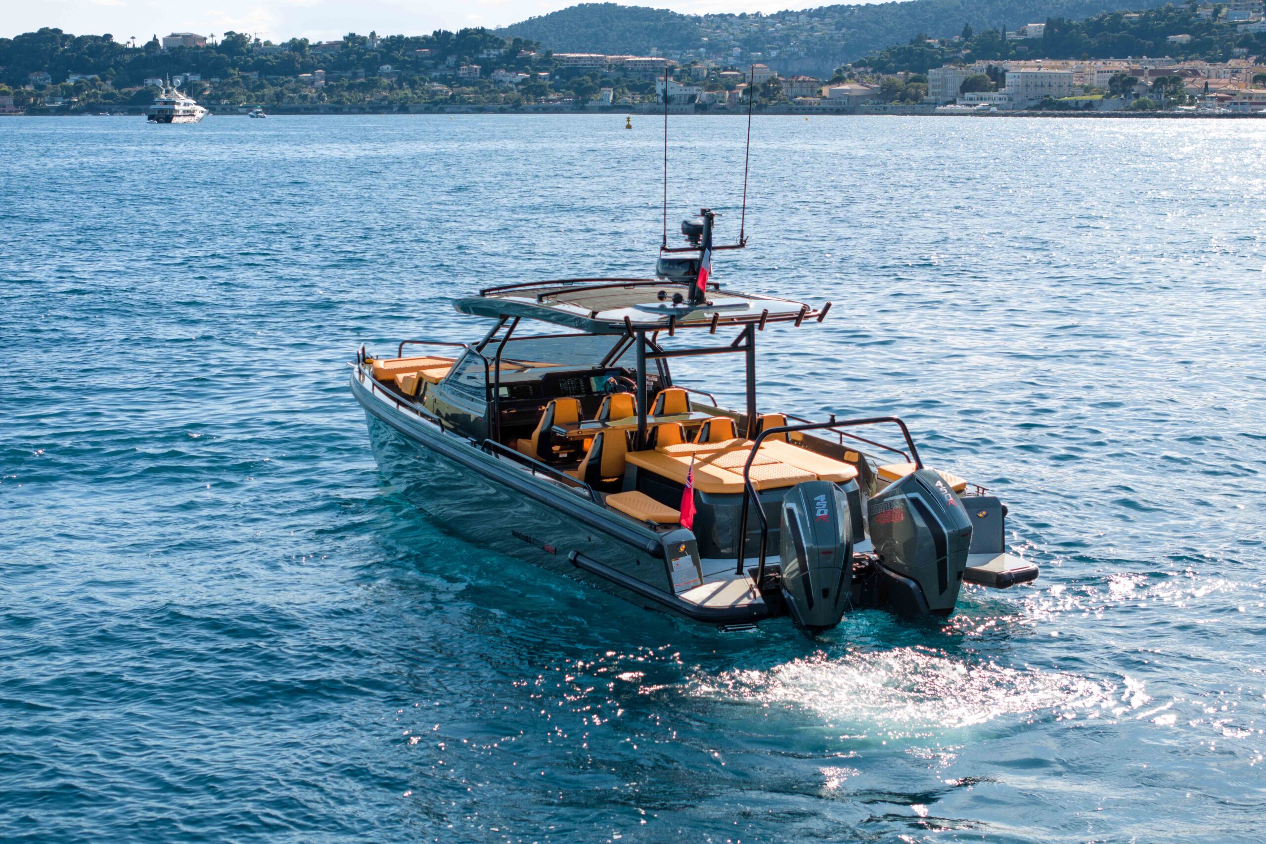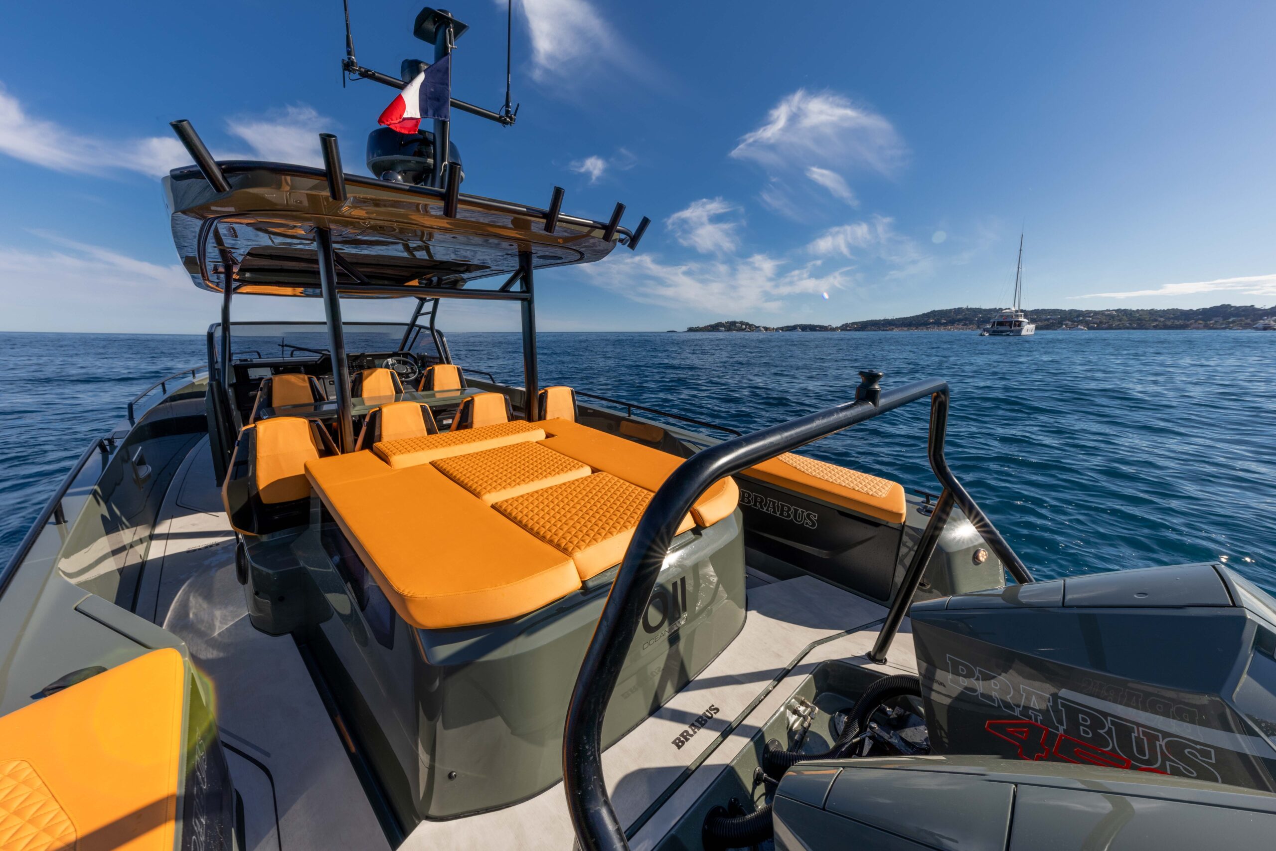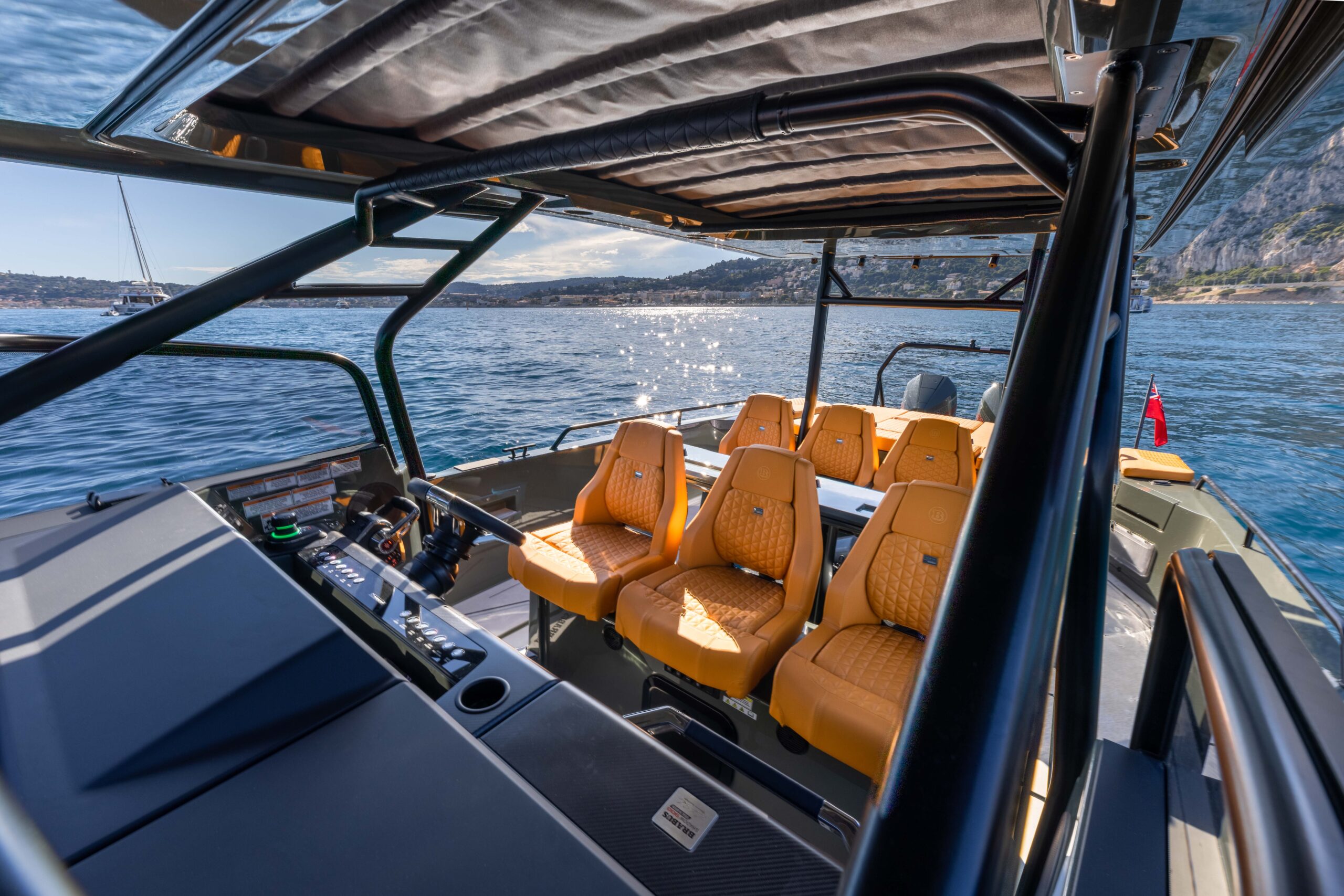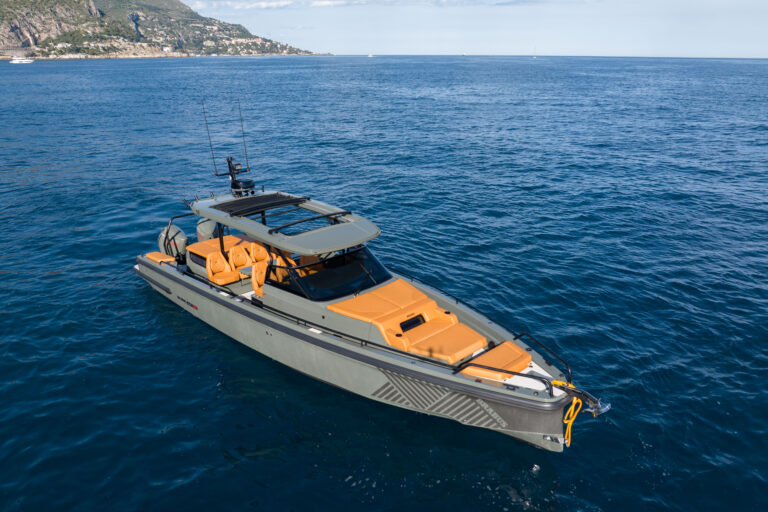 The BRABUS Shadow 900 Sun-Top Stealth Green Signature Edition is a bold fusion of high-performance engineering and unmistakable luxury design. Powered by twin Mercury 450R racing engines delivering a total of 900 hp, this 38-foot powerhouse reaches exhilarating speeds of 60+ knots with ease. Its striking Stealth Green paintwork, matte carbon accents, and Sunrise upholstery define its distinctive aesthetic, ensuring it stands out in any marina. Cutting-edge technology at the helm includes a dual Simrad Glass Helm display, intuitive fingertip controls, and an advanced BRABUS user interface for total command on the water. Comfort is equally prioritized with 2 spacious queen-size sleeping accommodations, and optional entertainment upgrades. Confident, authentic, and uncompromising, this model is the ultimate expression of BRABUS’ signature style at sea.