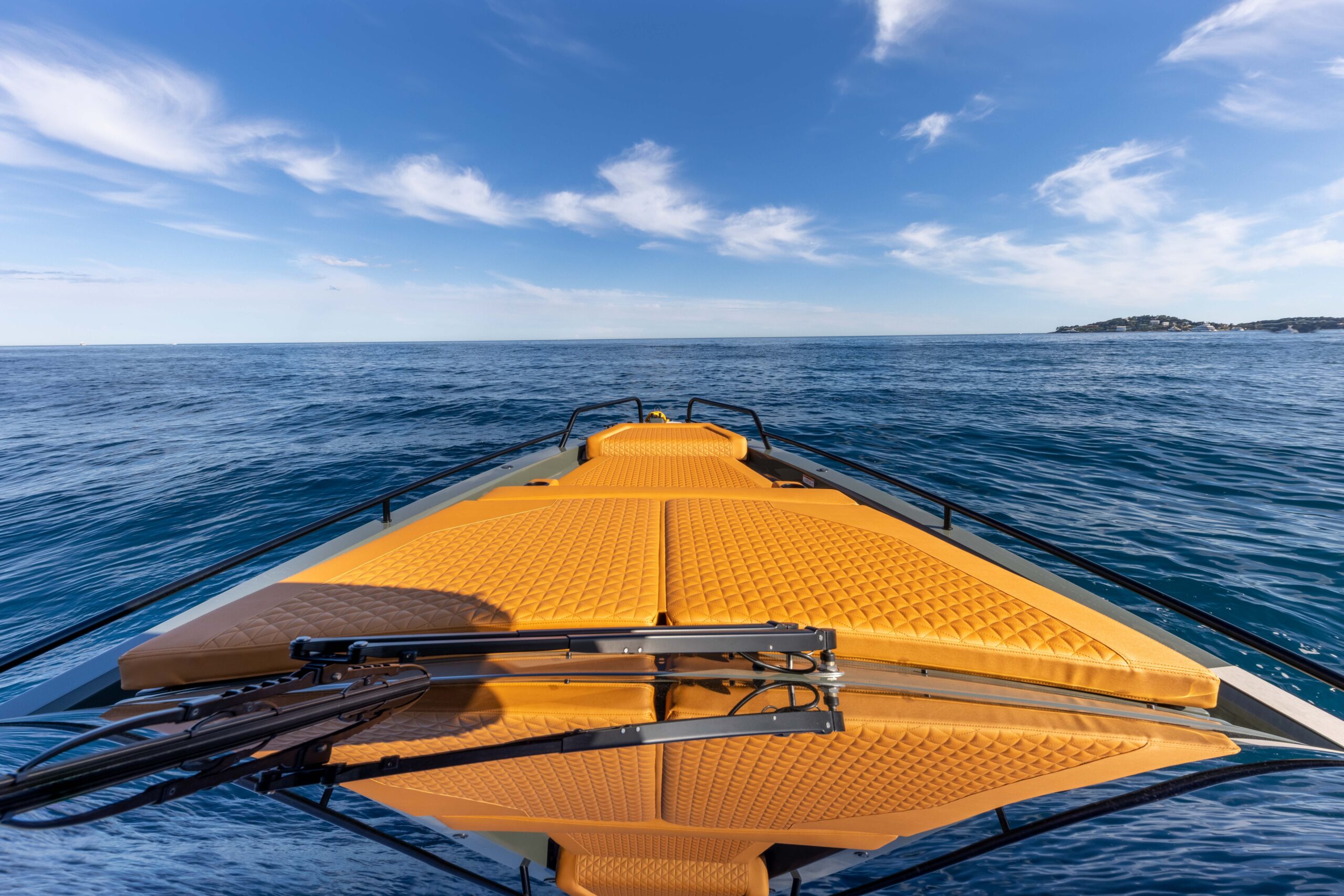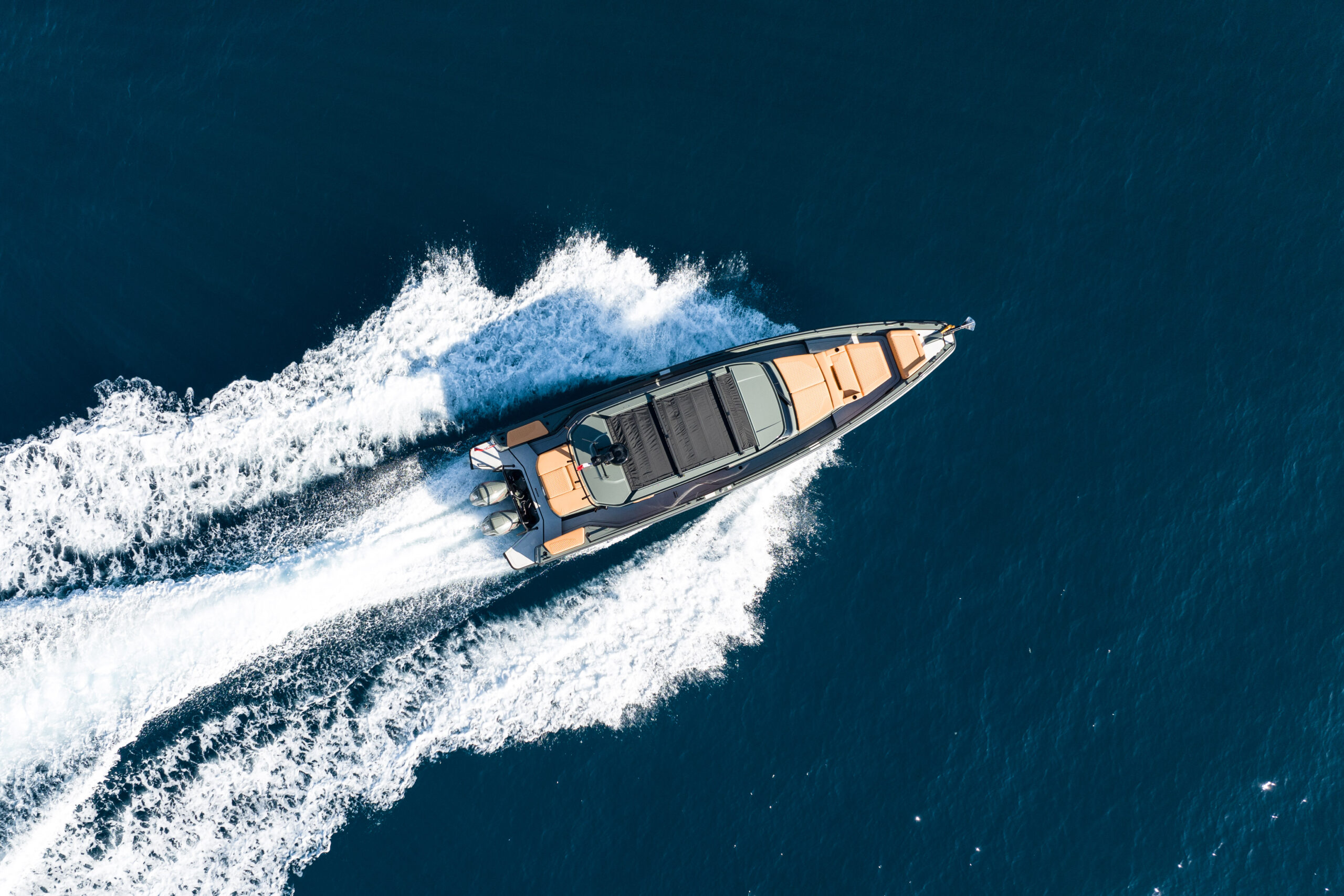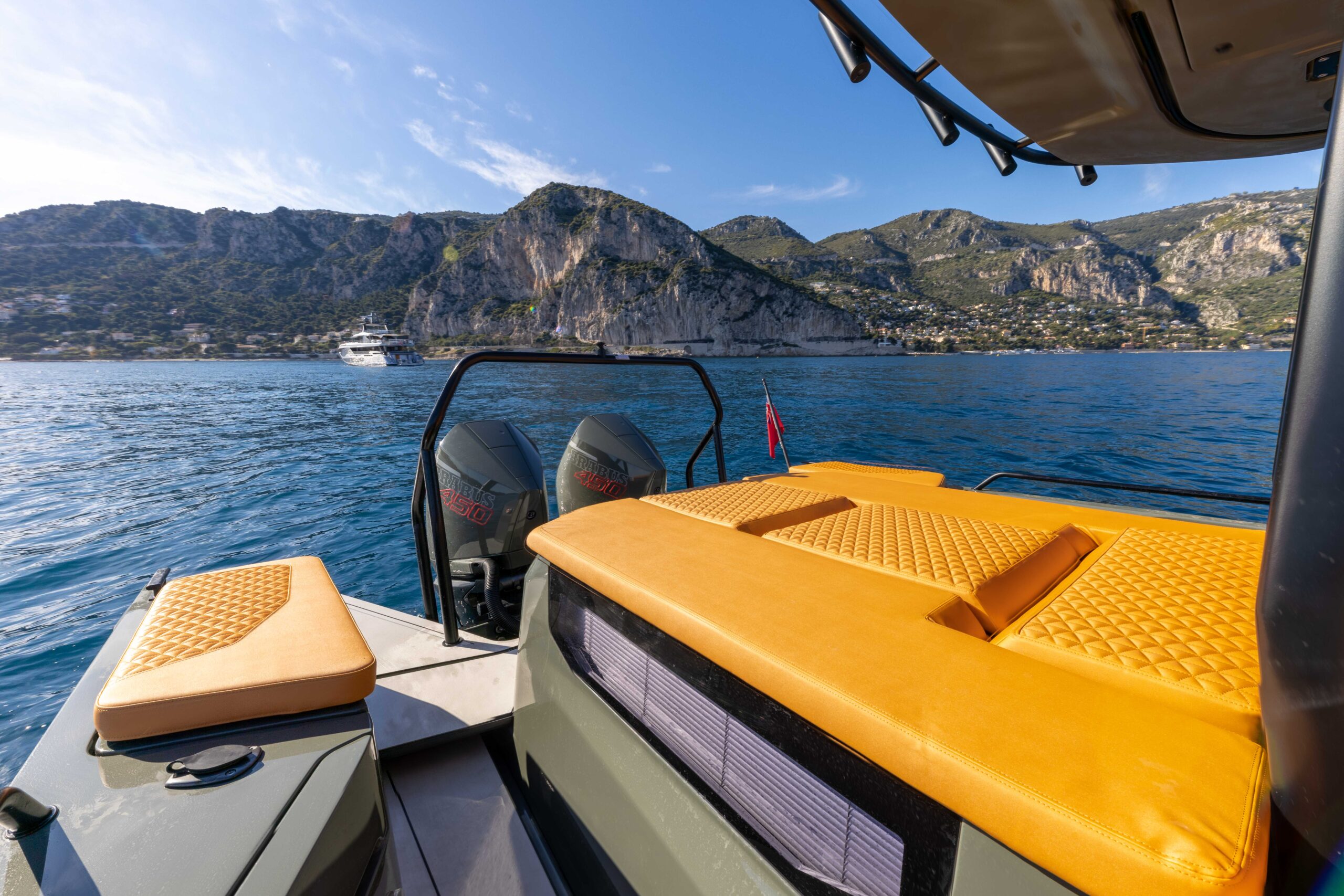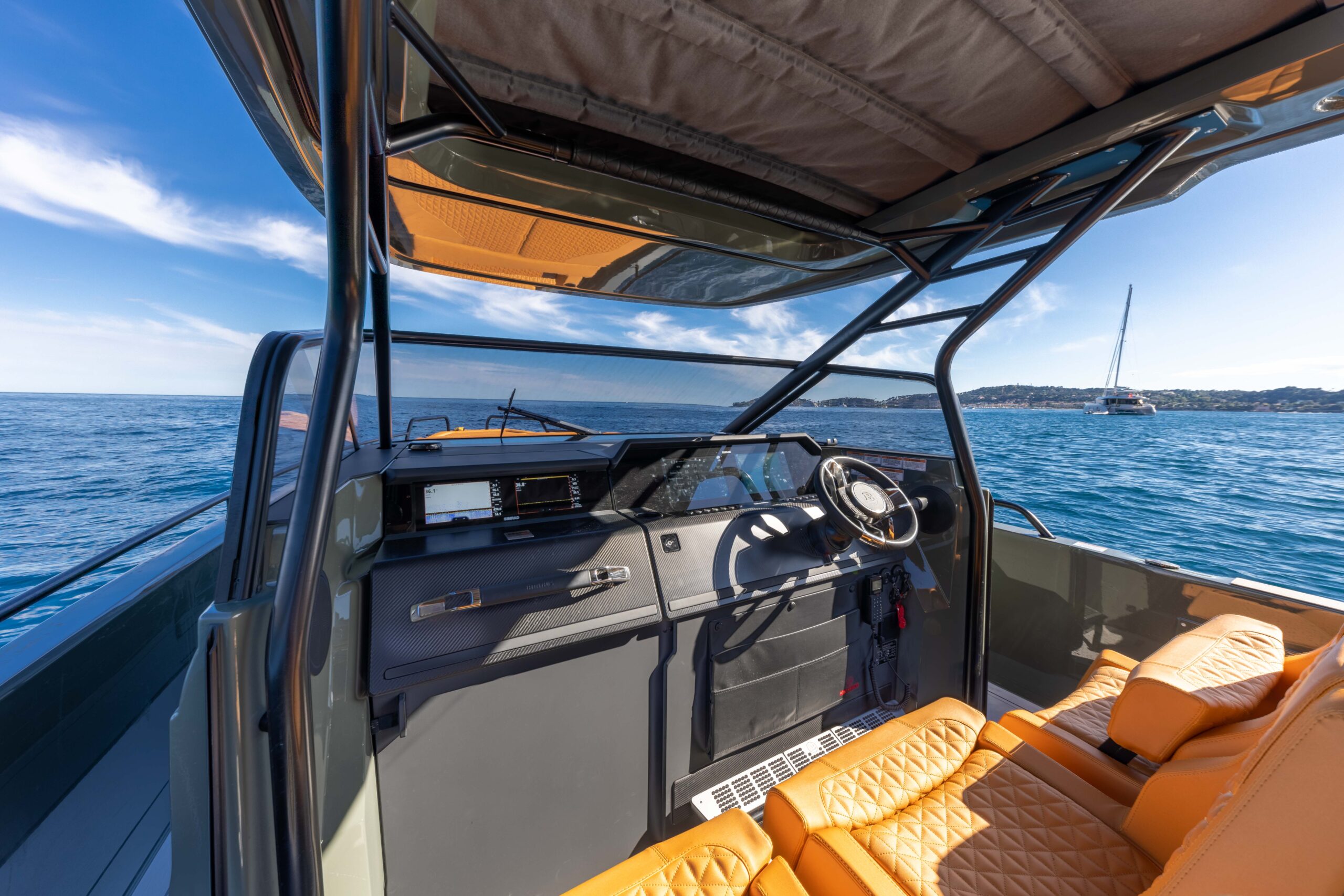 The BRABUS Shadow 900 Sun-Top Stealth Green Signature Edition is a bold fusion of high-performance engineering and unmistakable luxury design. Powered by twin Mercury 450R racing engines delivering a total of 900 hp, this 38-foot powerhouse reaches exhilarating speeds of 60+ knots with ease. Its striking Stealth Green paintwork, matte carbon accents, and Sunrise upholstery define its distinctive aesthetic, ensuring it stands out in any marina. Cutting-edge technology at the helm includes a dual Simrad Glass Helm display, intuitive fingertip controls, and an advanced BRABUS user interface for total command on the water. Comfort is equally prioritized with 2 spacious queen-size sleeping accommodations, and optional entertainment upgrades. Confident, authentic, and uncompromising, this model is the ultimate expression of BRABUS’ signature style at sea.