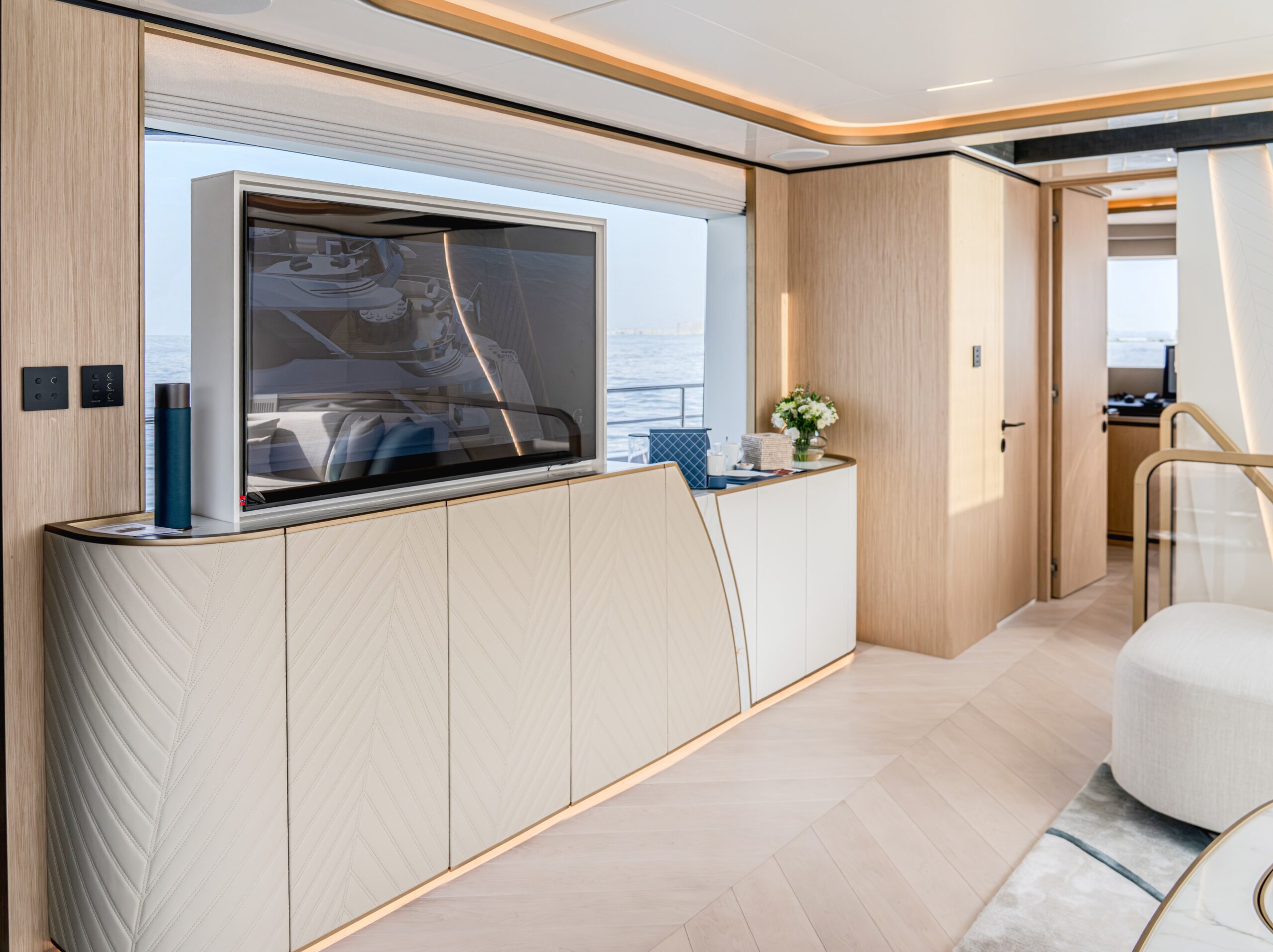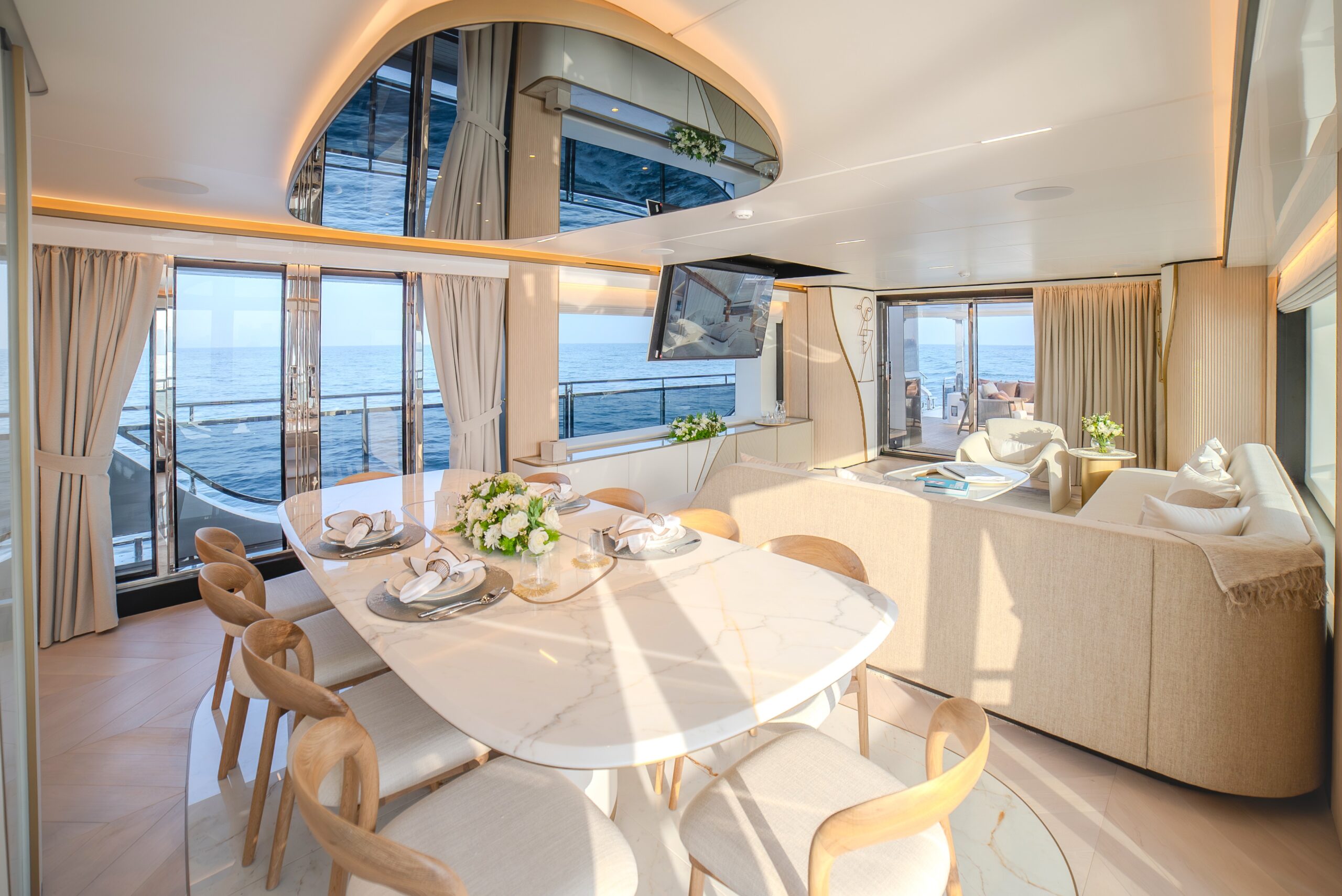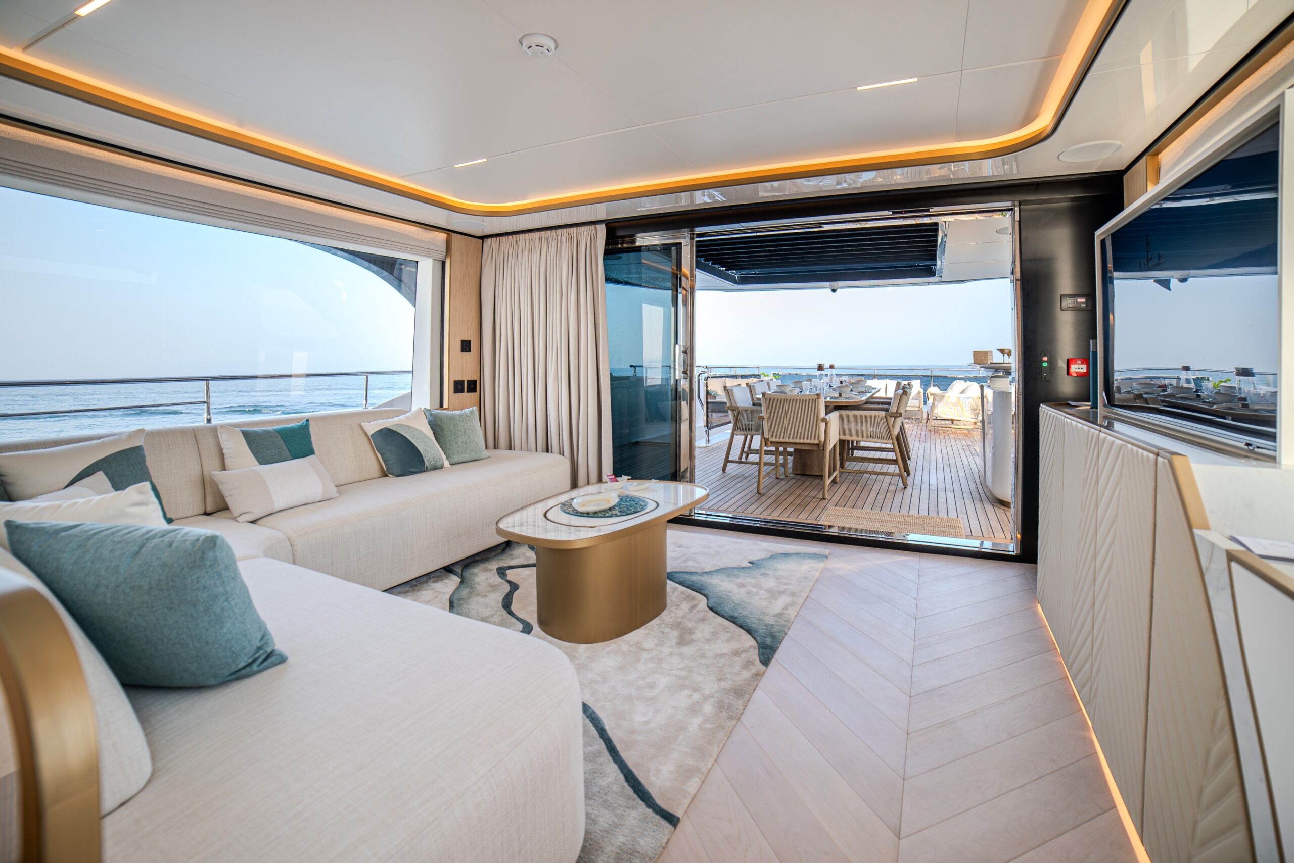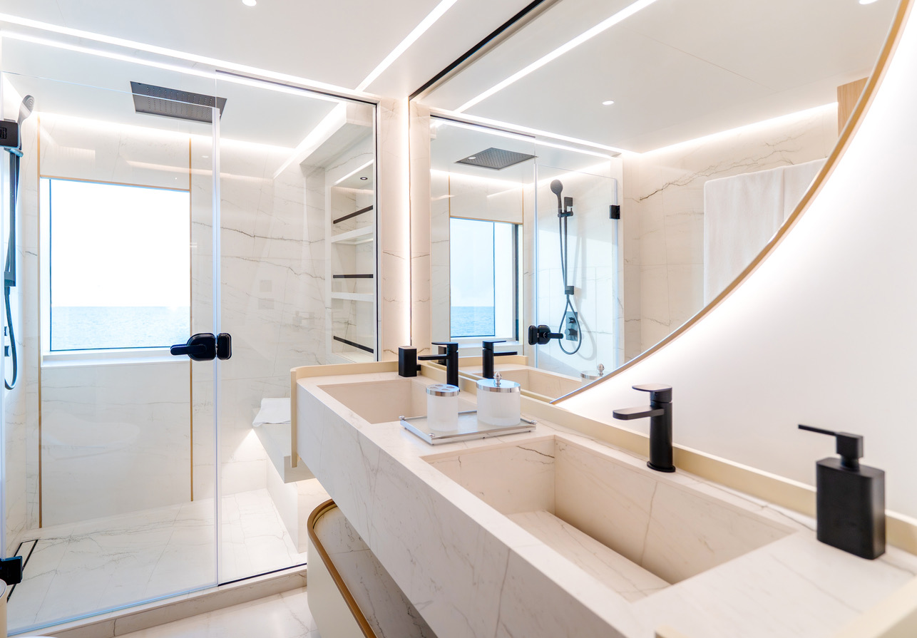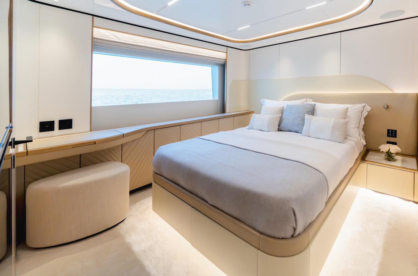 One of the Majesty 100 Terrace’s most distinctive features is the private owner’s suite terrace at the bow, offering an exclusive outdoor retreat with uninterrupted views. The yacht’s design emphasizes a harmonious indoor- outdoor experience, with floor-to-ceiling patio doors and expansive deck spaces that invite natural light and fresh sea breezes.