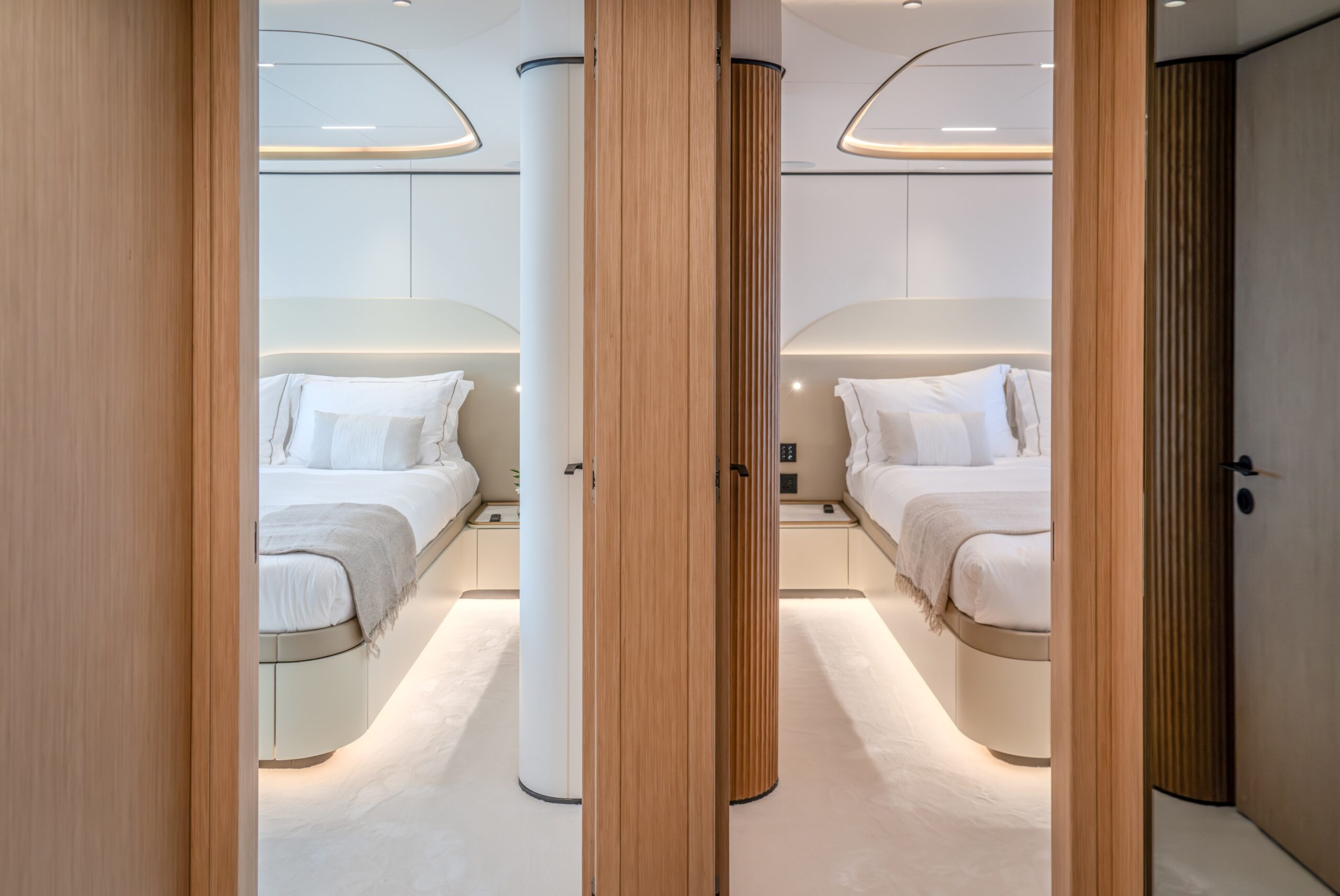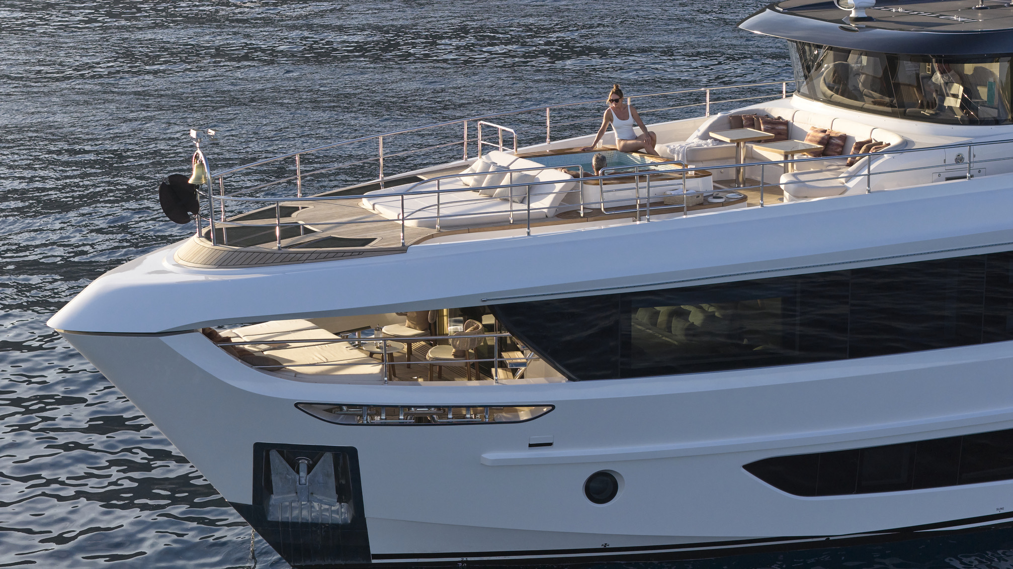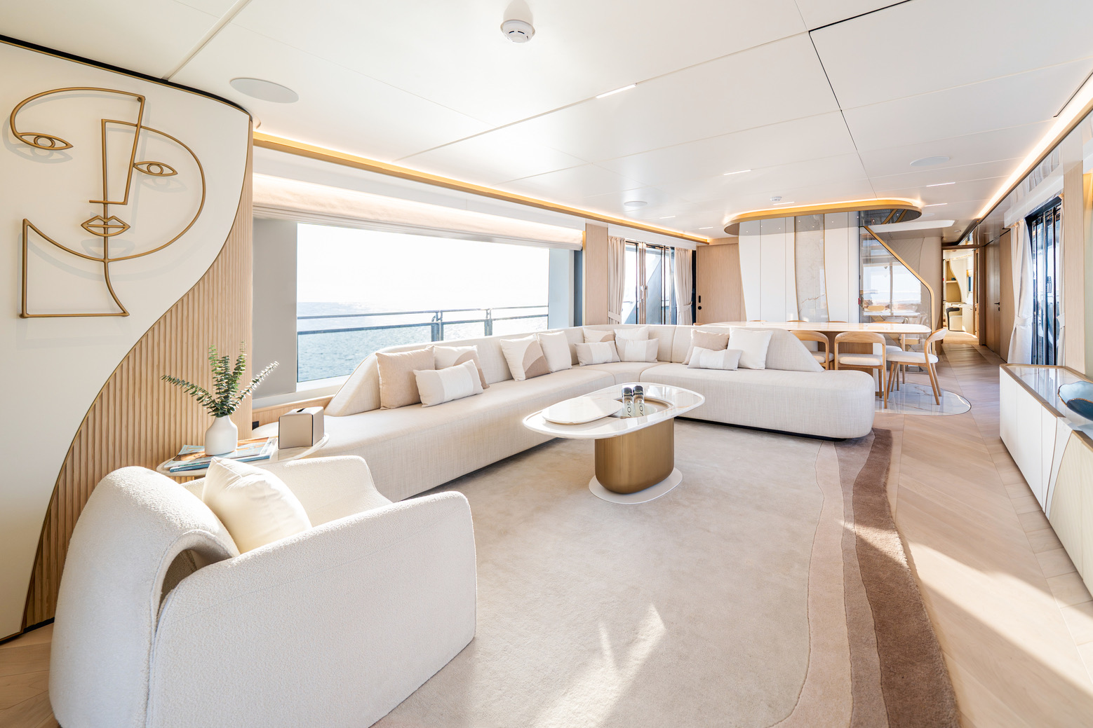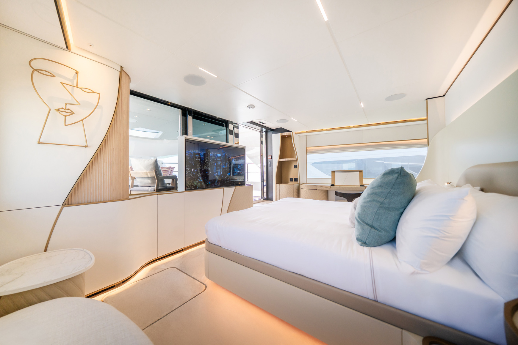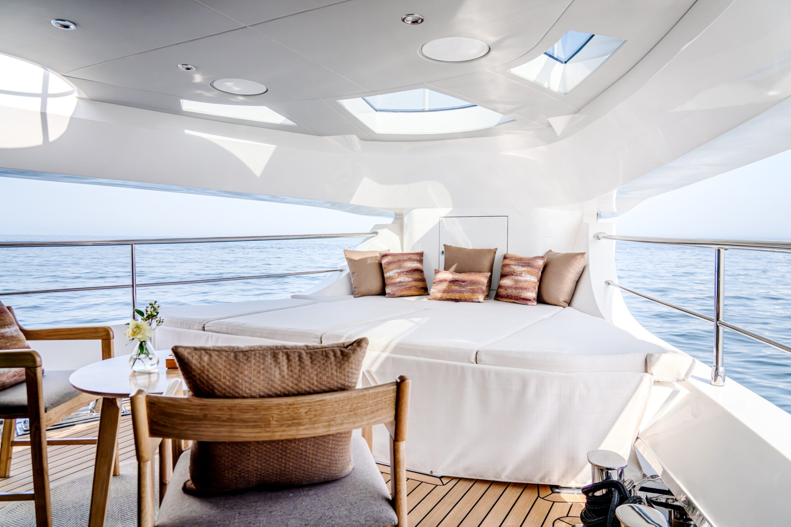 One of the Majesty 100 Terrace’s most distinctive features is the private owner’s suite terrace at the bow, offering an exclusive outdoor retreat with uninterrupted views. The yacht’s design emphasizes a harmonious indoor- outdoor experience, with floor-to-ceiling patio doors and expansive deck spaces that invite natural light and fresh sea breezes.