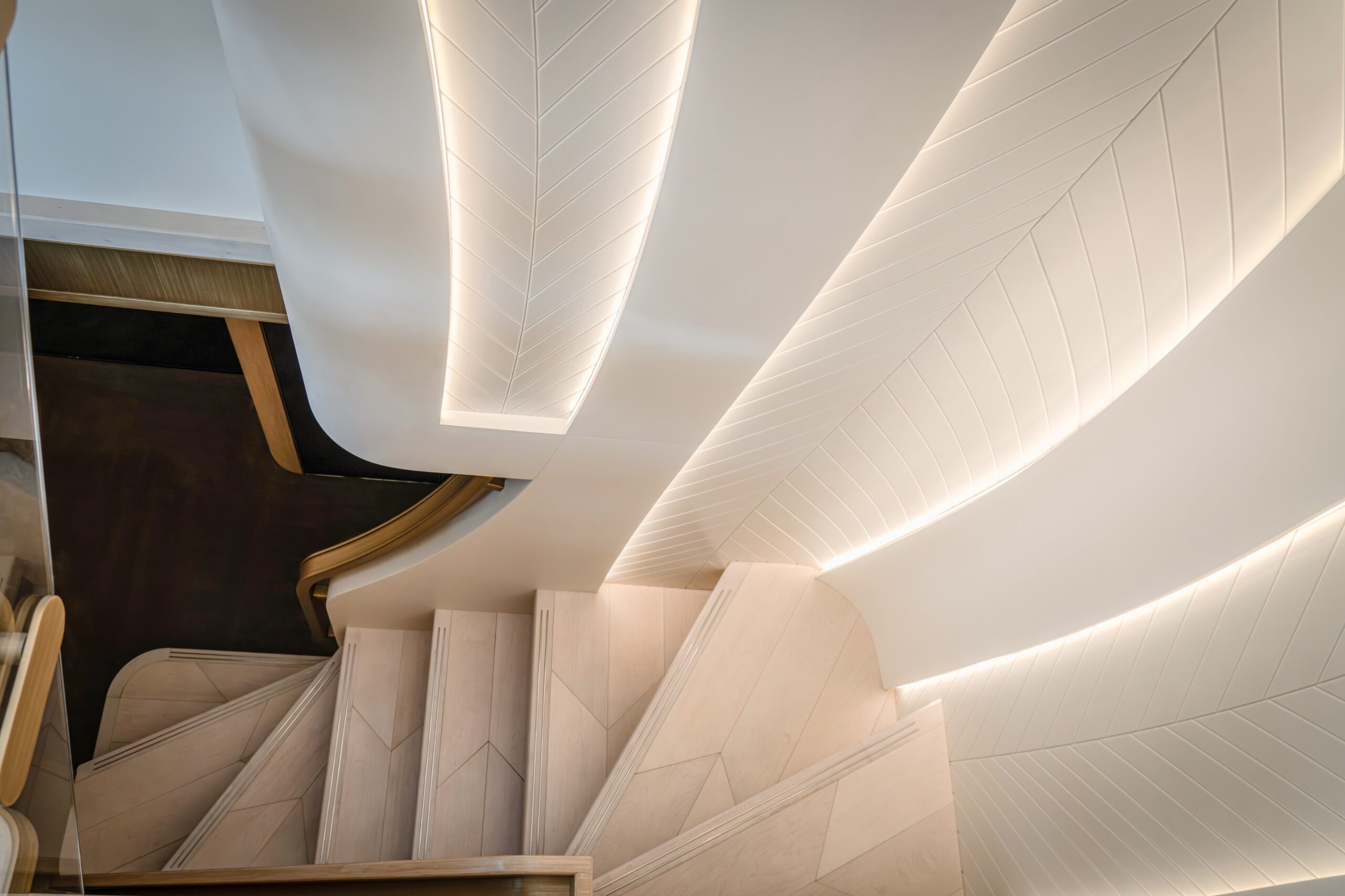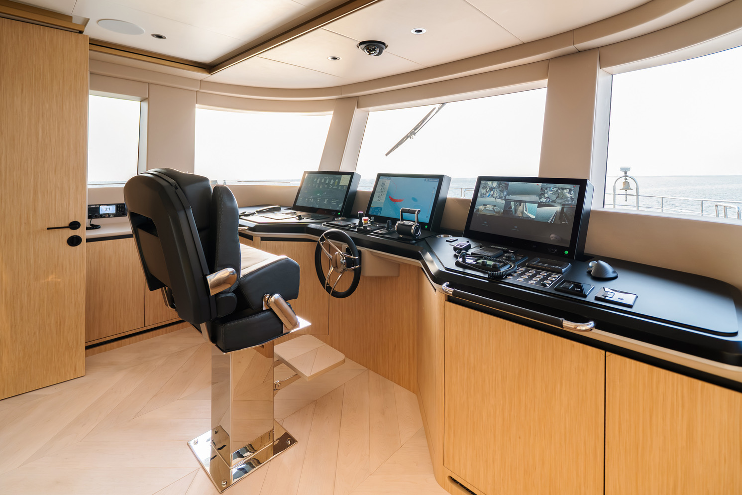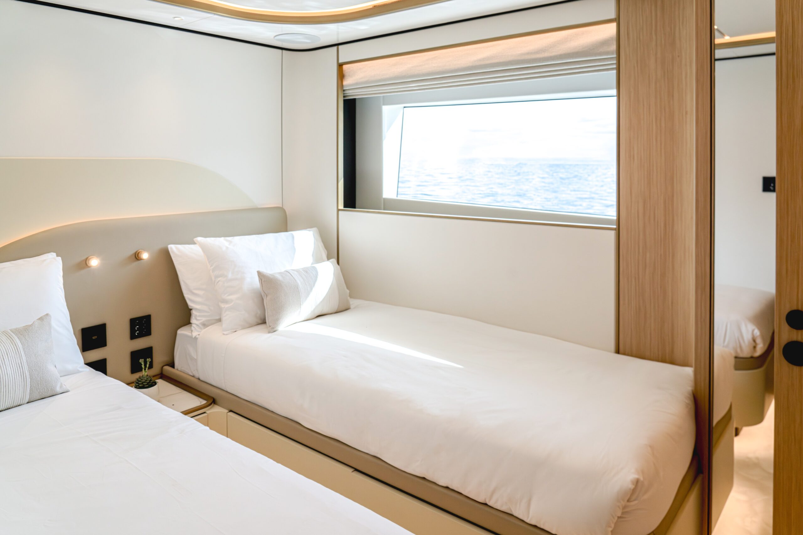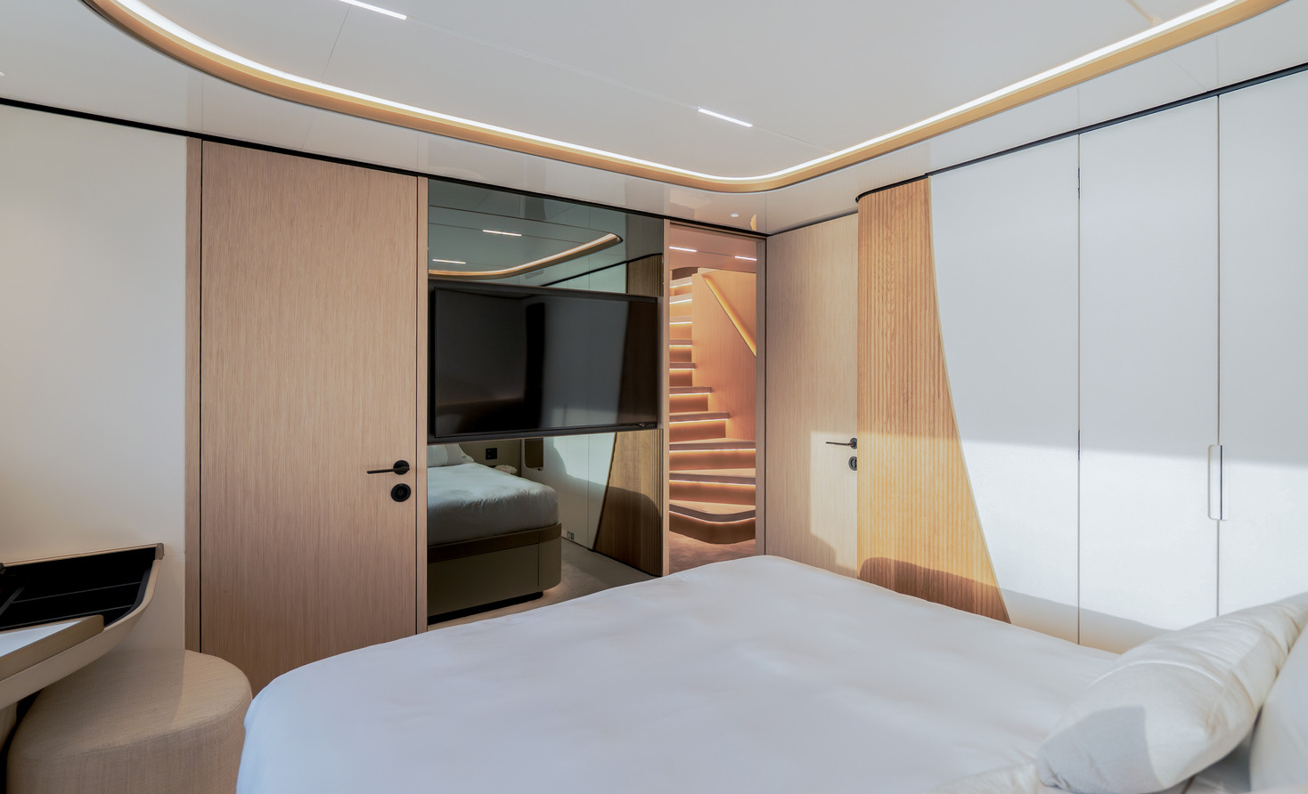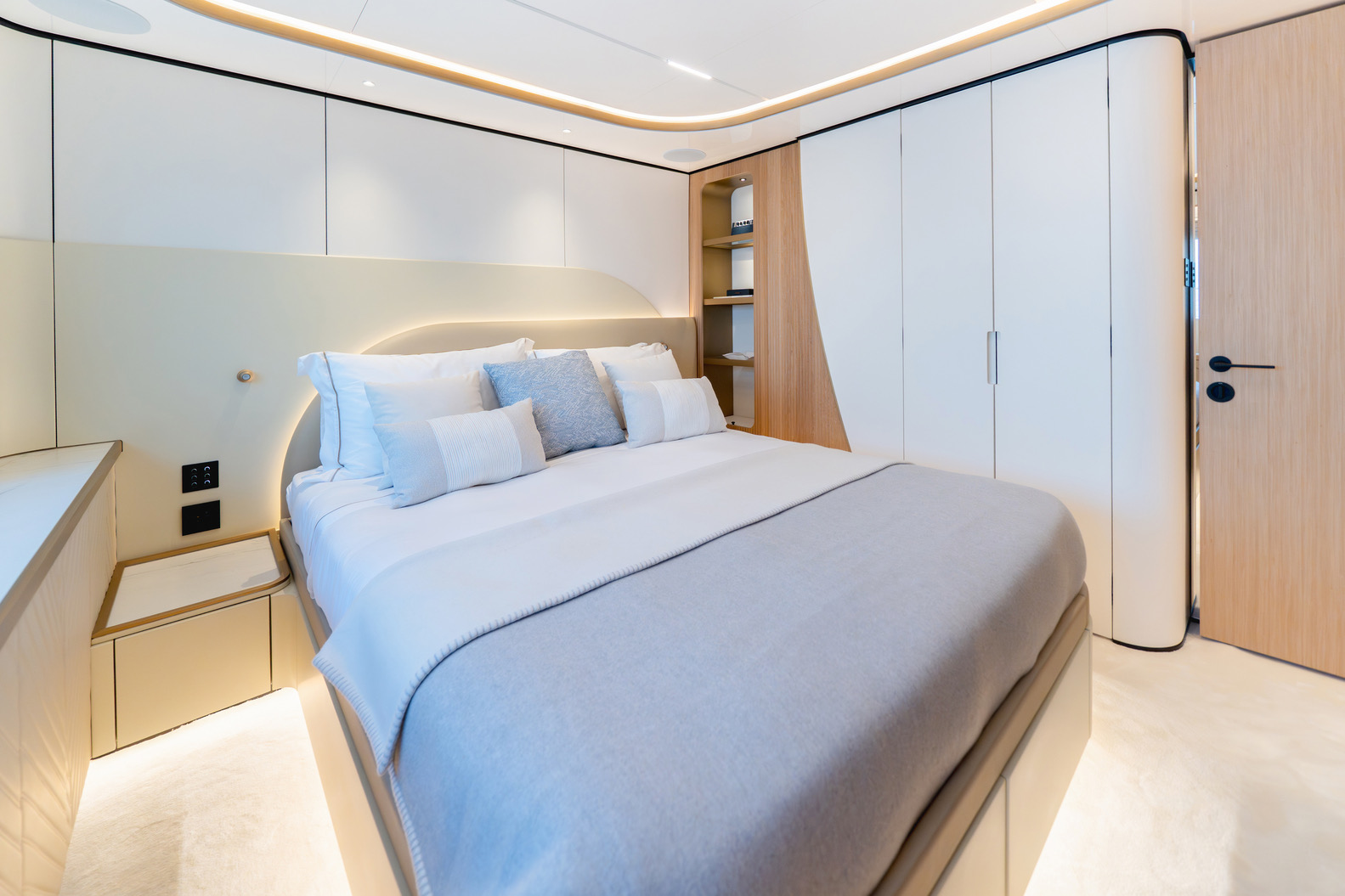 One of the Majesty 100 Terrace’s most distinctive features is the private owner’s suite terrace at the bow, offering an exclusive outdoor retreat with uninterrupted views. The yacht’s design emphasizes a harmonious indoor- outdoor experience, with floor-to-ceiling patio doors and expansive deck spaces that invite natural light and fresh sea breezes.