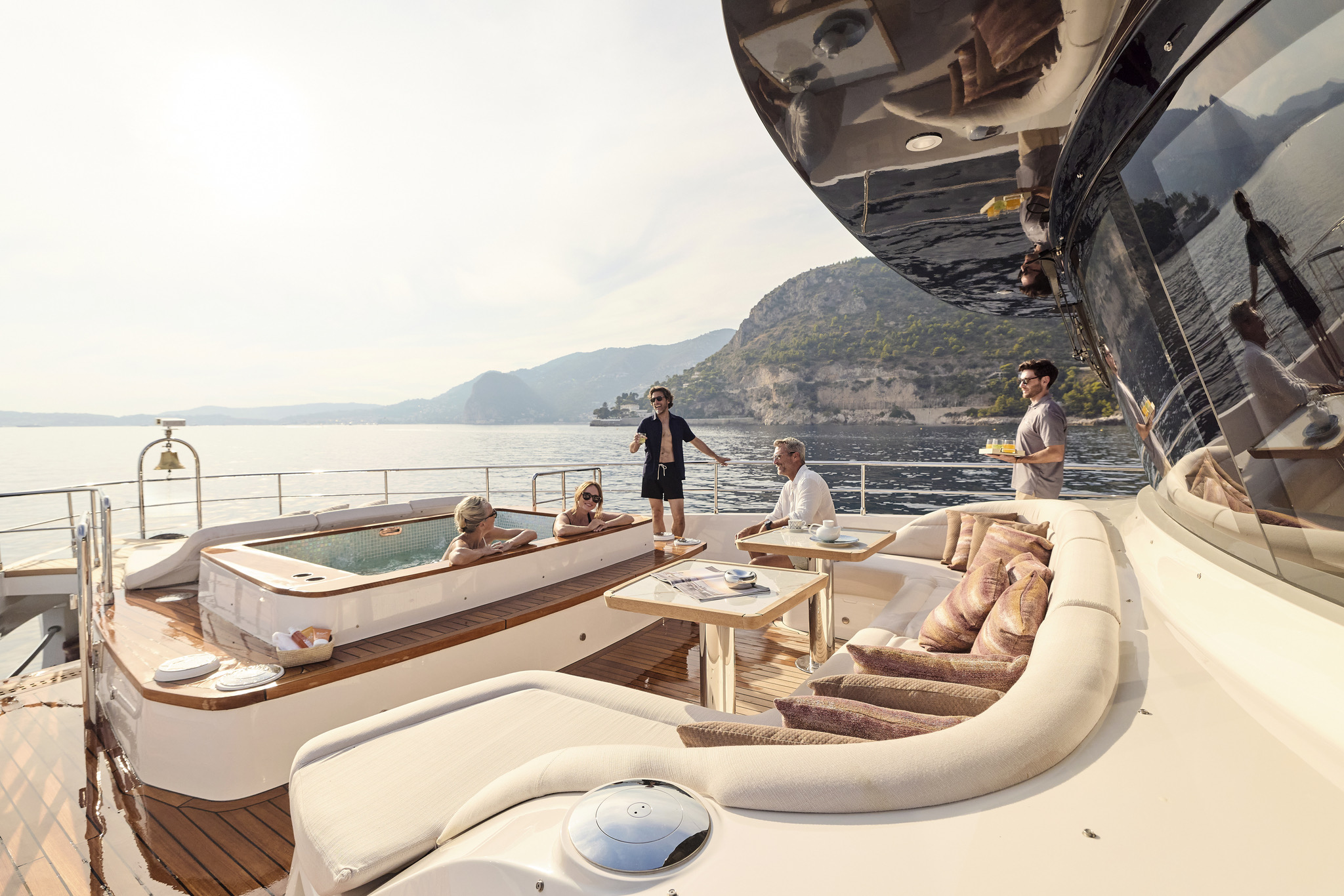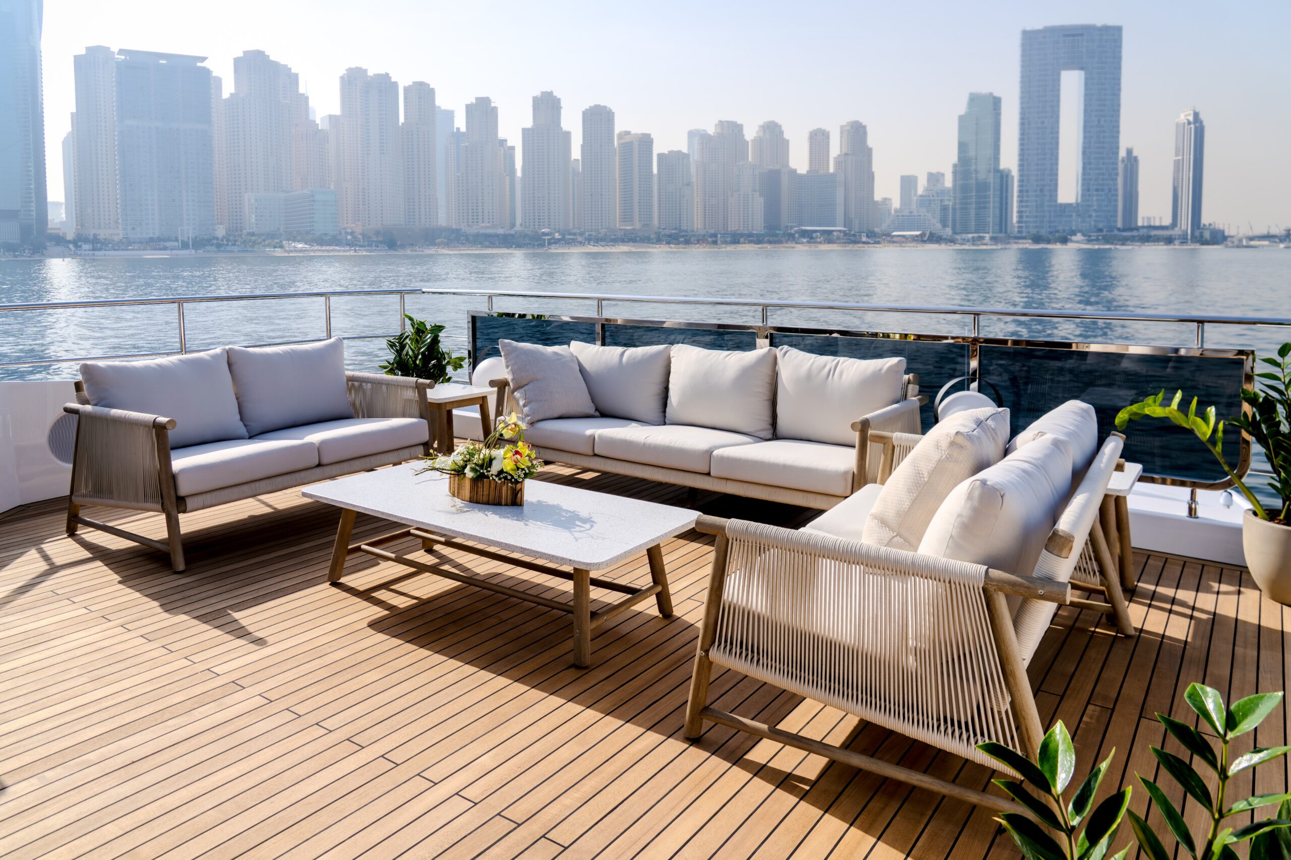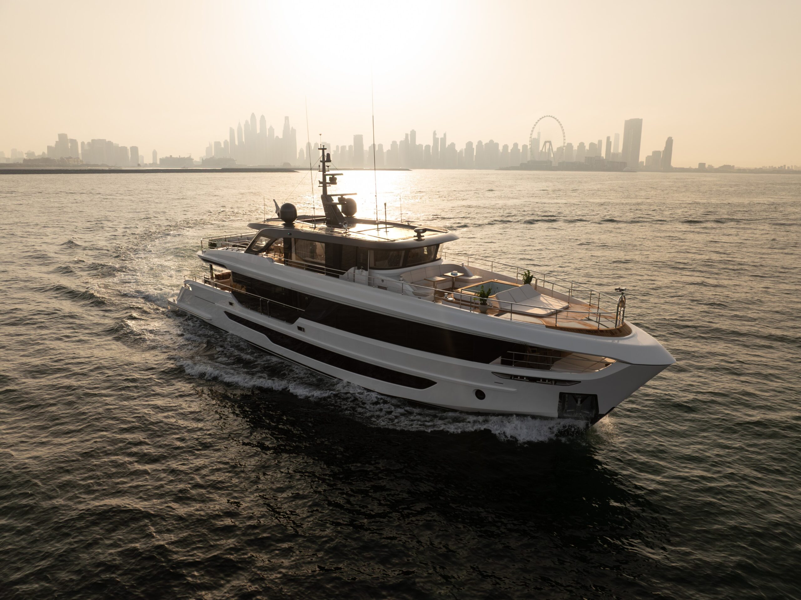 Crafted for both private cruising and charter, the Majesty 100 Terrace boasts a remarkable 20% increase in entertainment areas, making it an ideal setting for social gatherings. The upper deck features a sophisticated sky lounge and wheelhouse, while the sundeck is designed for ultimate relaxation, complete with skylights, a Jacuzzi, sunbeds, and alfresco dining options.
