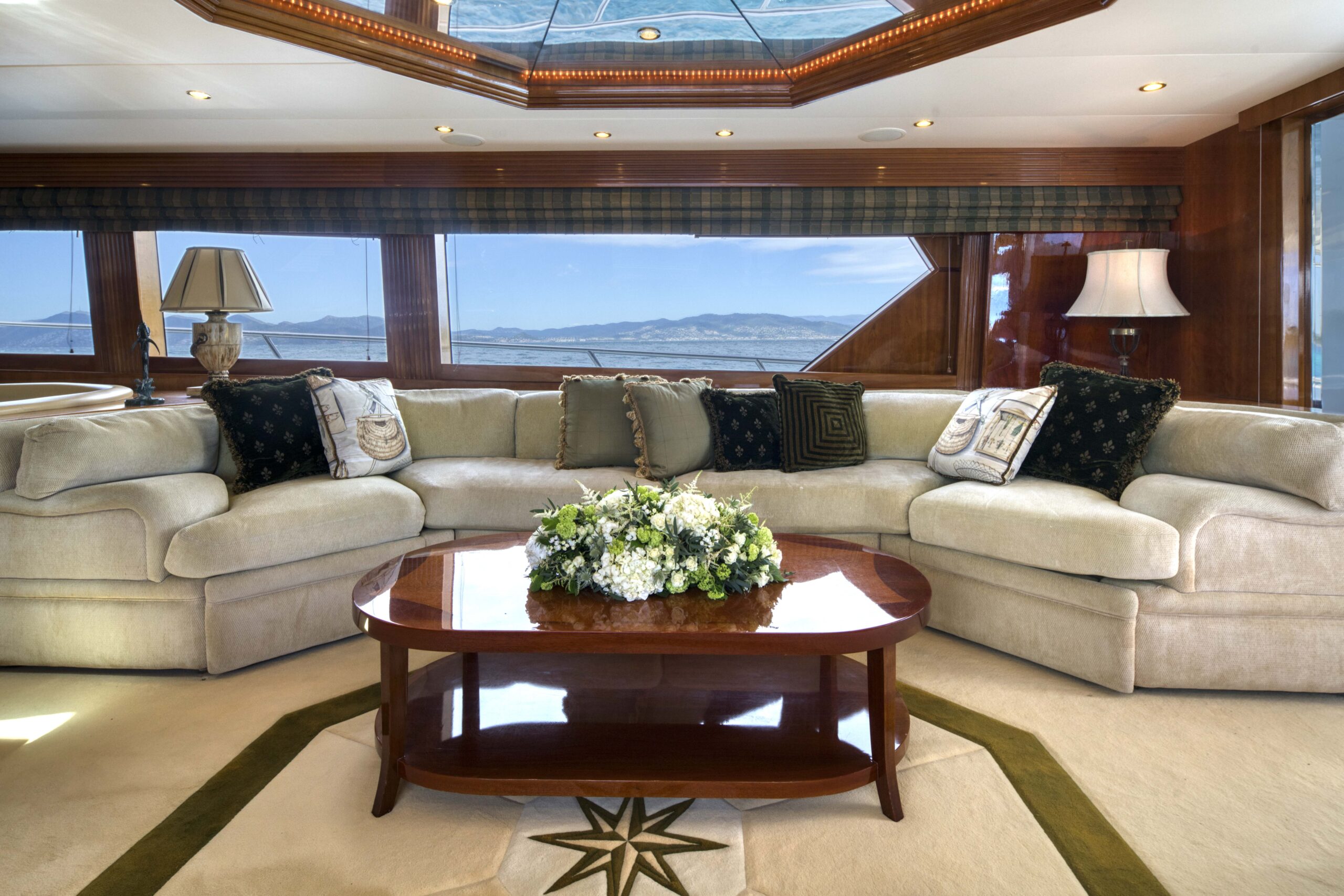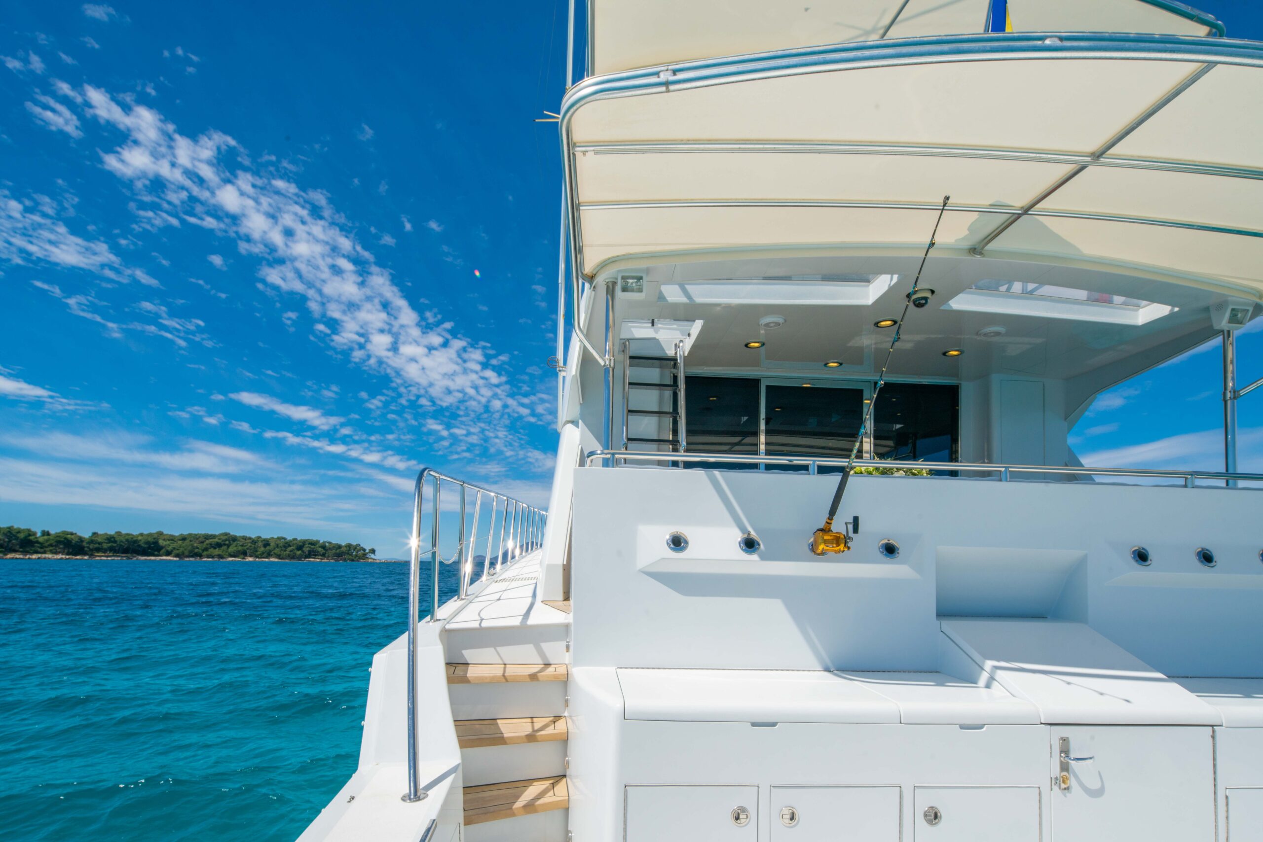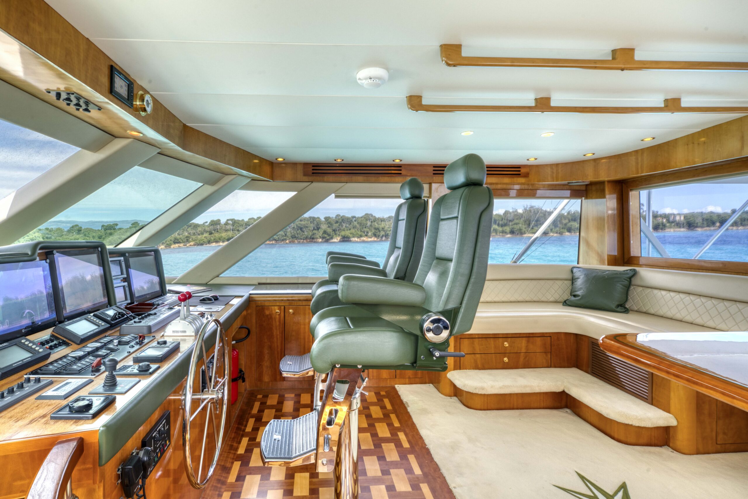 Powered by MTU 16V-2000’s with only 2700 original hours, she cruises comfortably at 18 knots with 24 knot top speed, and her 19000 Liters fuel capacity provides for extended range. Her highly customized high-gloss cherry interior features a four-stateroom layout to include king size master, queen VIP, and two twin staterooms all with ensuite heads. Two separate crew staterooms are located privately aft with access from the cockpit. Her main deck features a large salon with comfortable seating, wet bar and entertainment center, and forward is a gourmet galley with on deck head. In addition her aft deck is over sized with teak table allowing seating for eight. An interior spiral staircase leads from the salon to the enclosed bridge which features full electronics along with spacious seating and excellent visibility