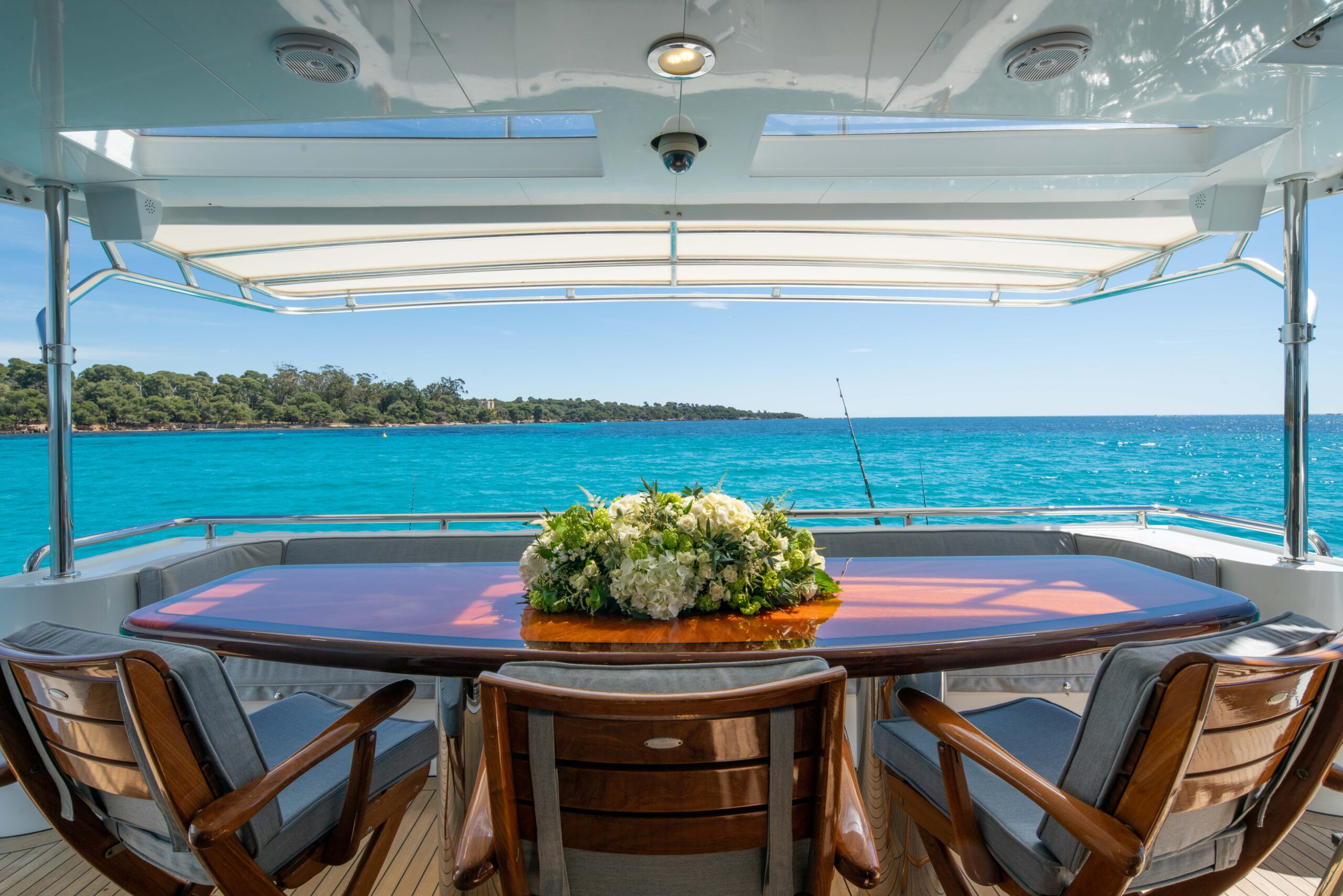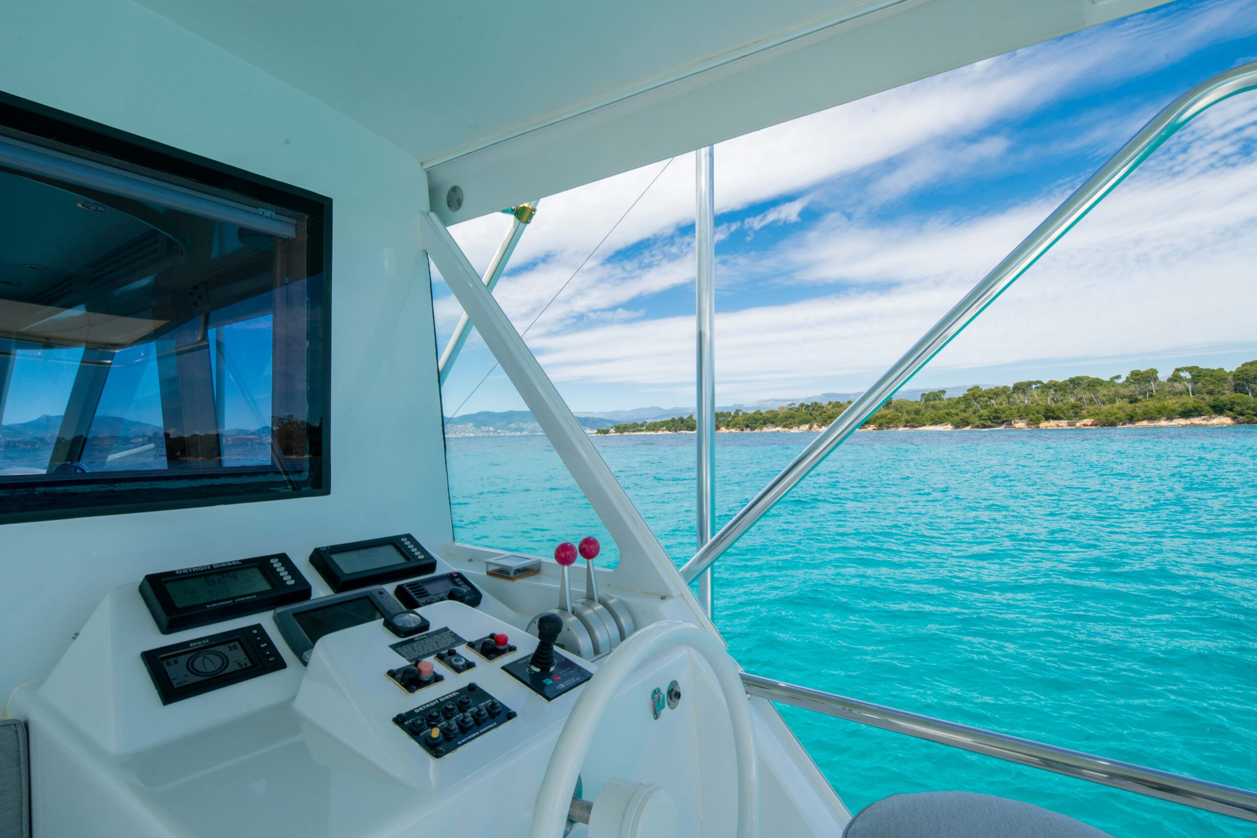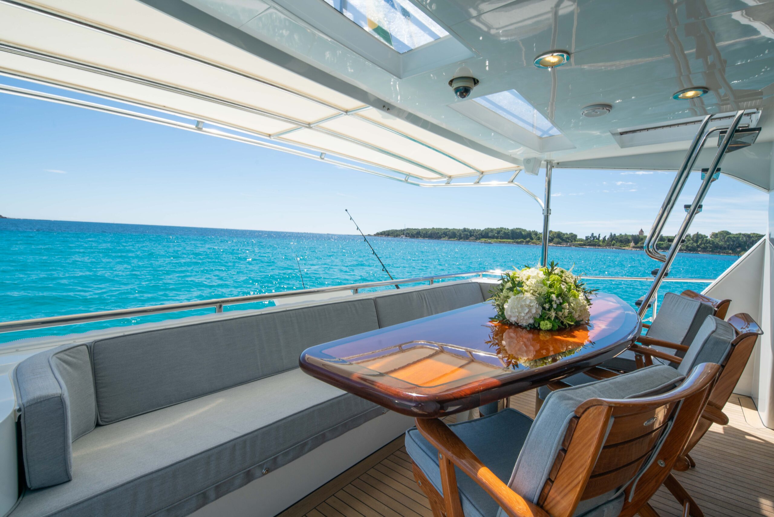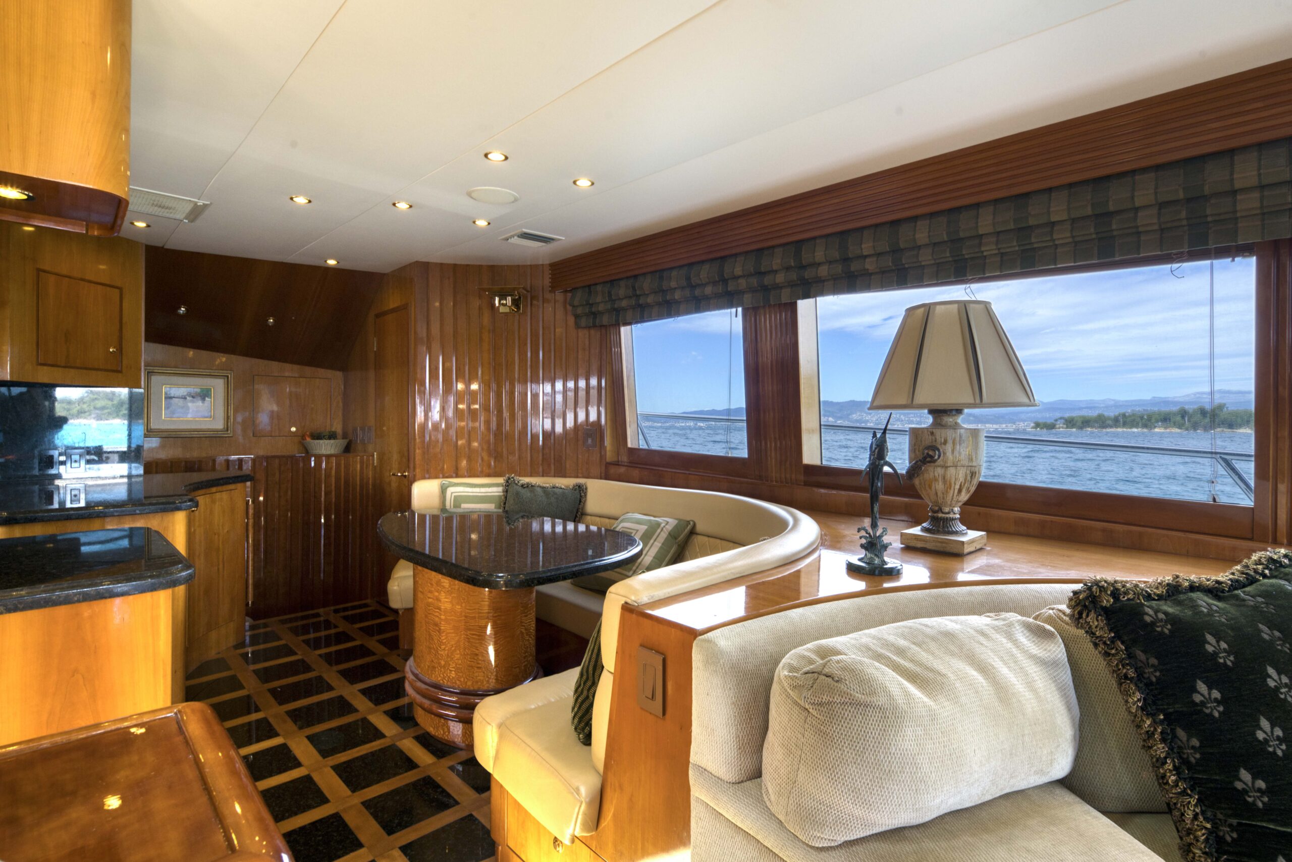 Powered by MTU 16V-2000’s with only 2700 original hours, she cruises comfortably at 18 knots with 24 knot top speed, and her 19000 Liters fuel capacity provides for extended range. Her highly customized high-gloss cherry interior features a four-stateroom layout to include king size master, queen VIP, and two twin staterooms all with ensuite heads. Two separate crew staterooms are located privately aft with access from the cockpit. Her main deck features a large salon with comfortable seating, wet bar and entertainment center, and forward is a gourmet galley with on deck head. In addition her aft deck is over sized with teak table allowing seating for eight. An interior spiral staircase leads from the salon to the enclosed bridge which features full electronics along with spacious seating and excellent visibility