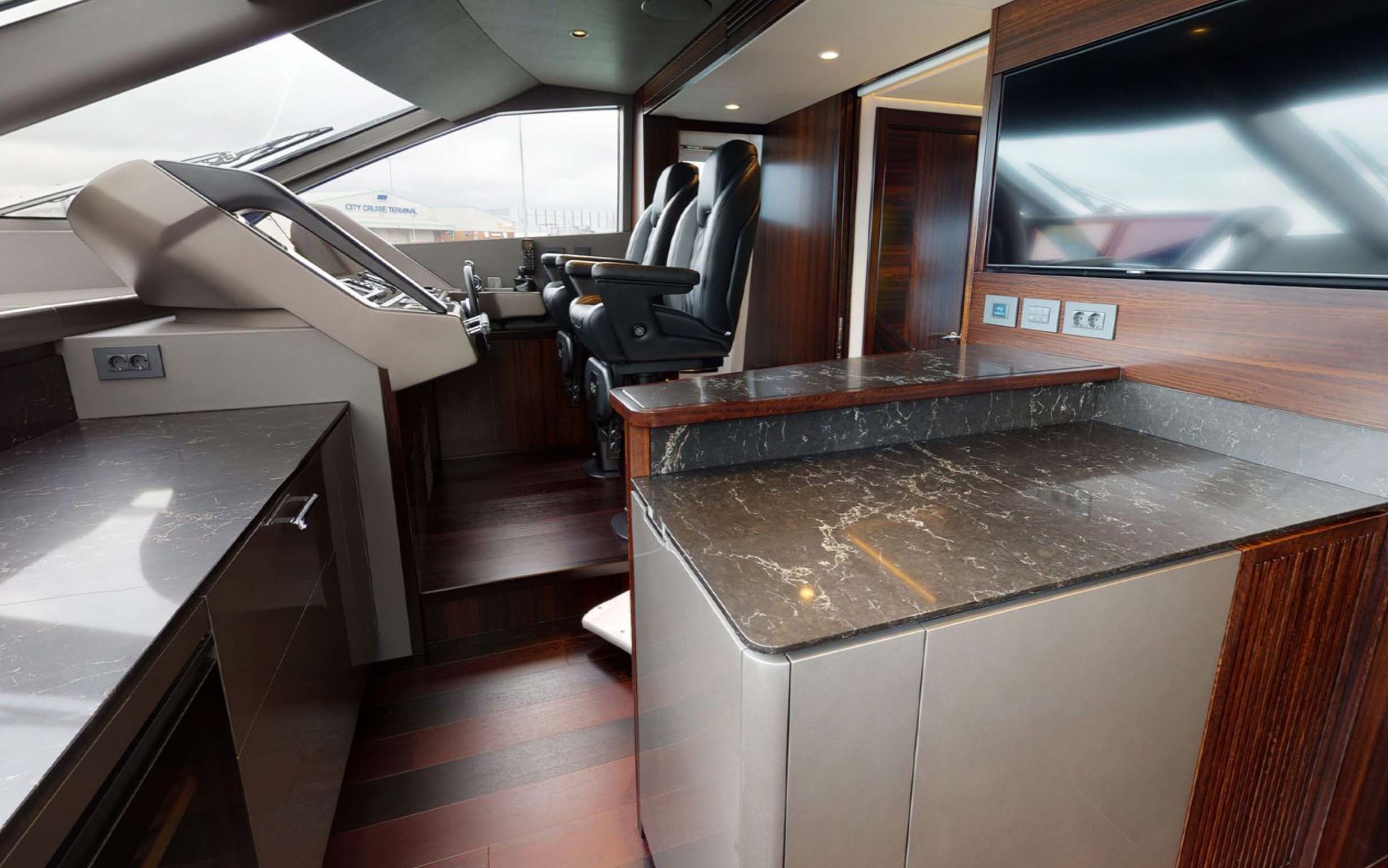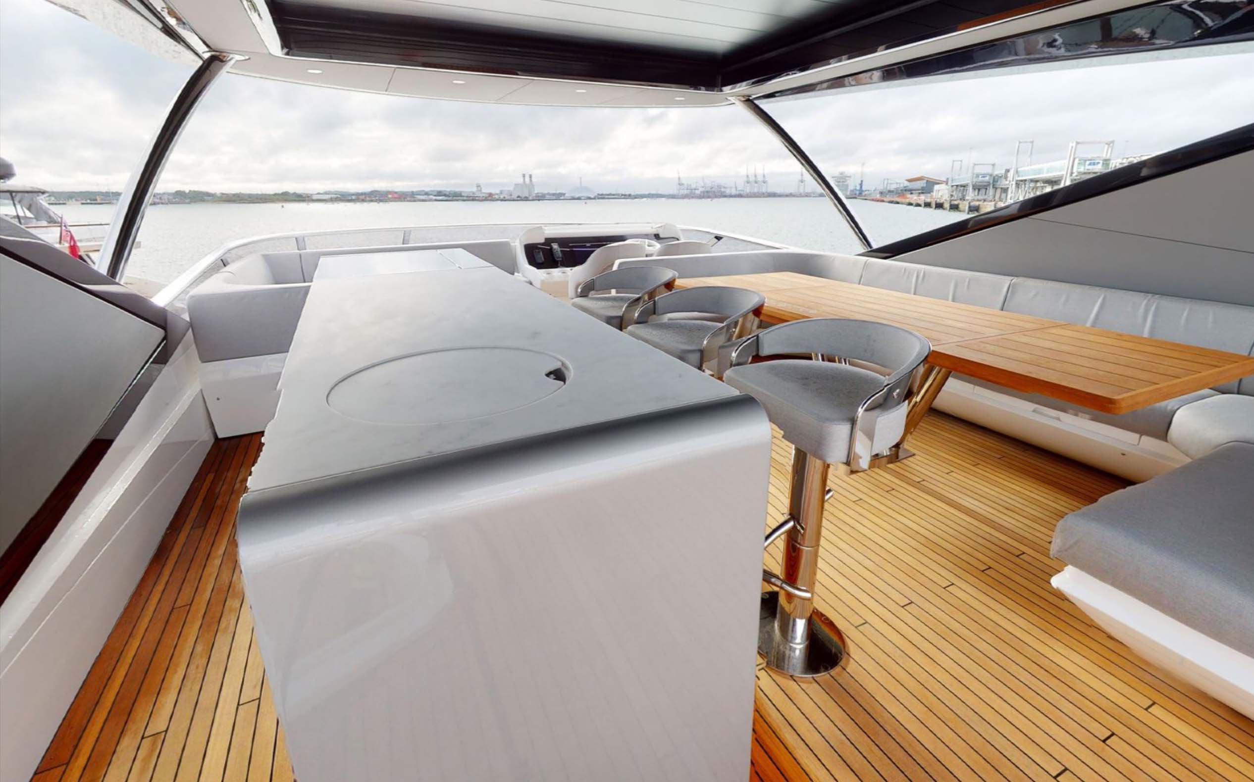 The main deck is nothing short of spectacular. Inside, there is a large forward galley helping to maximize the open-plan entertaining space. It gives owners and crew an amazing amount of practical storage space, as well as a dedicated fixed breakfast bar unit with two stools, creating an additional informal dining space.
