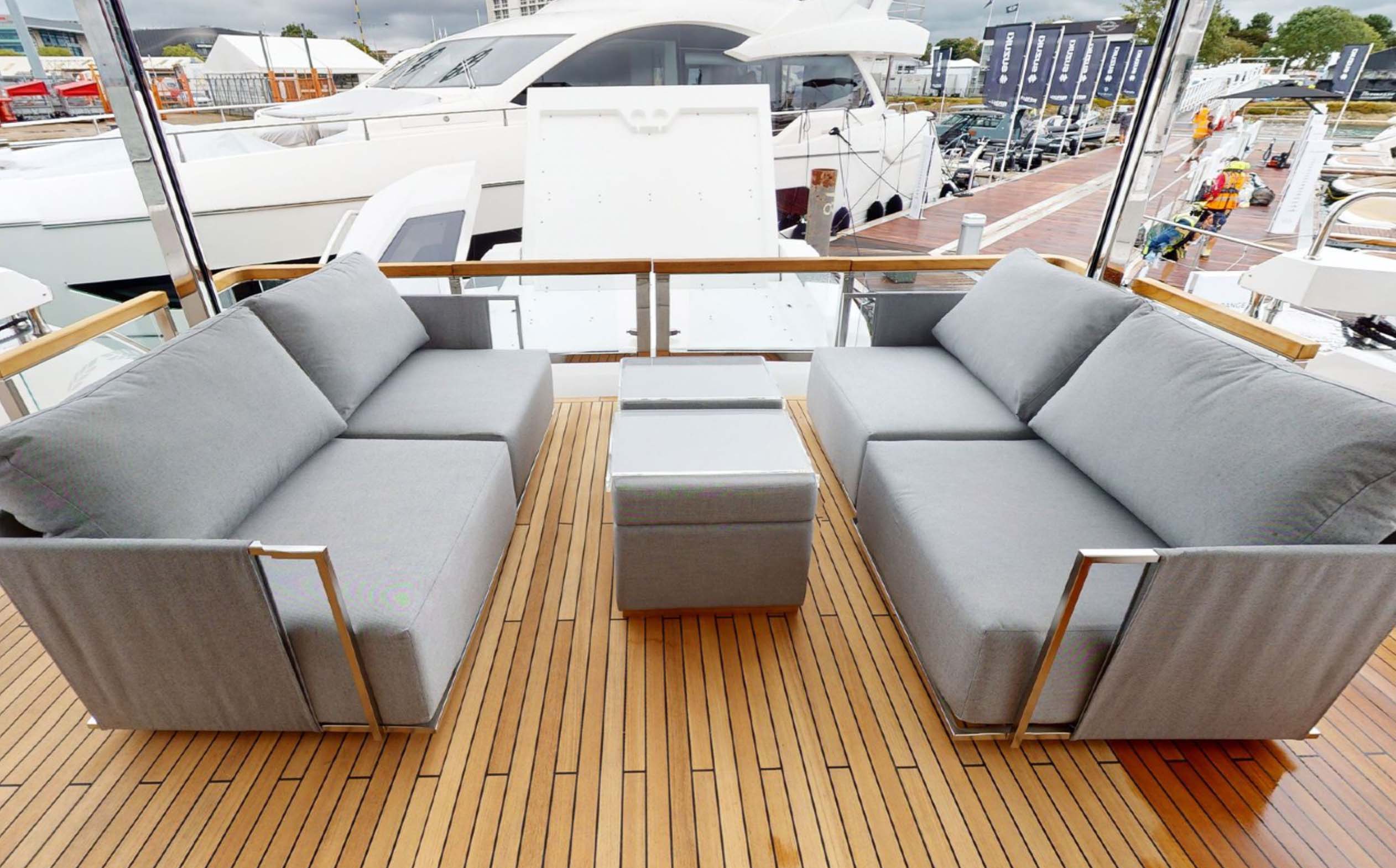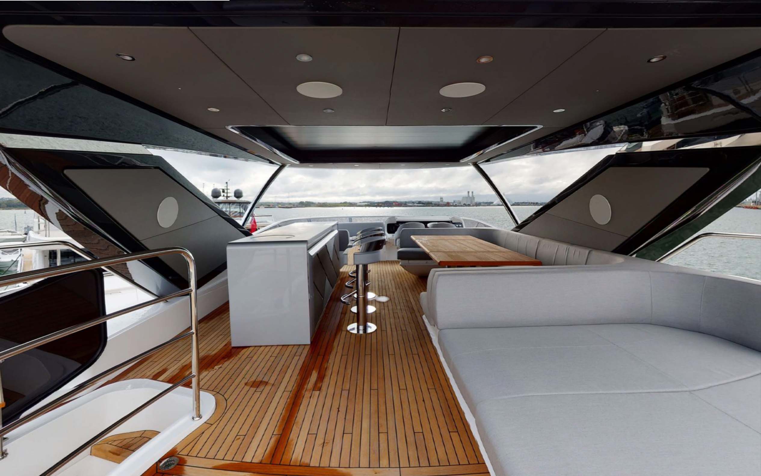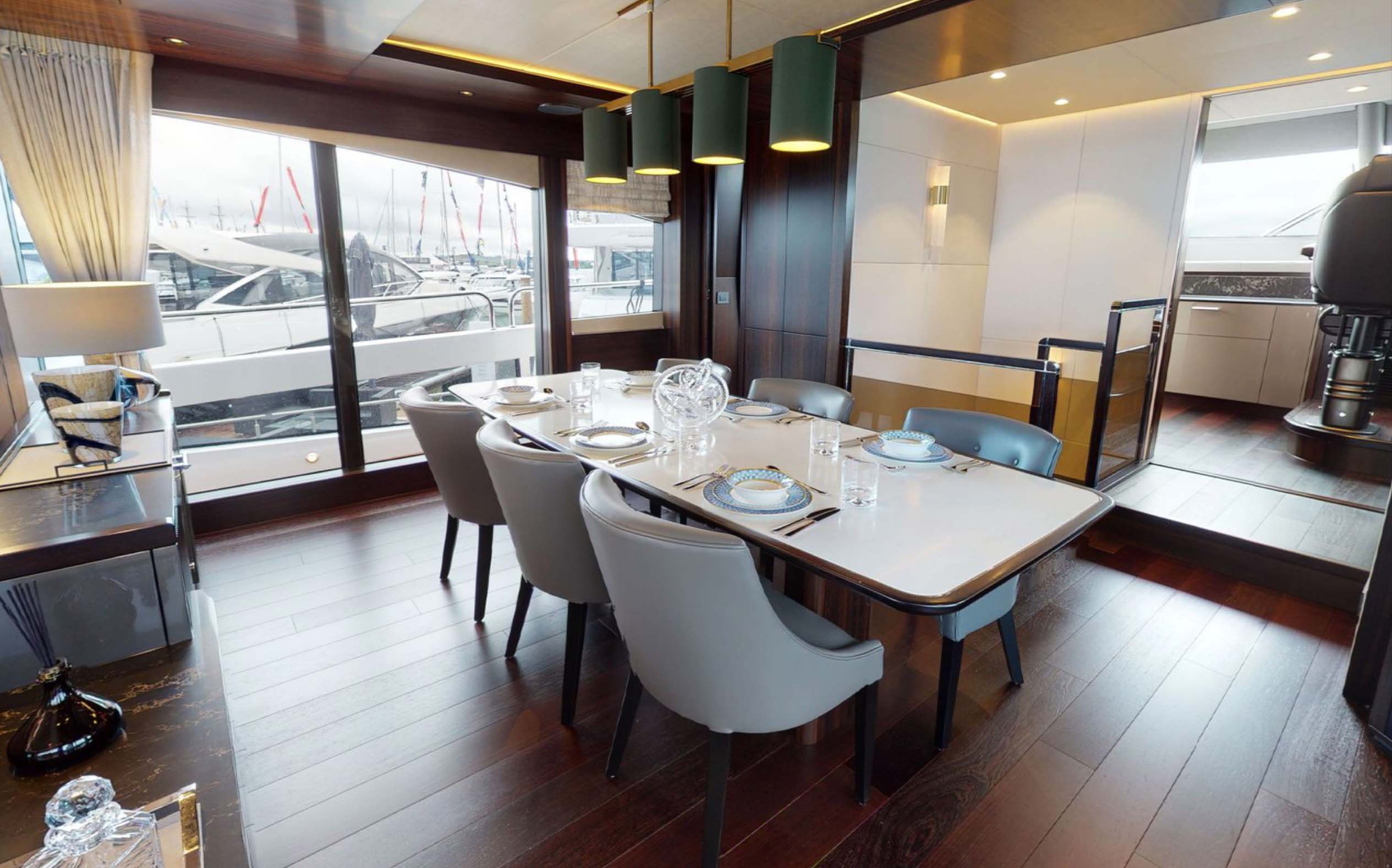 The 88 Yacht has impressive, and new to the brand, exterior lines and a sleek hardtop roof.