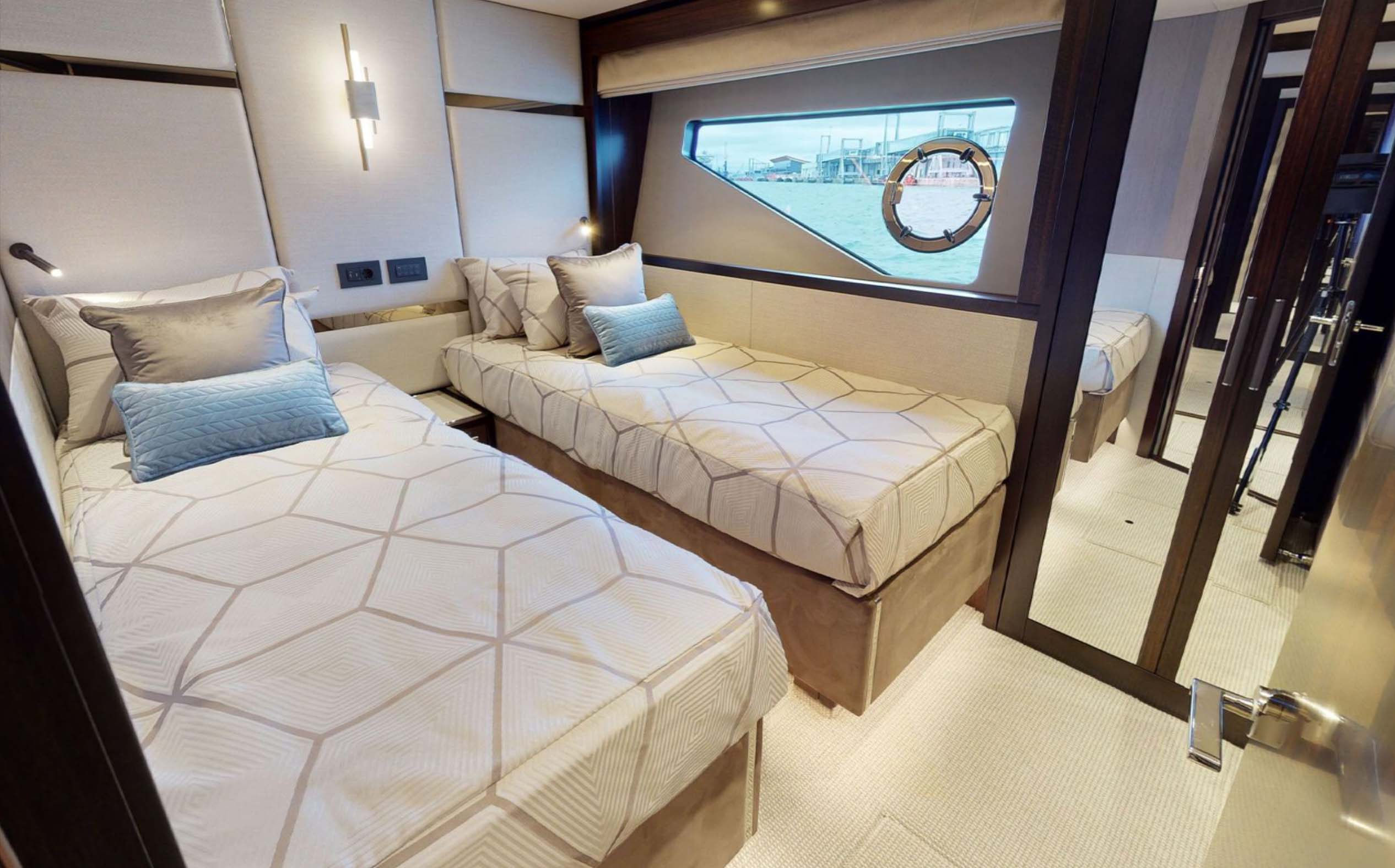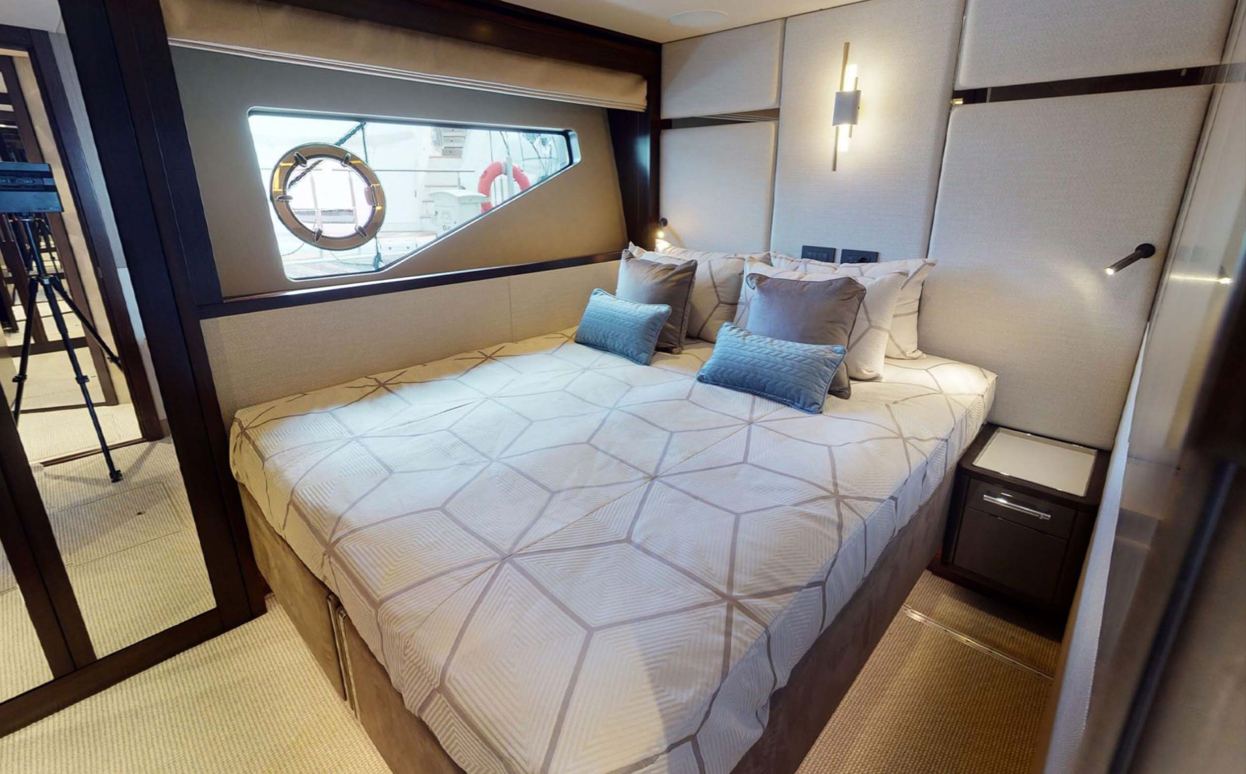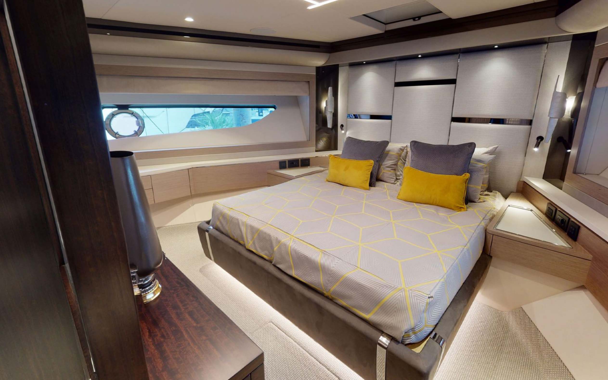 This 88 Yacht has a 4 Cabin Layout for 8 guests, comprised of a spacious Master cabin, VIP cabin and a further two guest cabins, one double and one twin.