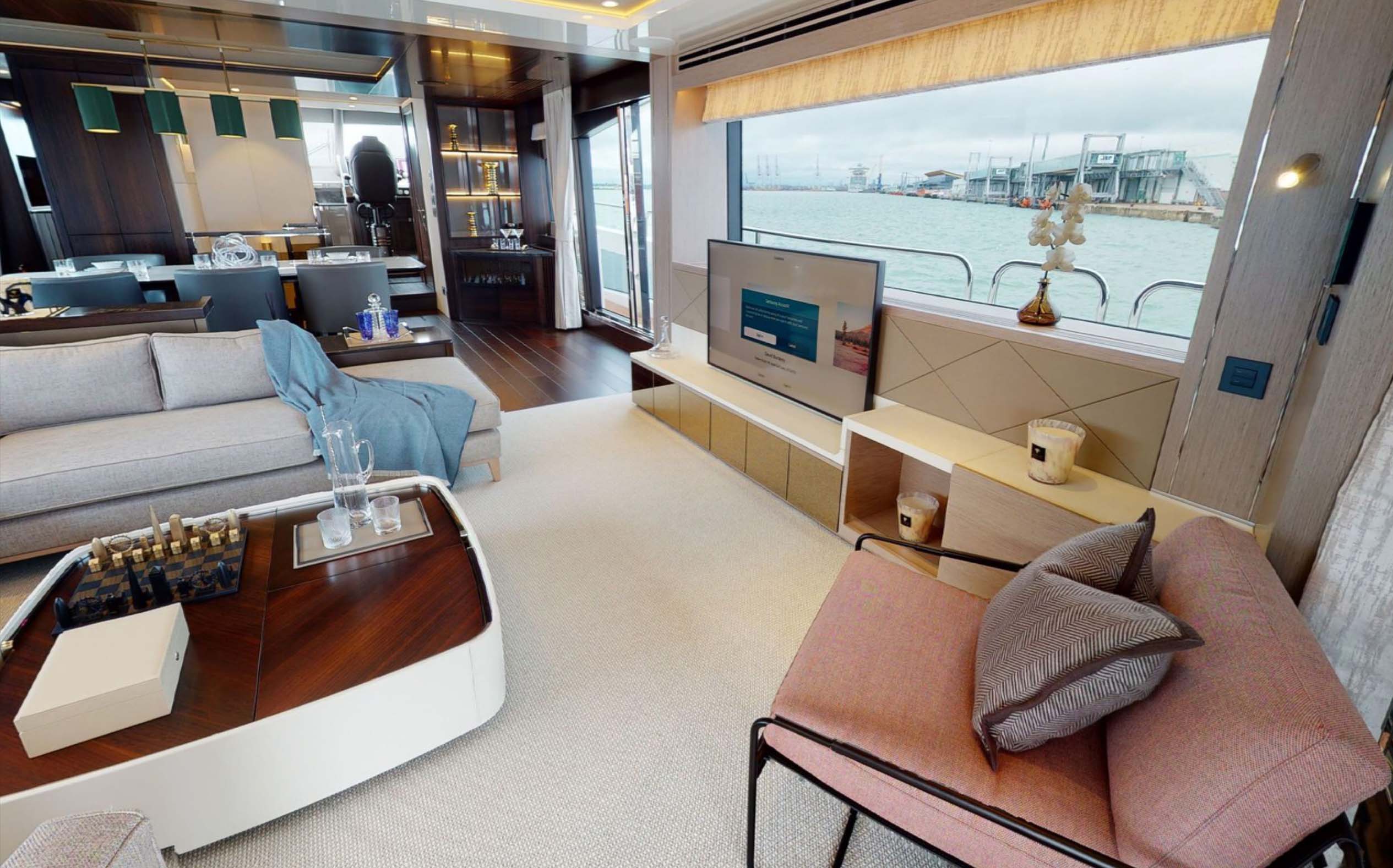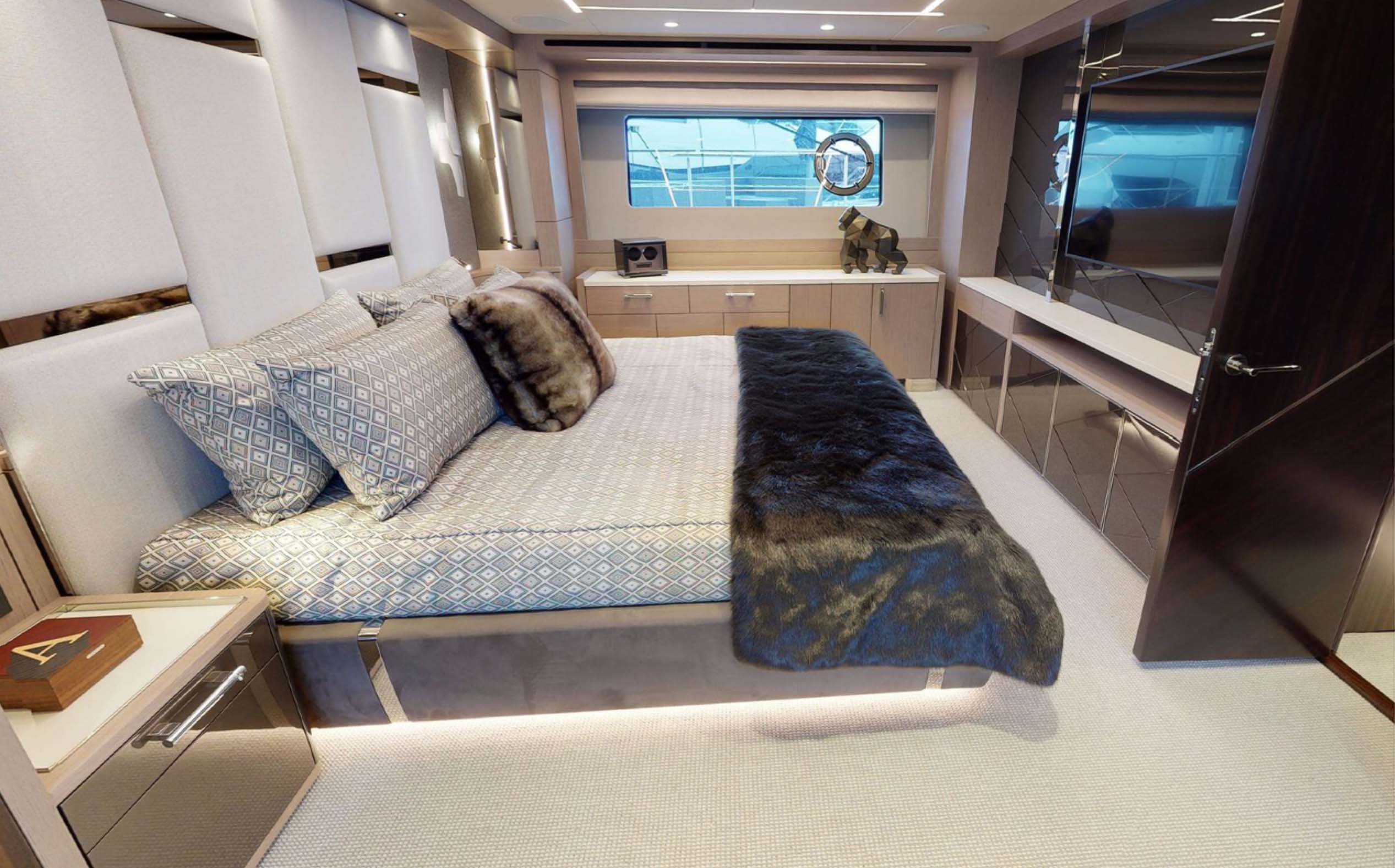 The interior has a real feeling of opulence and clever design cues throughout that really make the yacht stand out, including diagonal stainless detailing on cabinetry and doors. The layering of textural elements and the mix of furnishings and fabrics feels timeless with a modern twist that oozes style and elegance.