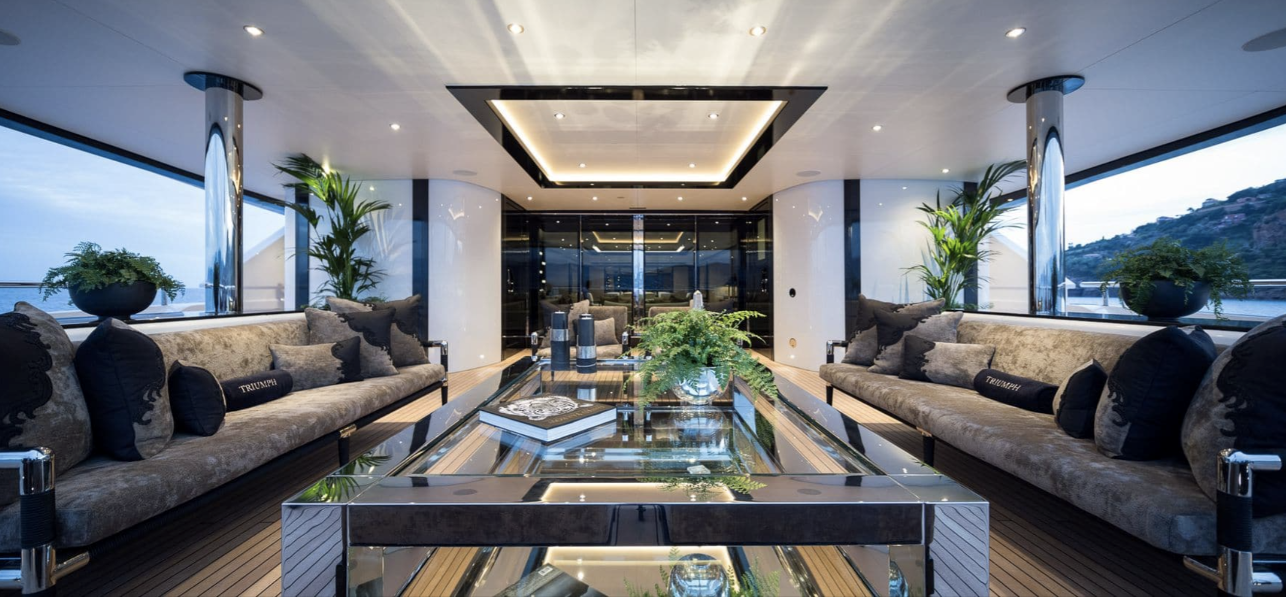 M/Y “Triumph”, a 65.40 meters full custom yacht with sleek and clean lines spanning her six decks. The steel displacement hull and the superstructure, made with aluminum, are painted in a classic white. The external lines were penned by Giorgio M. Cassetta, complementing the naval architecture by Benetti. Green & Mingarelli Design contributed to the interiors, adding to the work done in-house by Benetti. The yacht, which accommodates twelve people in six double cabins, offers a host of luxurious amenities, including a touch and go helipad located on the bow, sauna, fully equipped gym, massage room, jacuzzi and 70 square metres of beach club with a drop-down platform. The aggressive streamlined exteriors were designed by Giorgio M. Cassetta notably using large curved windows to balance the yacht’s impressive presence. Green & Mingarelli Design arranged the elegant interiors and many furnishing details, closely following the direction of the Benetti Interior Style Department. All the artwork onboard is created by renowned British photographer David Yarrow.