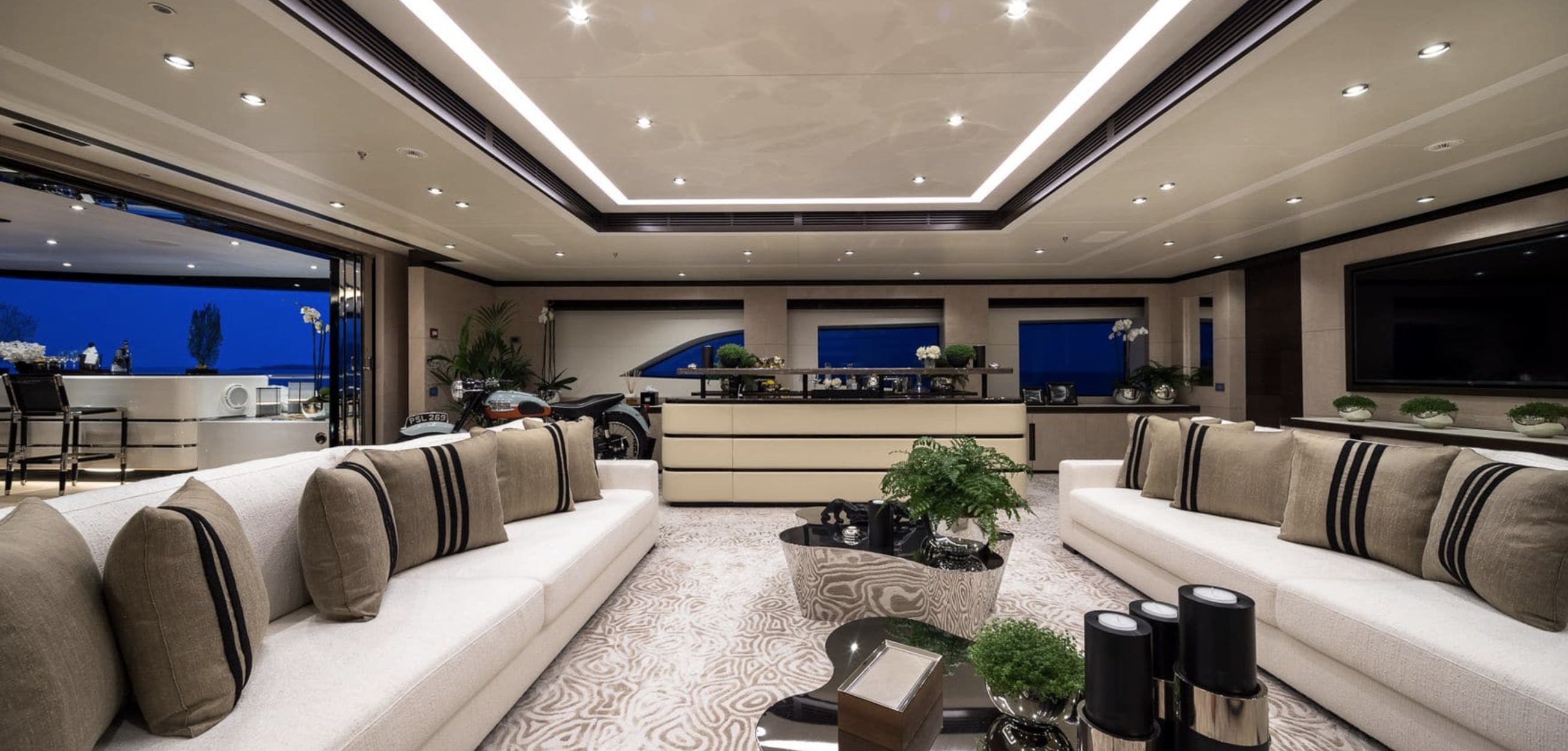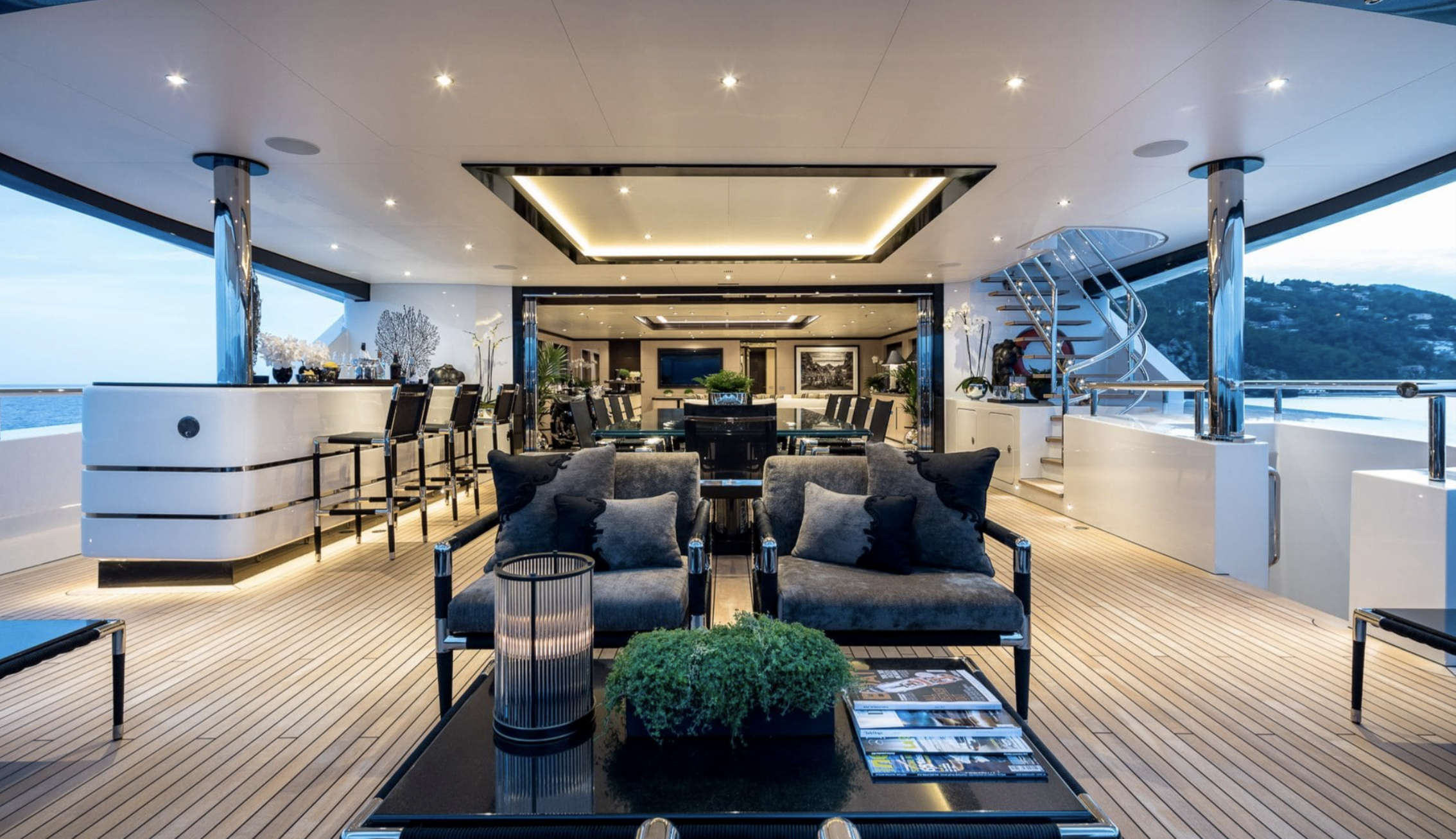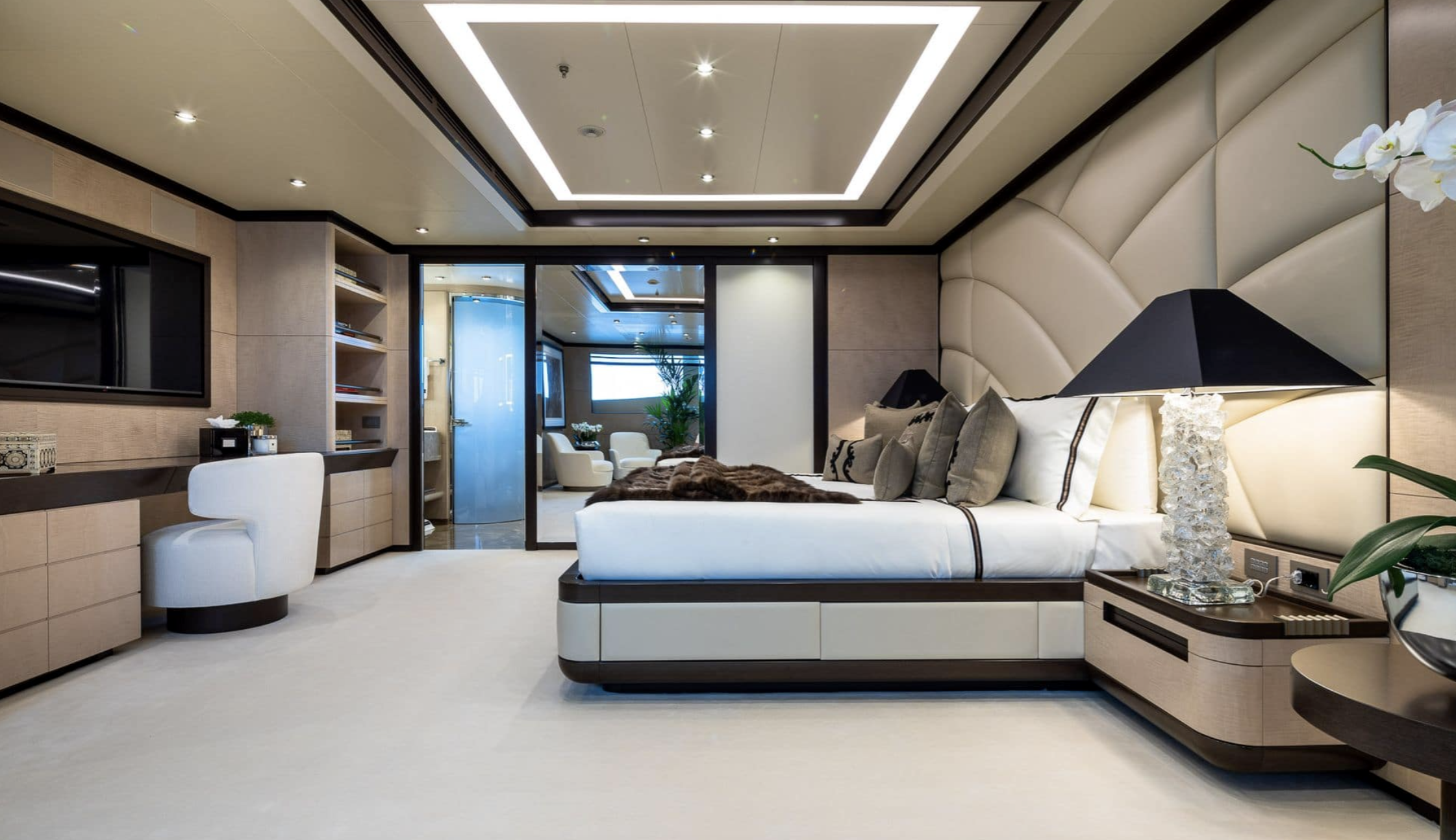 The Sun Deck sits at the top the yacht on the sixth deck, not always present on yachts of this size. The high-perch features an elegant jacuzzi, comfortable seating and a table for Six that can be used even while navigating, thanks to ample wind sheltering. The sky lounge on the Upper Deck blends seemlessly with the welcoming aft outdoor spaces, outfitted with Indian Ocean custom furniture. The owner’s apartment, set over a sprawling 130 square meter area, takes full advantage of the deck’s spaciousness and stunning views.