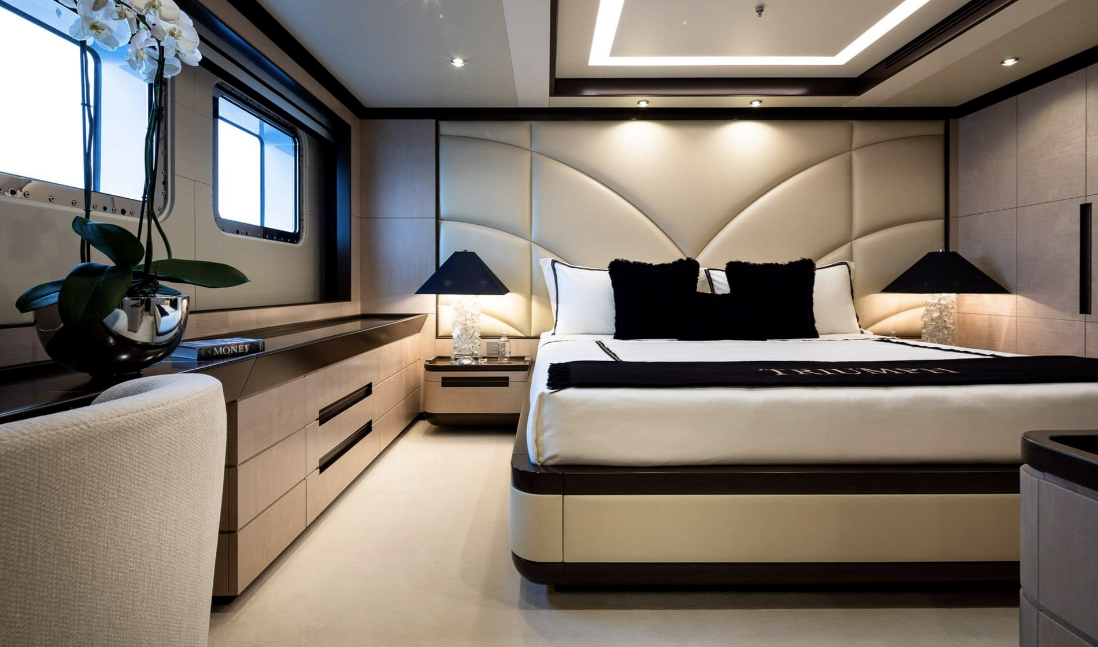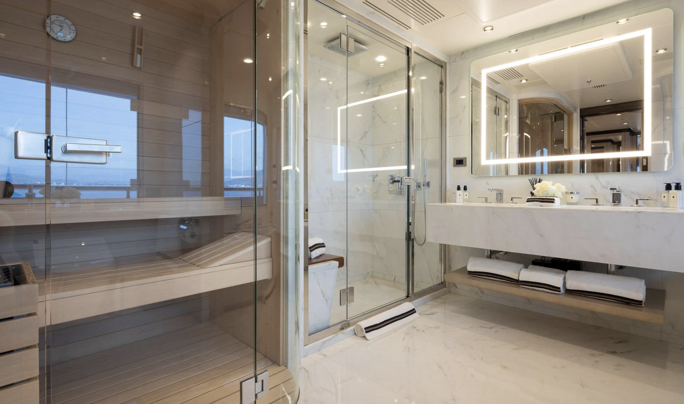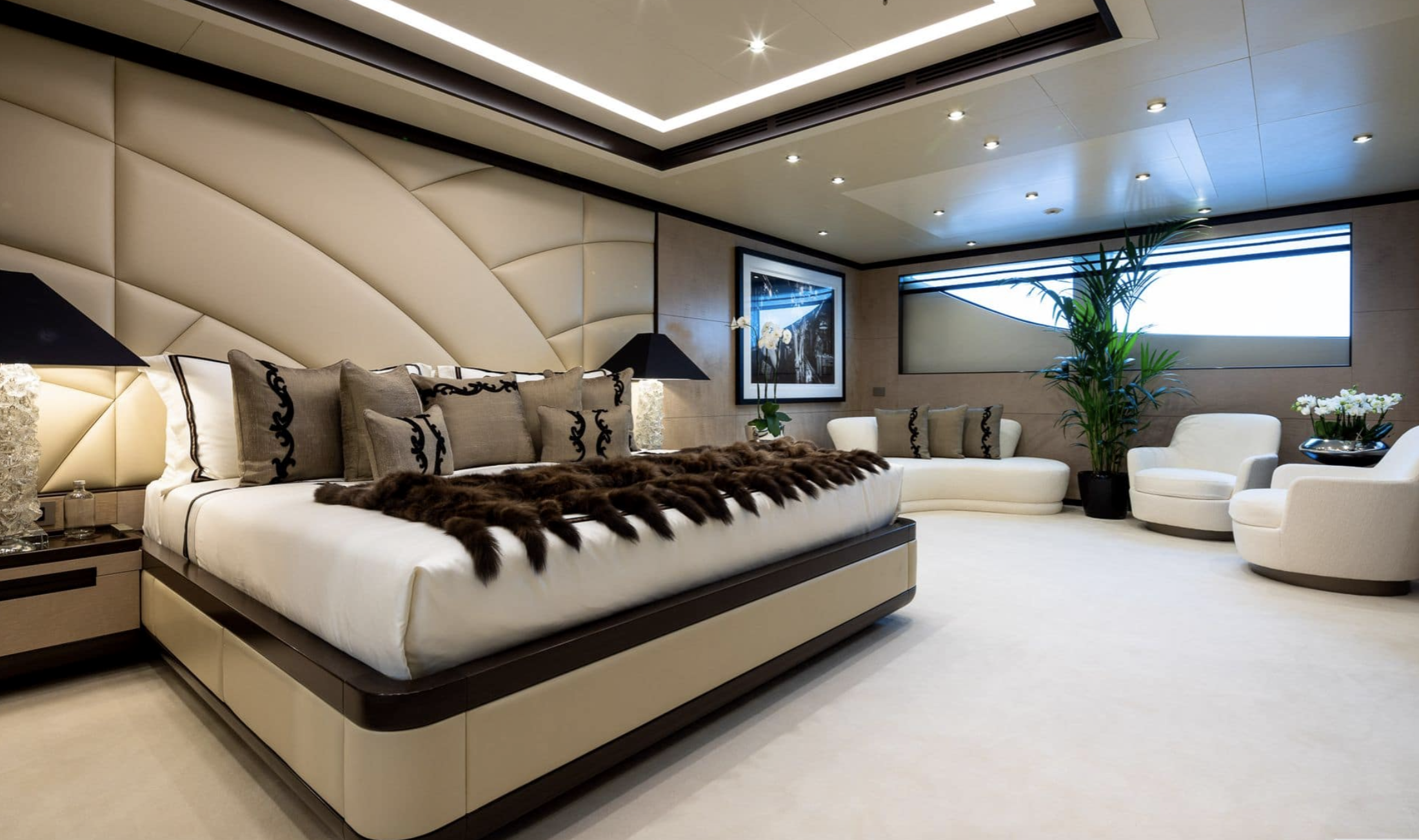 The Sun Deck sits at the top the yacht on the sixth deck, not always present on yachts of this size. The high-perch features an elegant jacuzzi, comfortable seating and a table for Six that can be used even while navigating, thanks to ample wind sheltering. The sky lounge on the Upper Deck blends seemlessly with the welcoming aft outdoor spaces, outfitted with Indian Ocean custom furniture. The owner’s apartment, set over a sprawling 130 square meter area, takes full advantage of the deck’s spaciousness and stunning views.