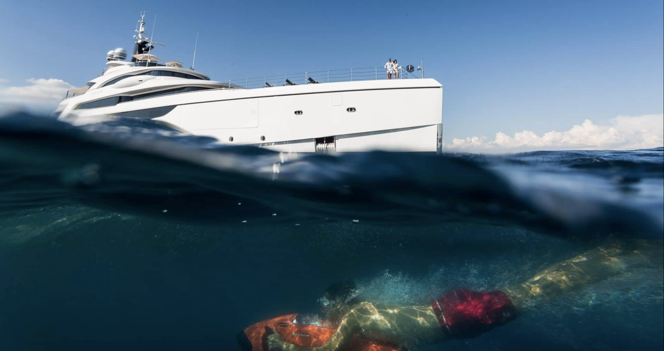 The beach area of the Lower Deck proposes an area of 70 square meters with immediate access to the sea. The sleeping area amidships includes four double cabins for an additional eight guests. Also on this deck, in a separate area to guarantee guest privacy, is the modern galley, and at the bow there are the accommodations for crew members.
