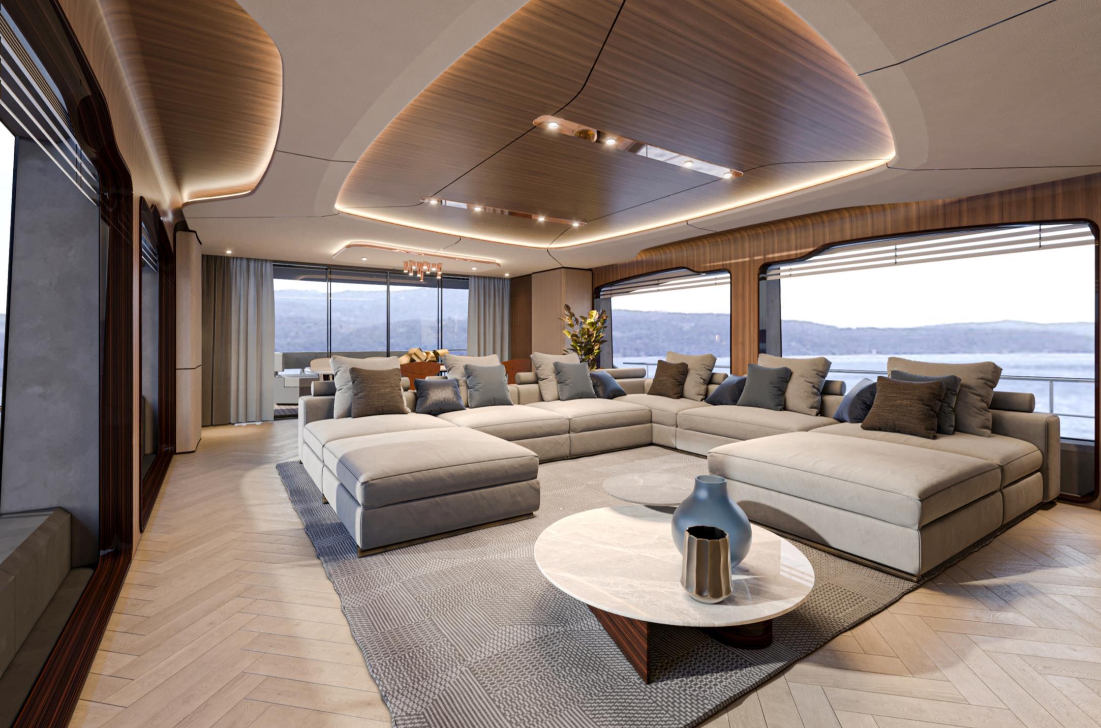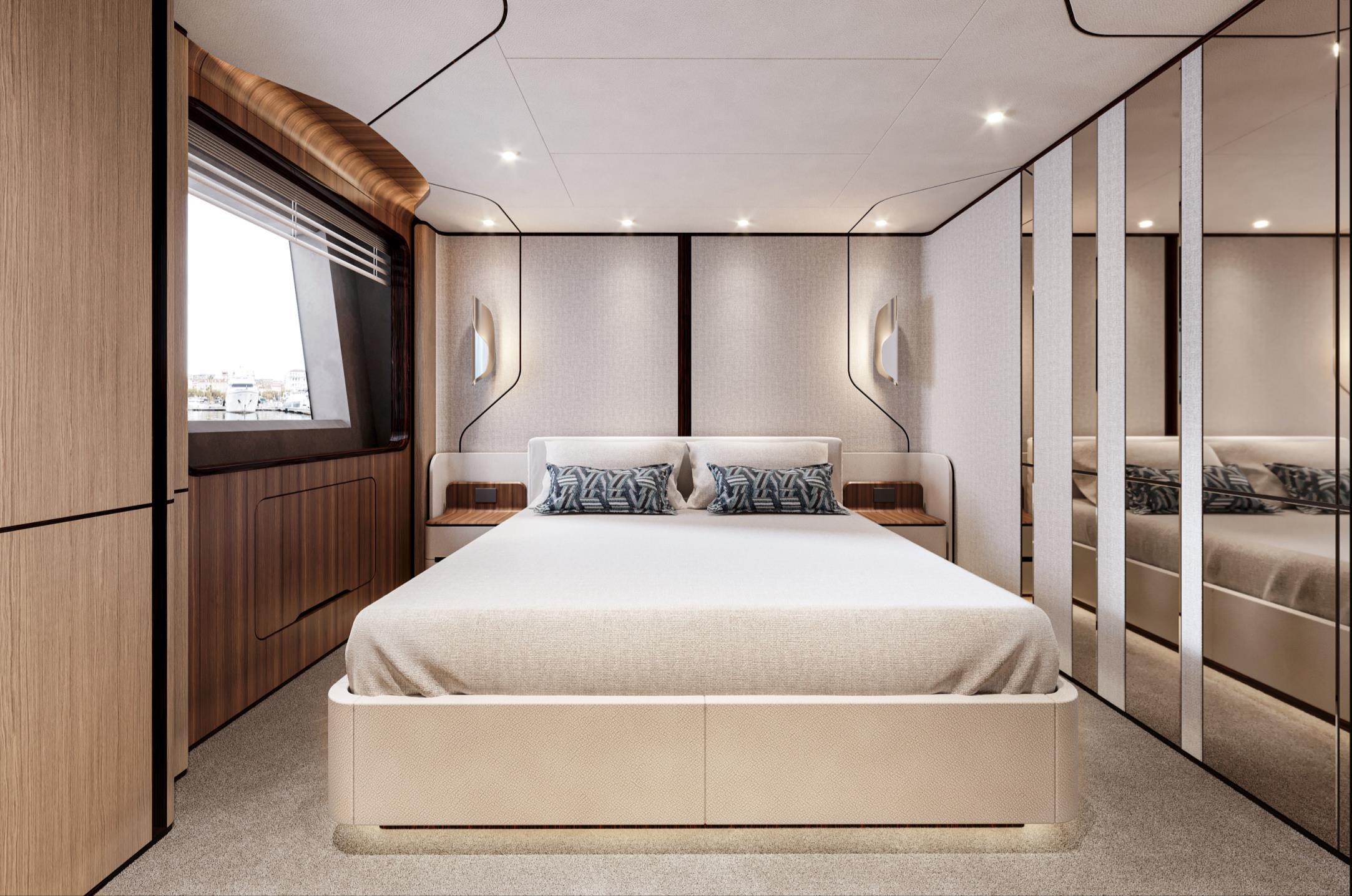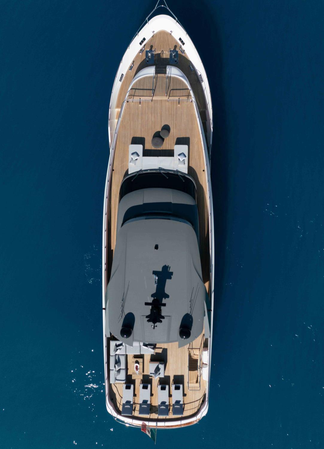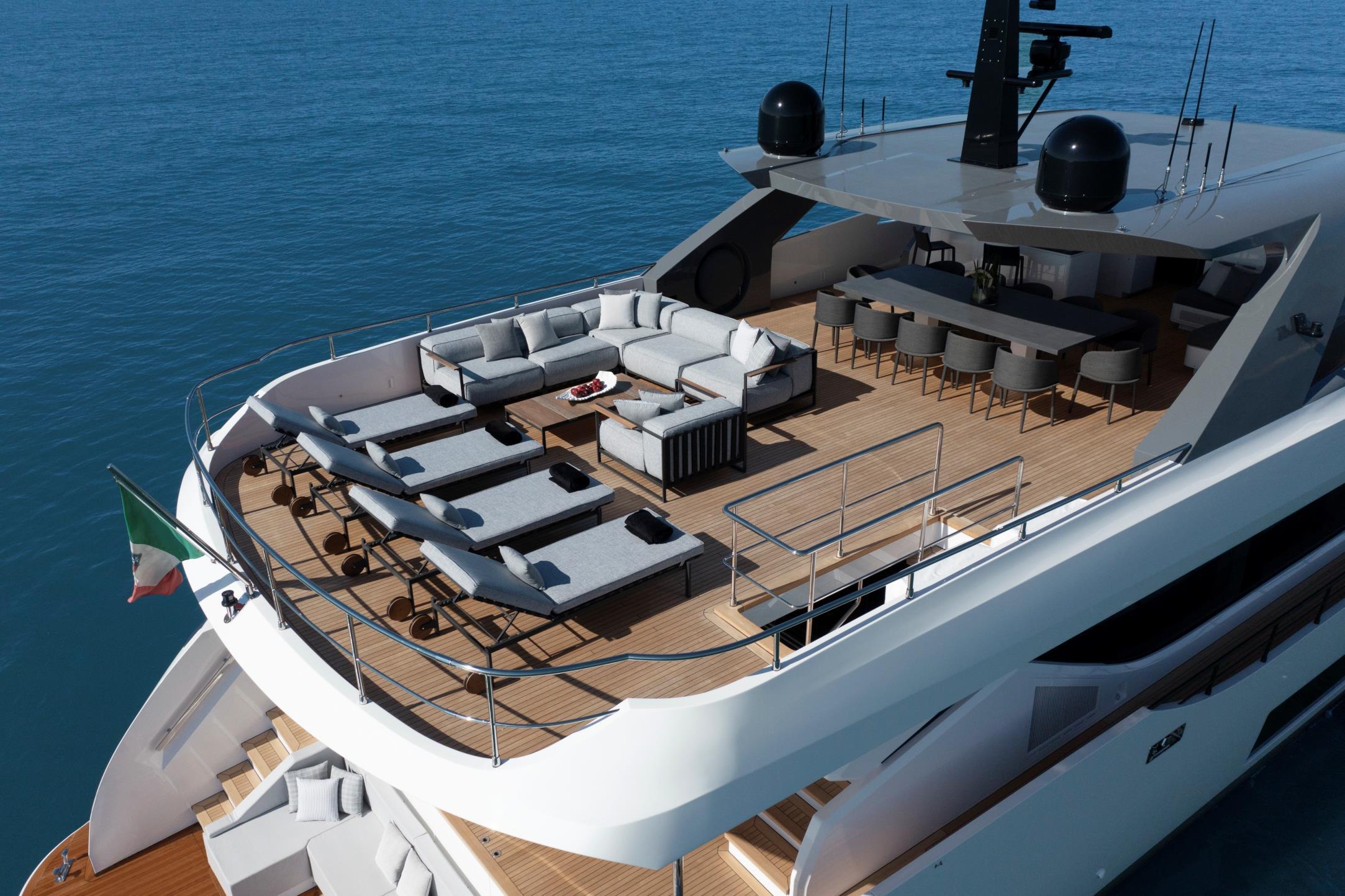 Featuring a versatile layout, it accommodates up to 12 guests across five en-suite staterooms, with the master suite elegantly positioned on the main deck forward, ensuring breathtaking sea views. The innovative "Walk-Around" flybridge, uniquely designed on a single level without obstacles, allows seamless movement from the aft to the foredeck, enhancing accessibility and facilitating uninterrupted communication between guests. Additionally, a side tender garage and integrated fibreglass settees on the transom optimize the aft area for leisure activities.