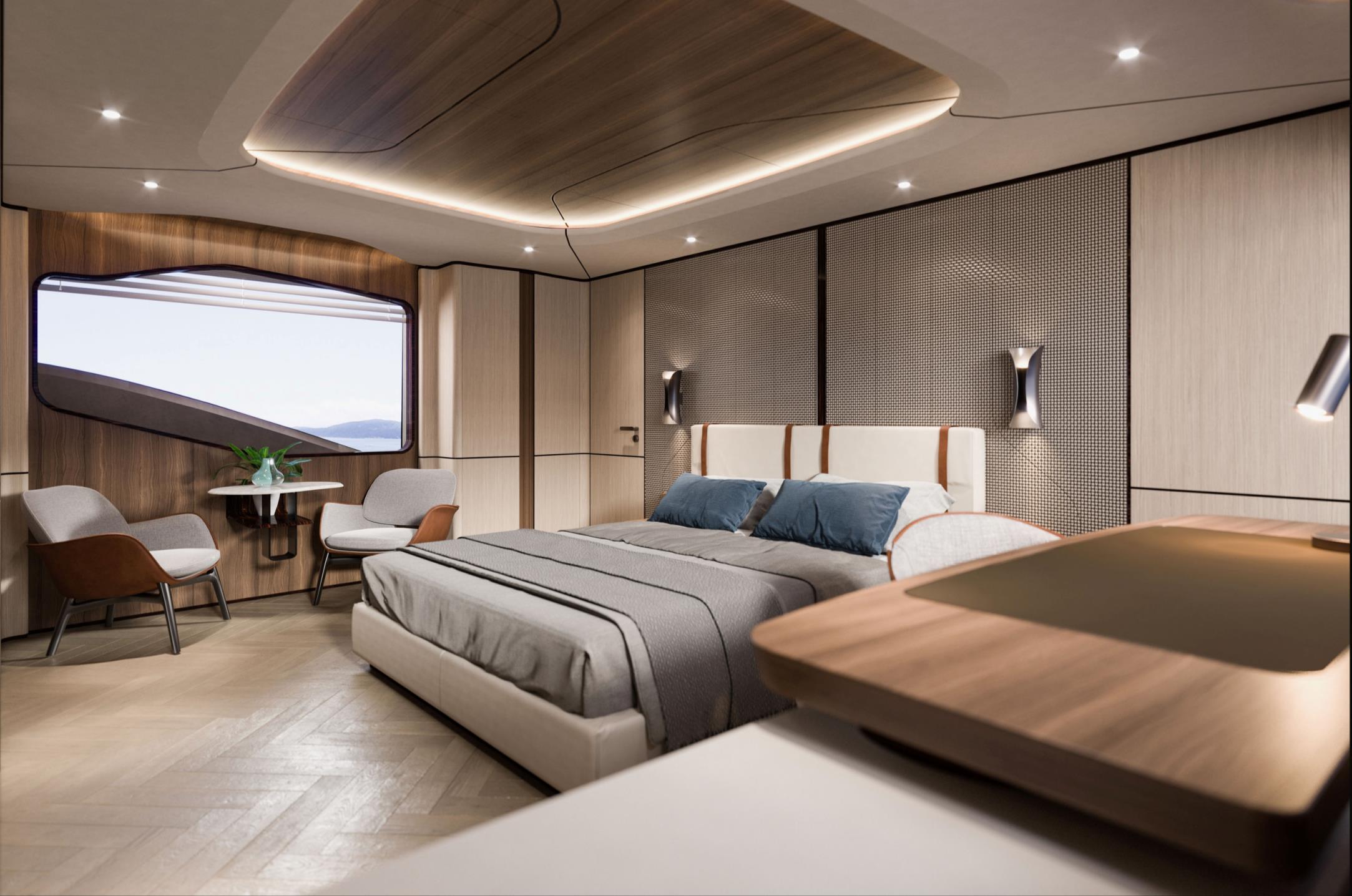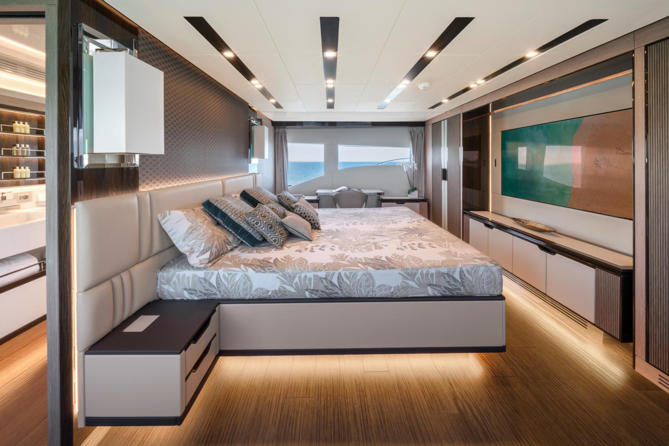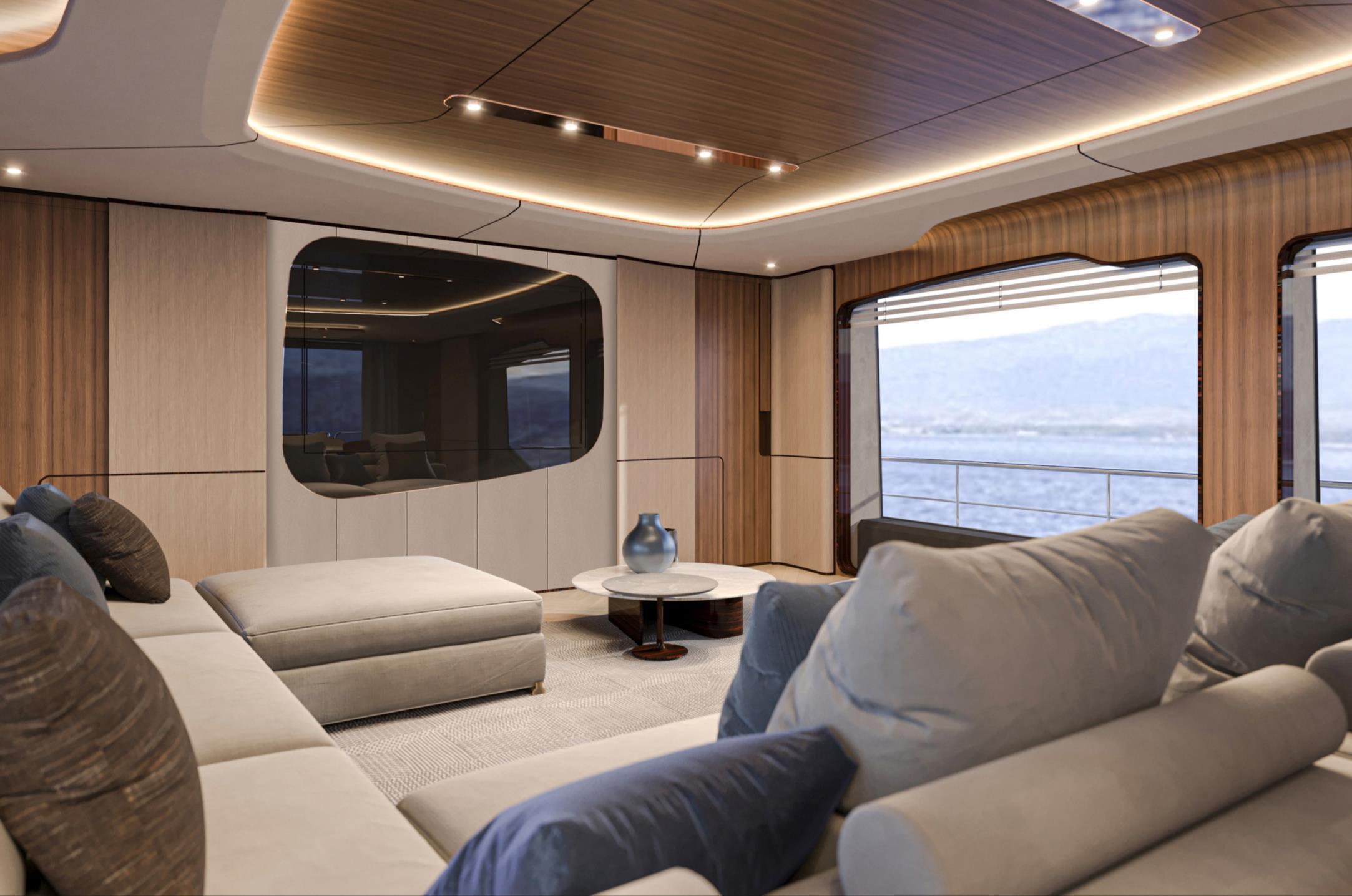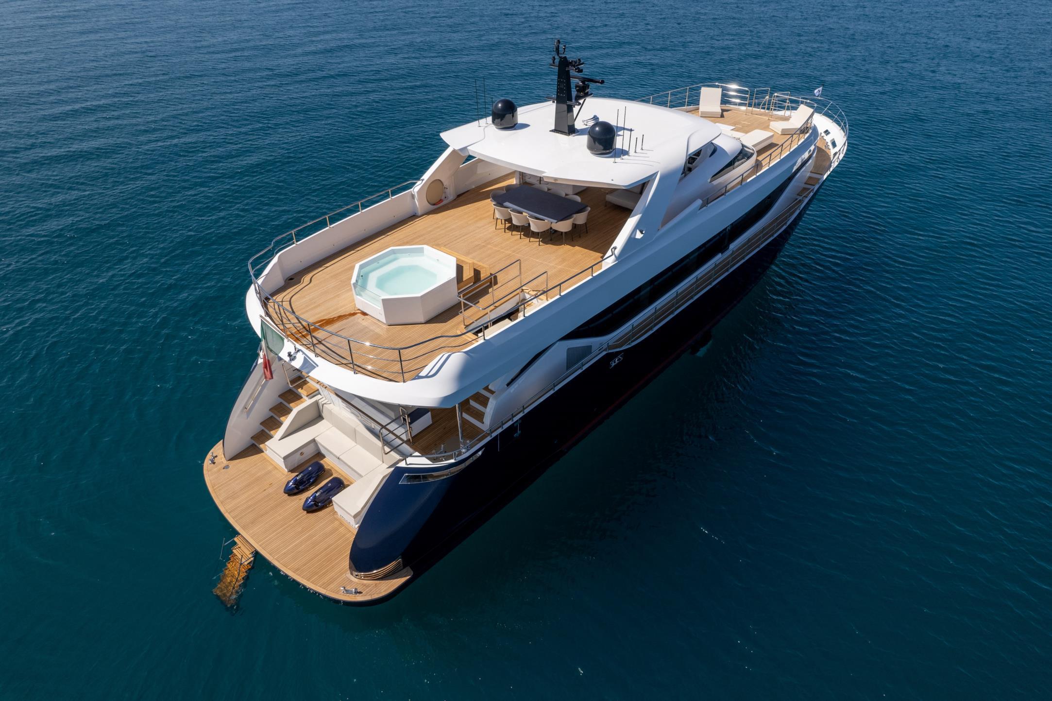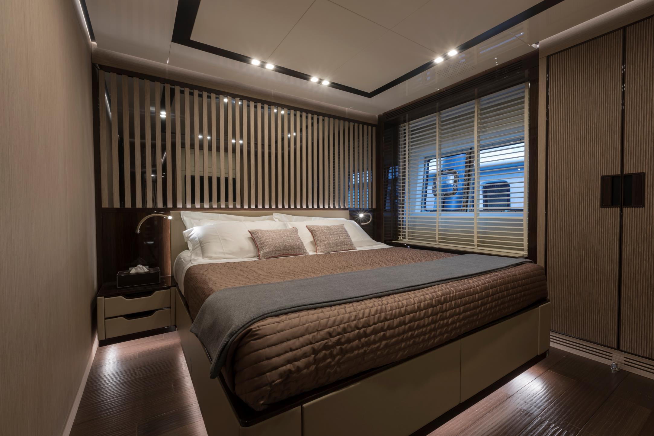 Featuring a versatile layout, it accommodates up to 12 guests across five en-suite staterooms, with the master suite elegantly positioned on the main deck forward, ensuring breathtaking sea views. The innovative "Walk-Around" flybridge, uniquely designed on a single level without obstacles, allows seamless movement from the aft to the foredeck, enhancing accessibility and facilitating uninterrupted communication between guests. Additionally, a side tender garage and integrated fibreglass settees on the transom optimize the aft area for leisure activities.