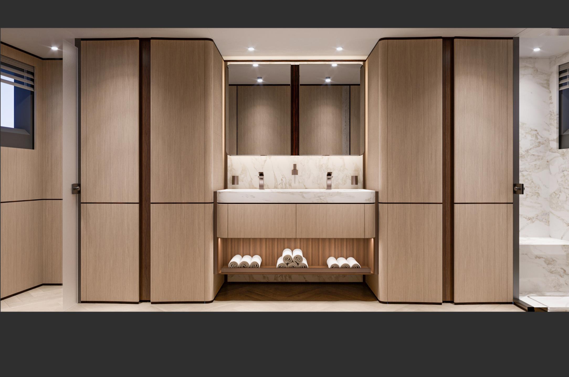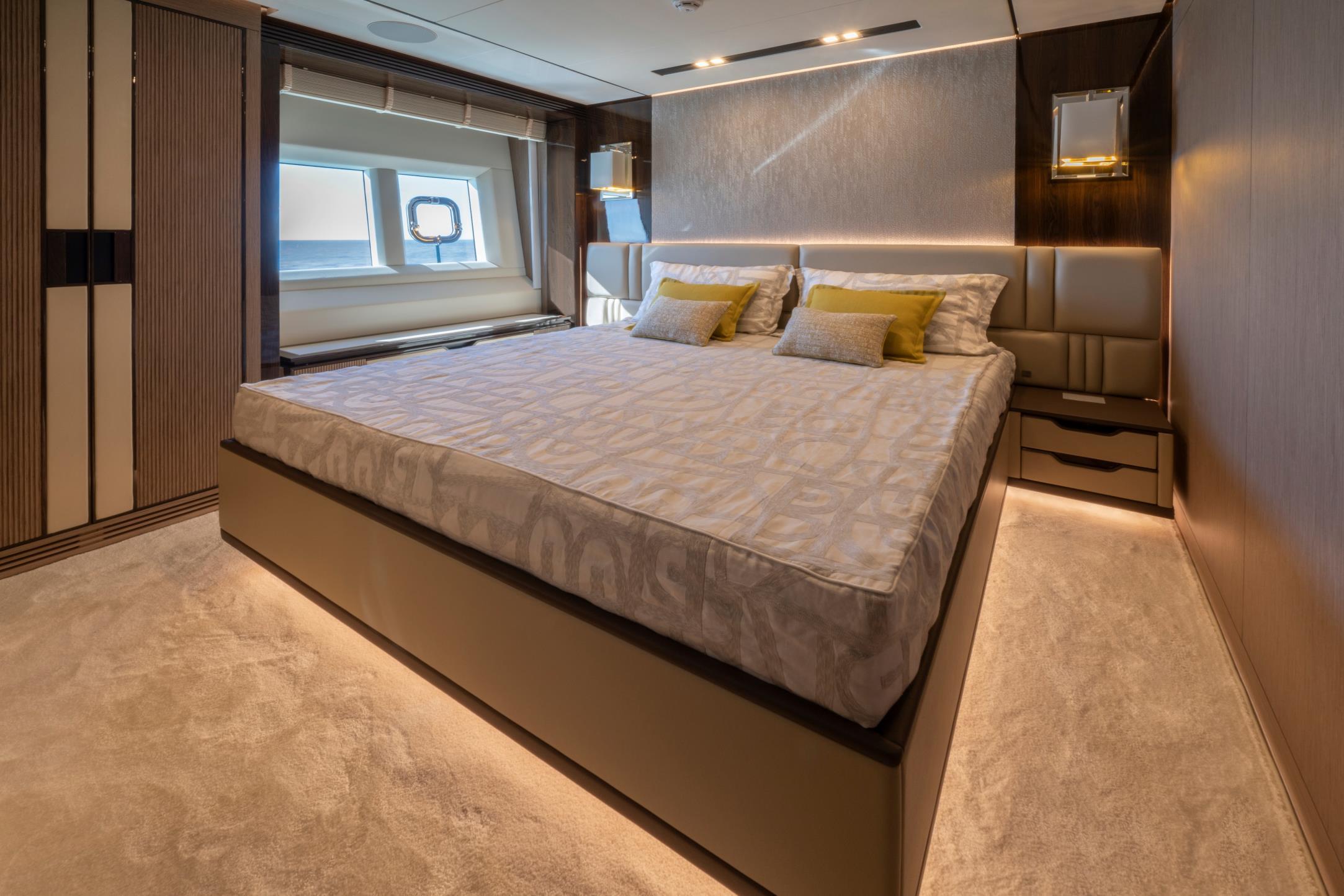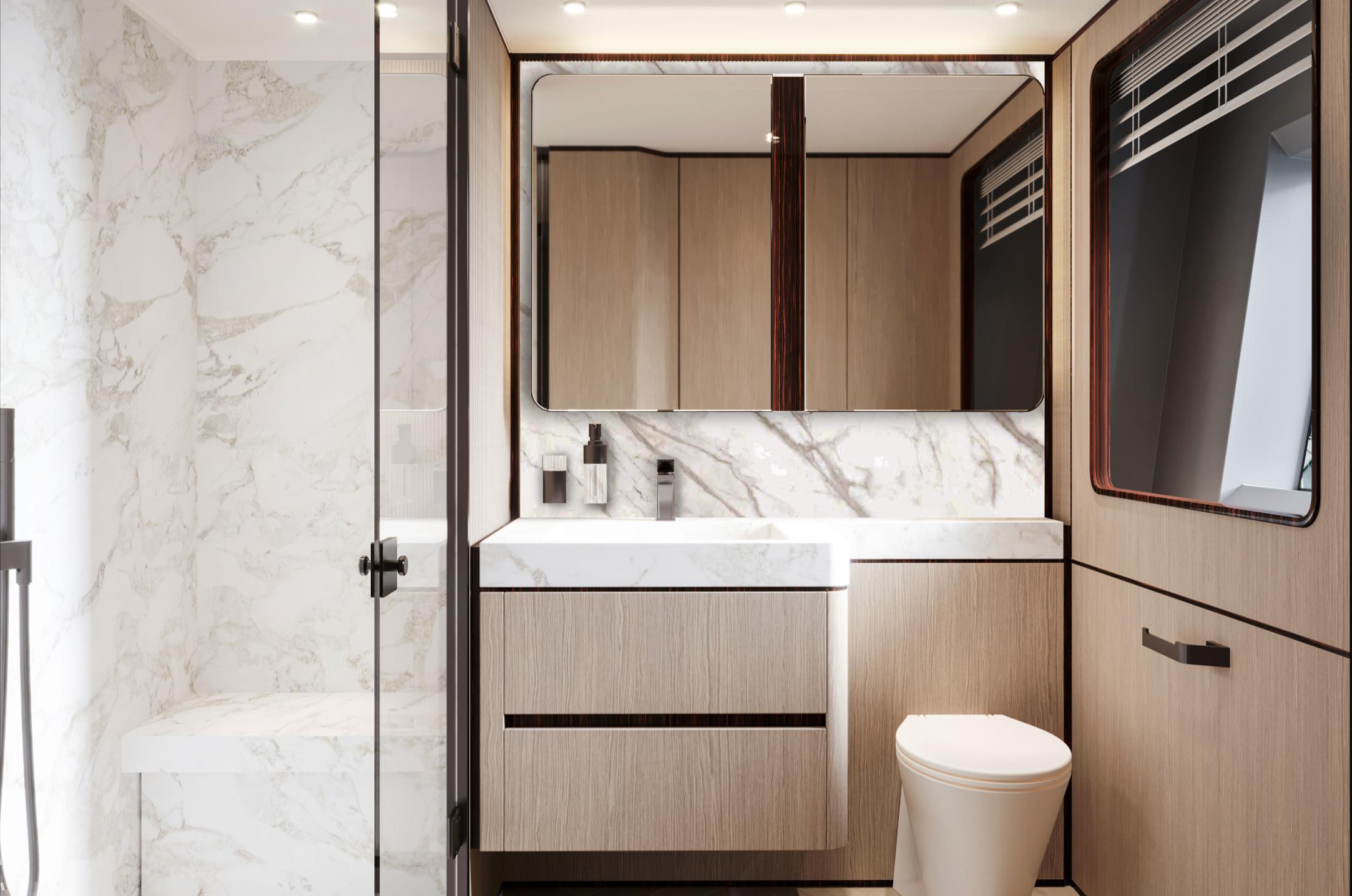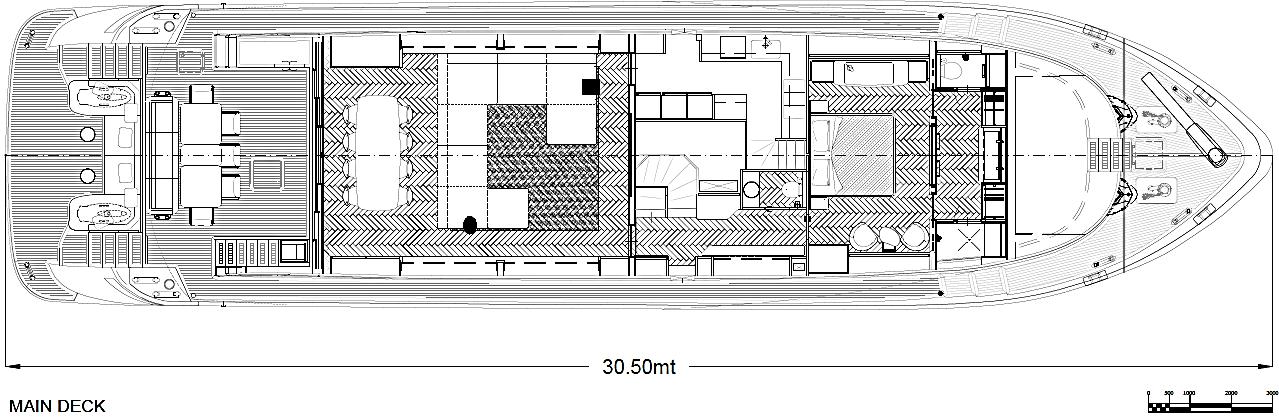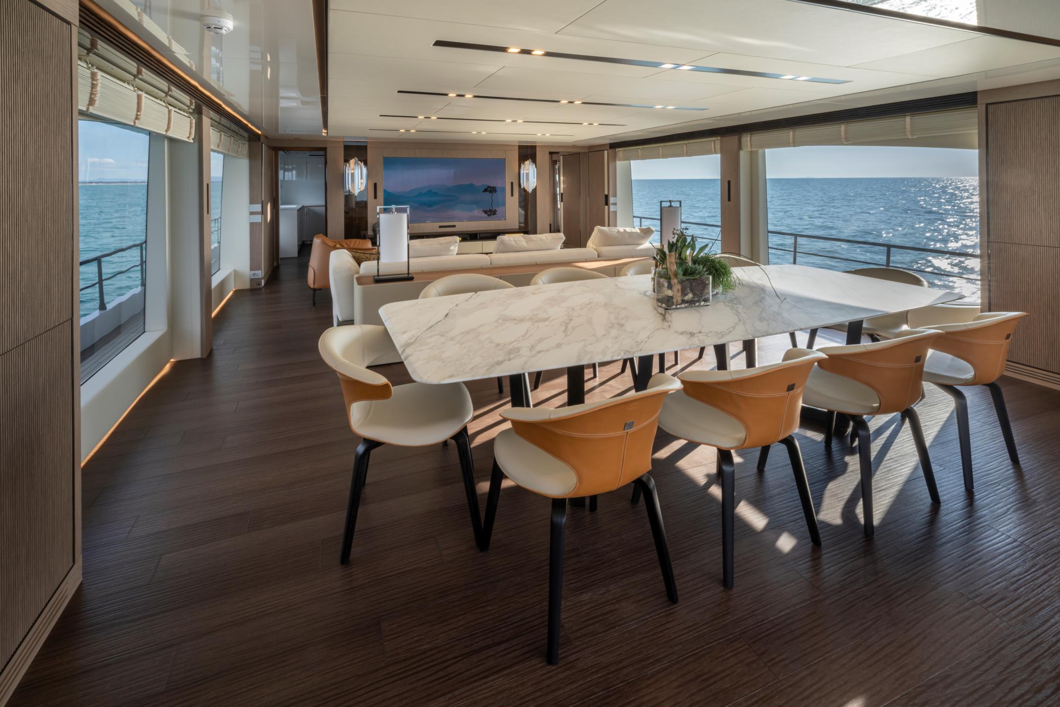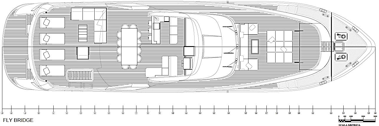 Featuring a versatile layout, it accommodates up to 12 guests across five en-suite staterooms, with the master suite elegantly positioned on the main deck forward, ensuring breathtaking sea views. The innovative "Walk-Around" flybridge, uniquely designed on a single level without obstacles, allows seamless movement from the aft to the foredeck, enhancing accessibility and facilitating uninterrupted communication between guests. Additionally, a side tender garage and integrated fibreglass settees on the transom optimize the aft area for leisure activities.