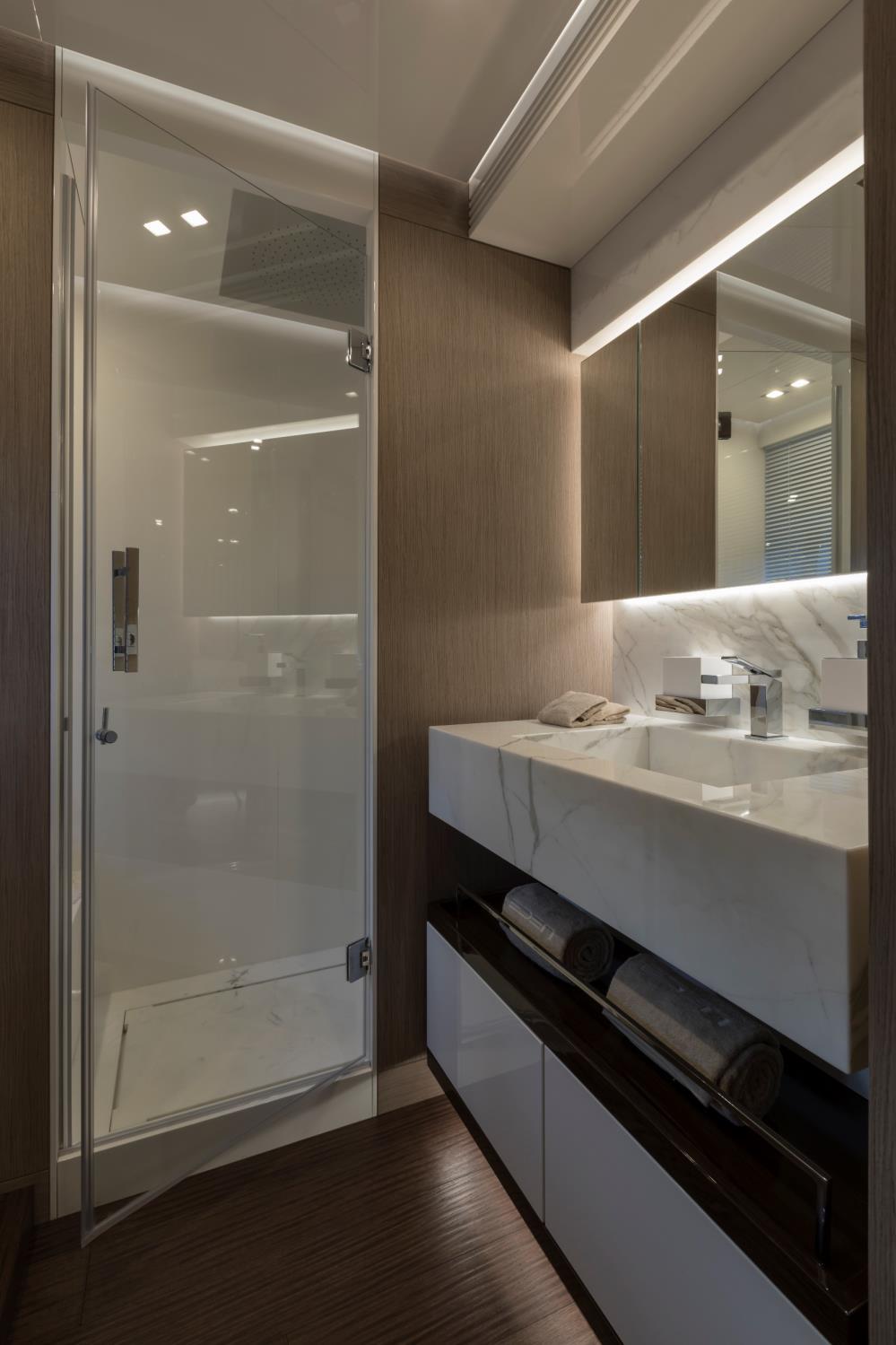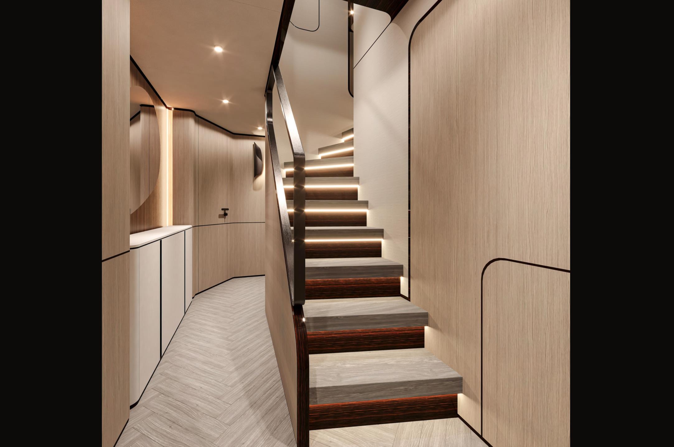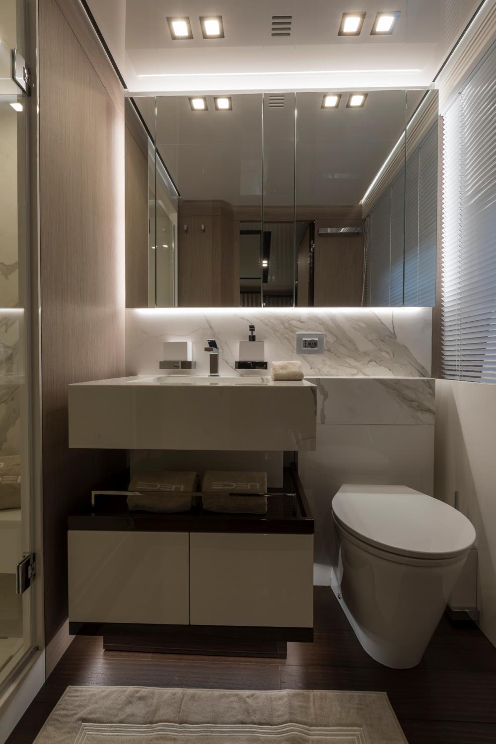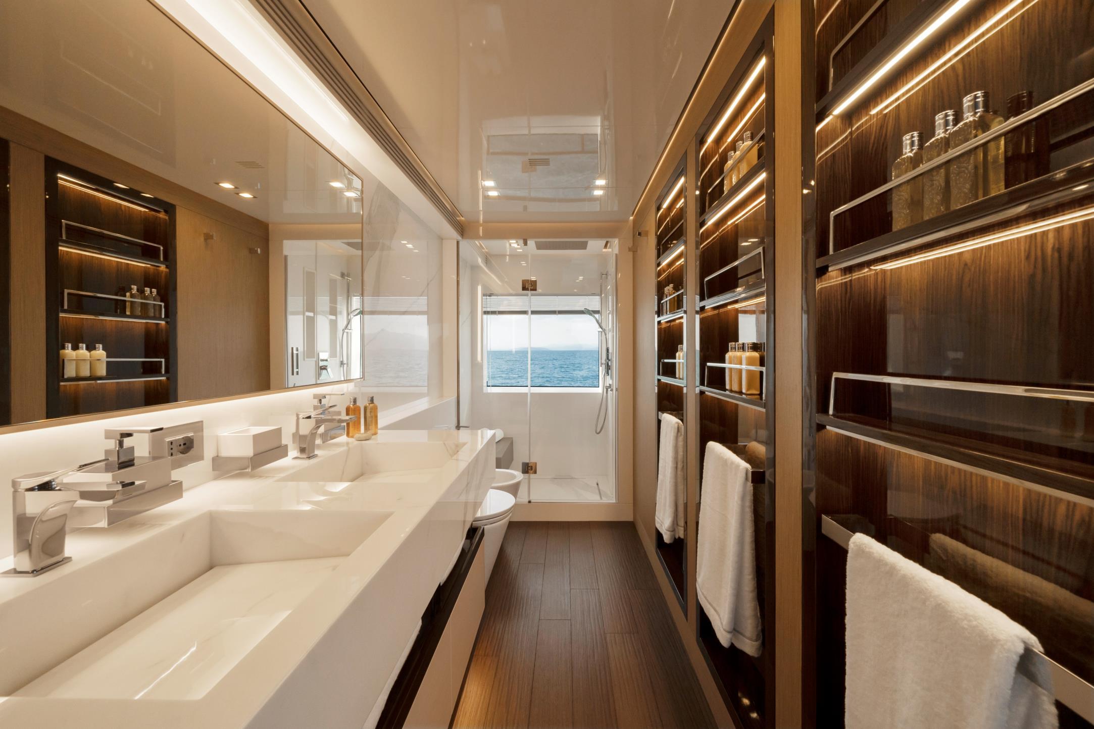 Featuring a versatile layout, it accommodates up to 12 guests across five en-suite staterooms, with the master suite elegantly positioned on the main deck forward, ensuring breathtaking sea views. The innovative "Walk-Around" flybridge, uniquely designed on a single level without obstacles, allows seamless movement from the aft to the foredeck, enhancing accessibility and facilitating uninterrupted communication between guests. Additionally, a side tender garage and integrated fibreglass settees on the transom optimize the aft area for leisure activities.