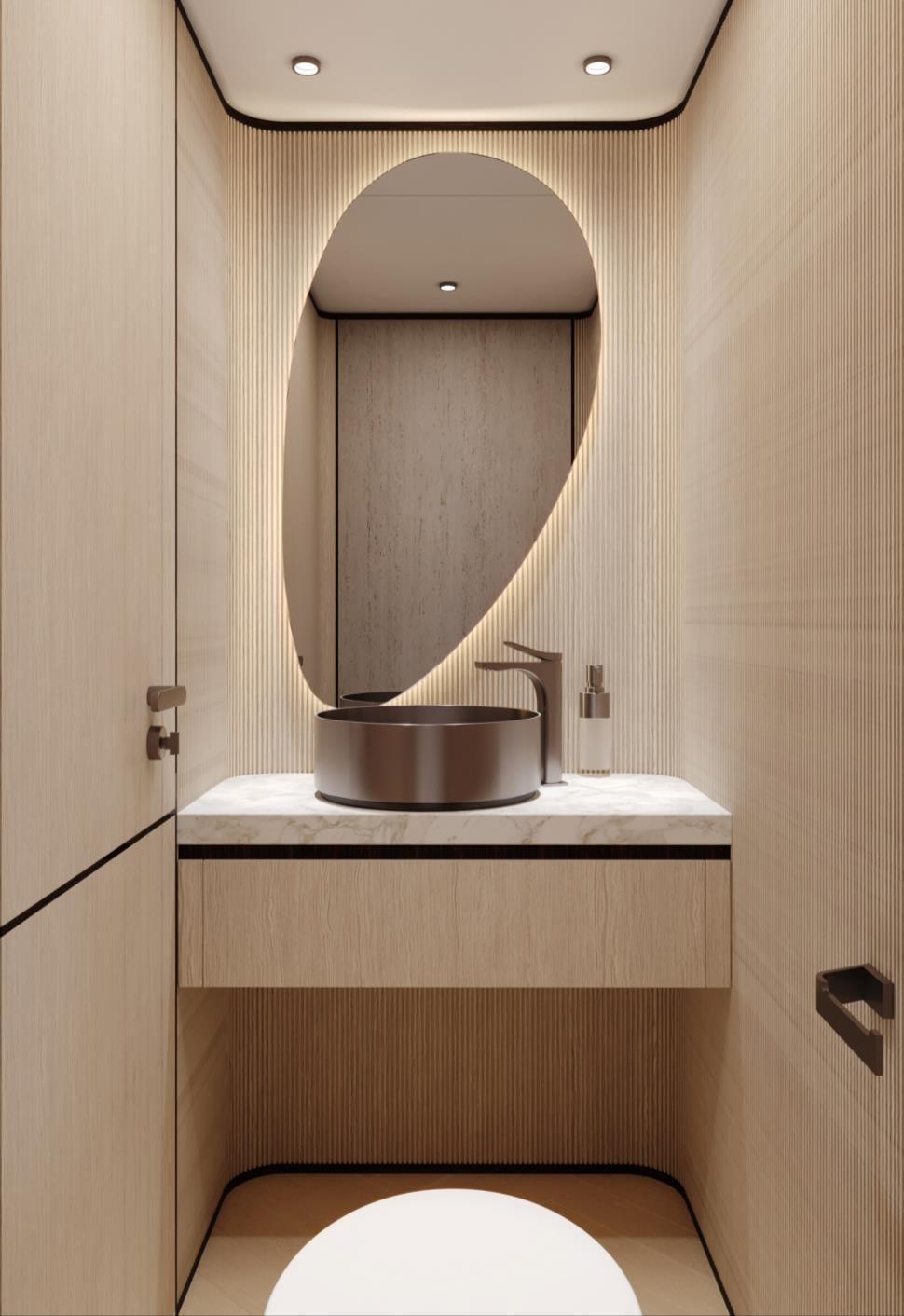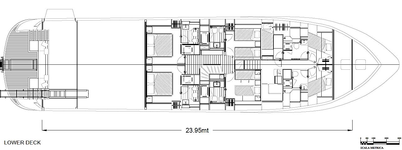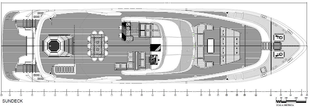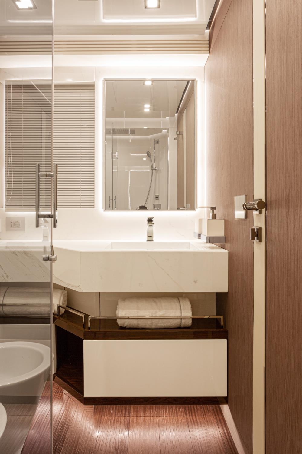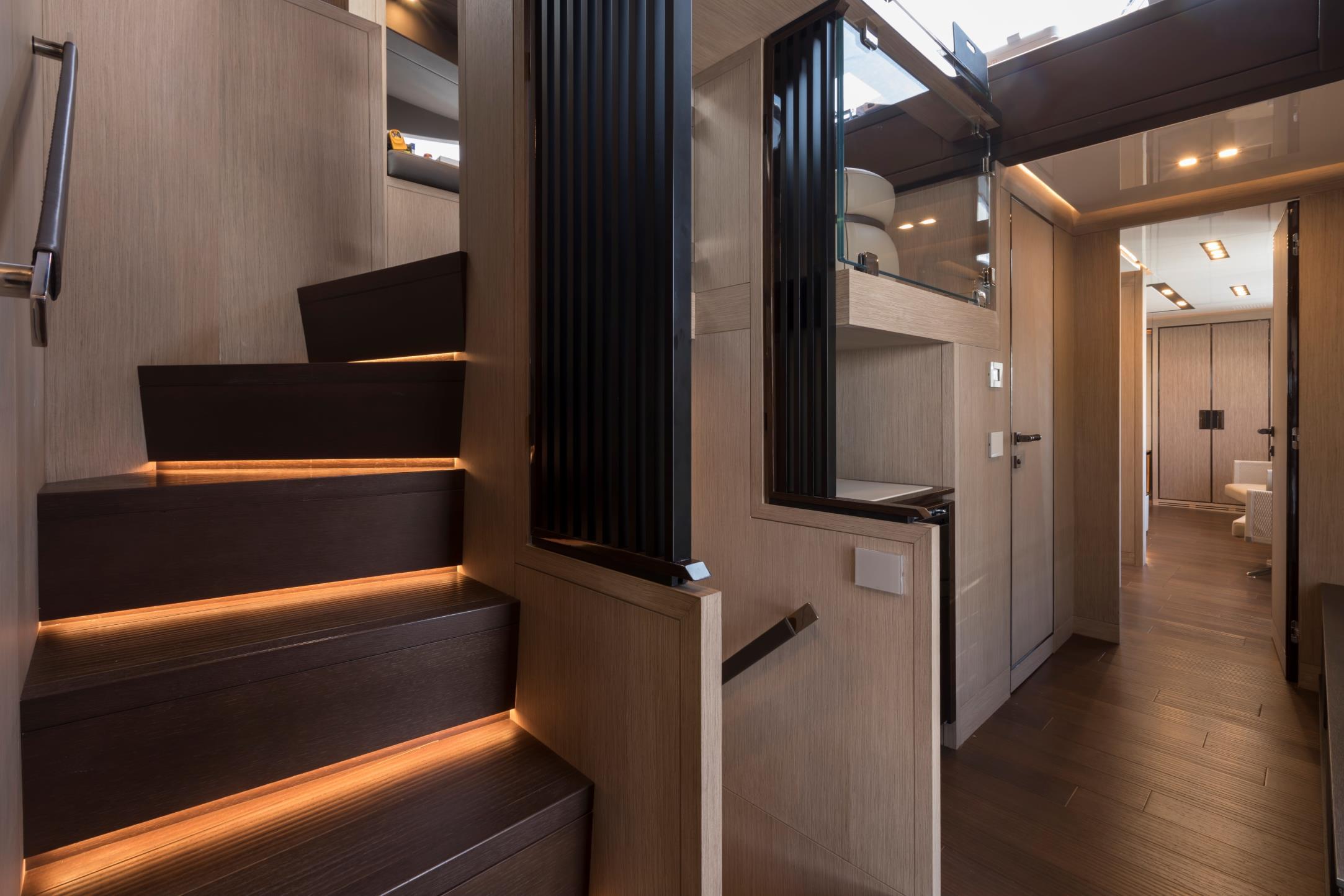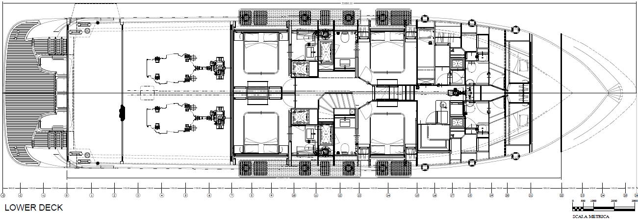 Featuring a versatile layout, it accommodates up to 12 guests across five en-suite staterooms, with the master suite elegantly positioned on the main deck forward, ensuring breathtaking sea views. The innovative "Walk-Around" flybridge, uniquely designed on a single level without obstacles, allows seamless movement from the aft to the foredeck, enhancing accessibility and facilitating uninterrupted communication between guests. Additionally, a side tender garage and integrated fibreglass settees on the transom optimize the aft area for leisure activities.