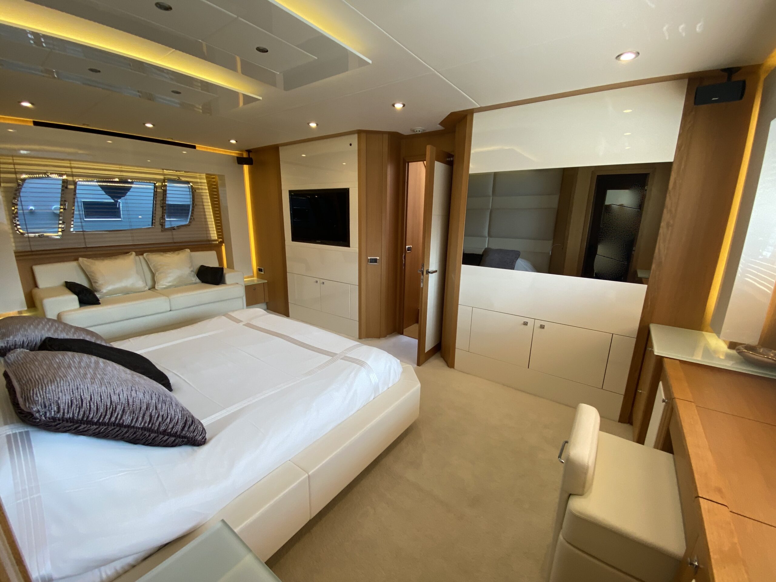 A seductive combination of style and exclusivity, the 86 Yacht delivers on all fronts. From bow to stern, every detail has been crafted to perfection. Inside, the main saloon is a large welcoming space; full of natural light, hand-finished furnishings and state-of-the-art technology. The outstanding level of design and craftsmanship continues below deck, where both the owner’s stateroom and guest cabins offer privacy and extravagance in equal measure.