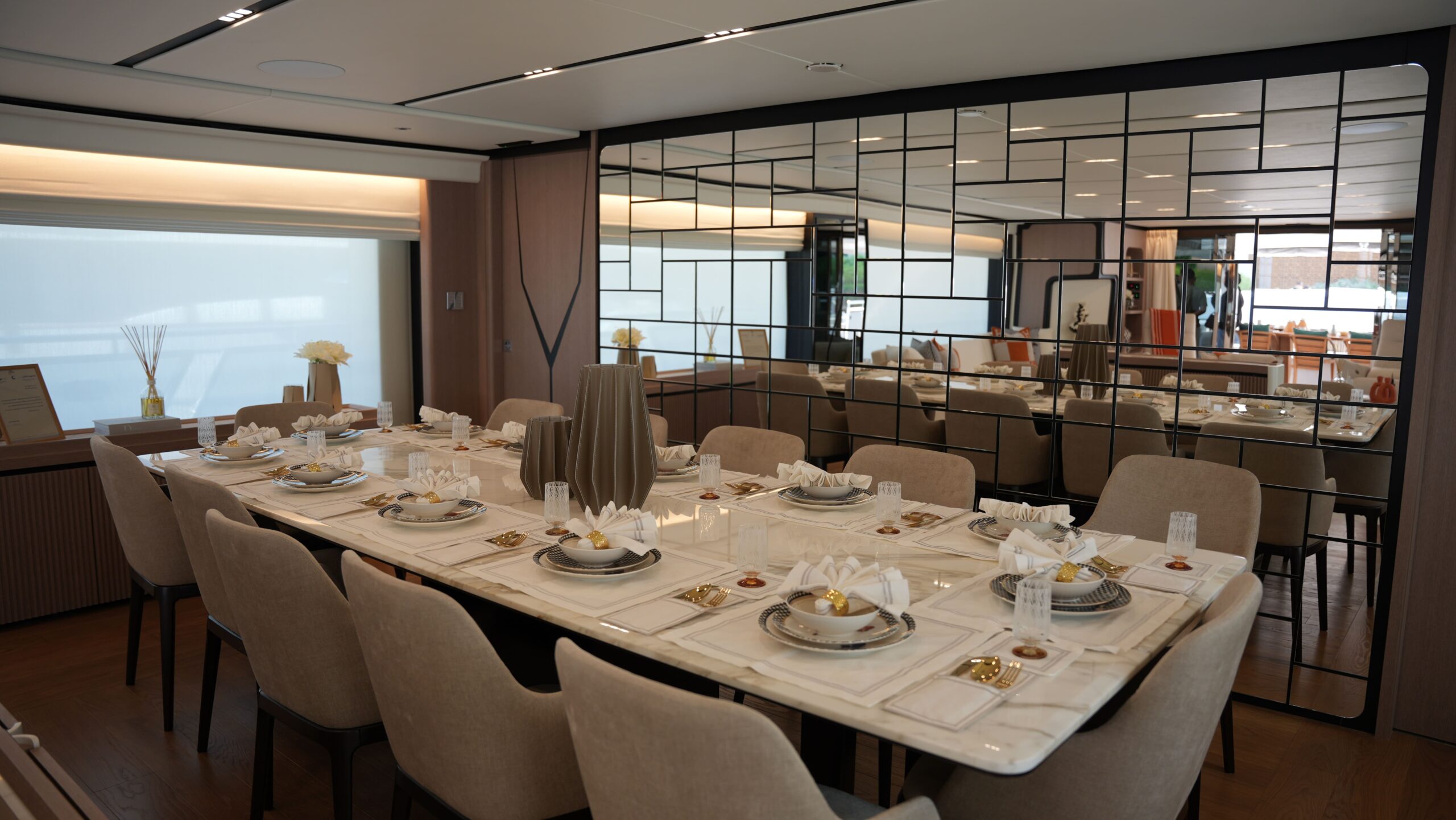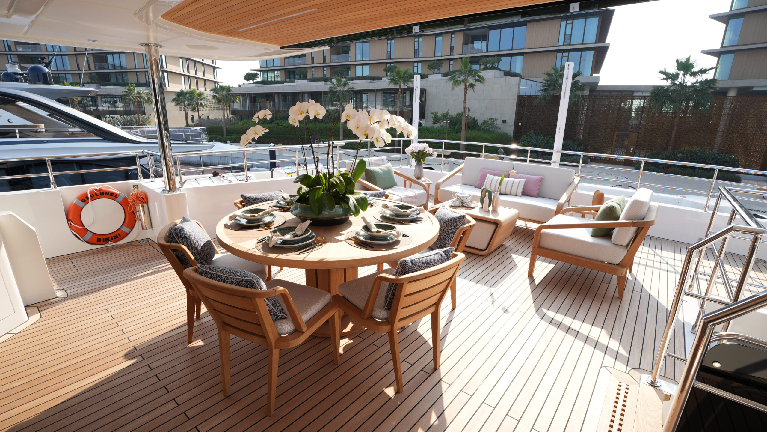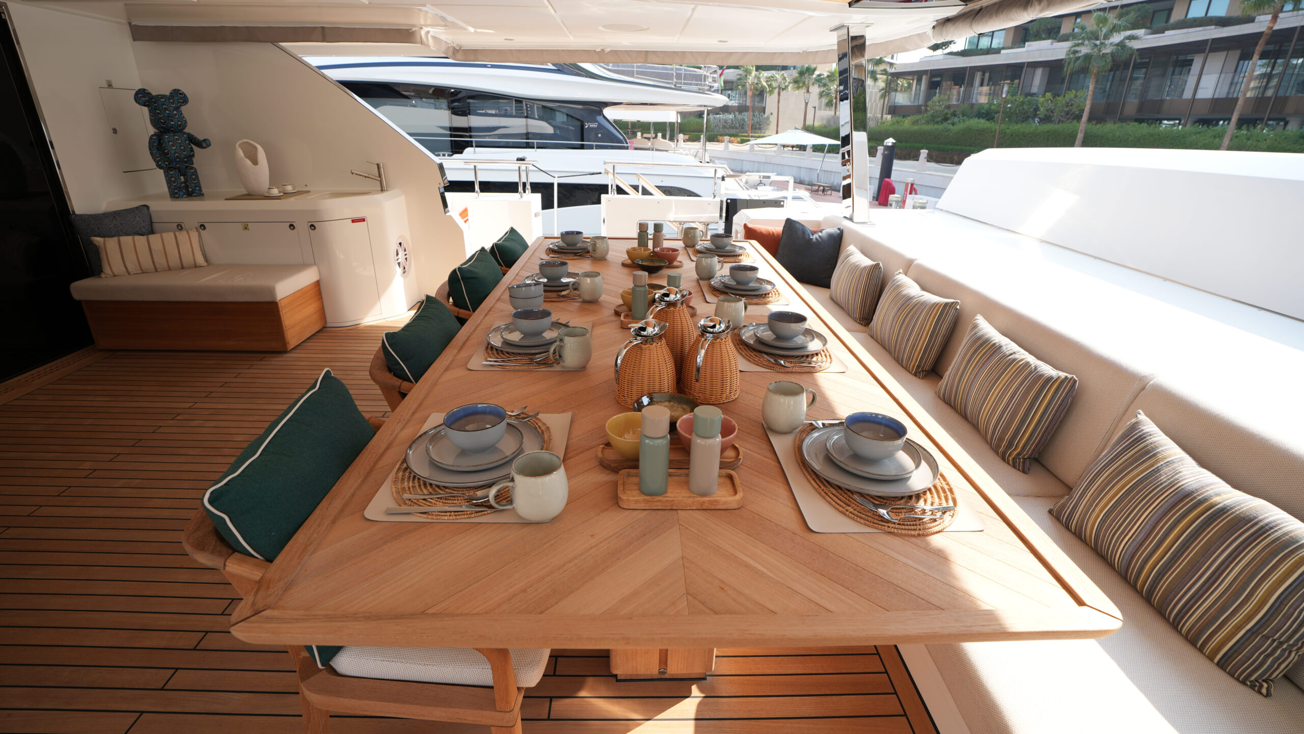 The smart layout onboard the Majesty 120 allows for a beachclub to double as a tender garage, creating a hybrid solution for the guests onboard. The multipurpose ladder that extends from the swim-platform allows for an easier and safer access to the superyacht while moored.