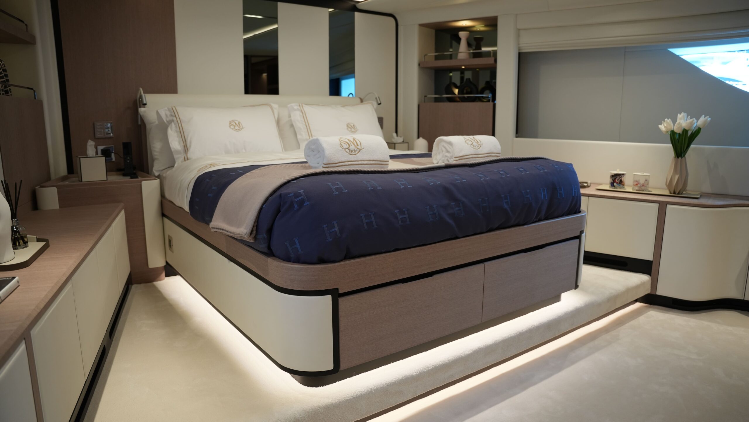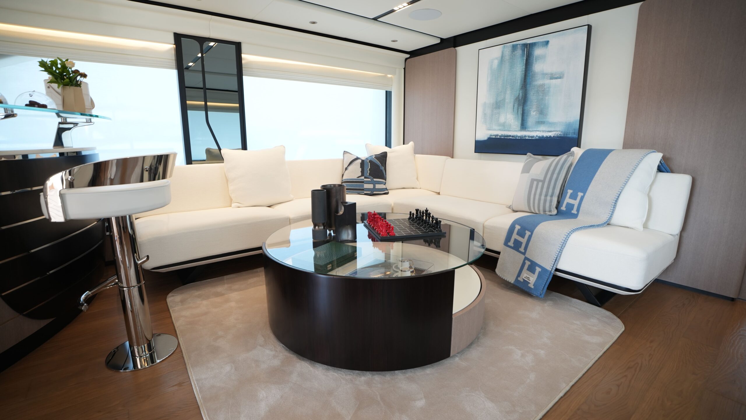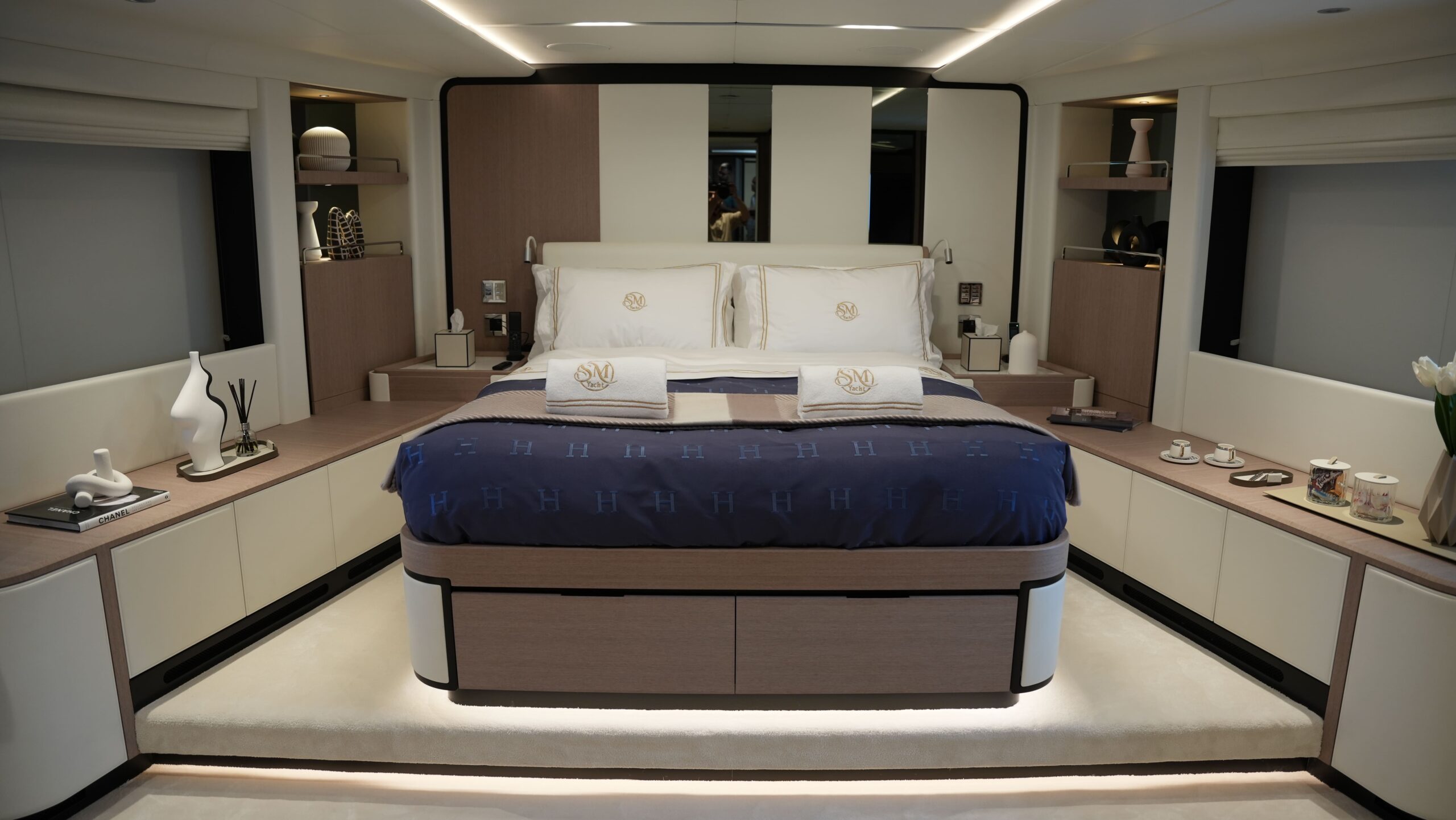 Aggressive lines and a demanding profile define the Majesty 120, with the signature Majesty Yachts windows lining the hull. Extensive use of glass offers an unparalleled connection to the outdoors with low bulwarks allowing for an ornamental glass railing design. Amongst the standout features onboard the new Majesty 120 is a Jacuzzi situated on the sun deck. For optimal guest comfort, there are six cabins, including a full-beam master cabin on the main deck, a rare feature for super yachts of this length. This superyacht boasts 30% larger outdoor entertainment areas compared to any other yacht in its class.