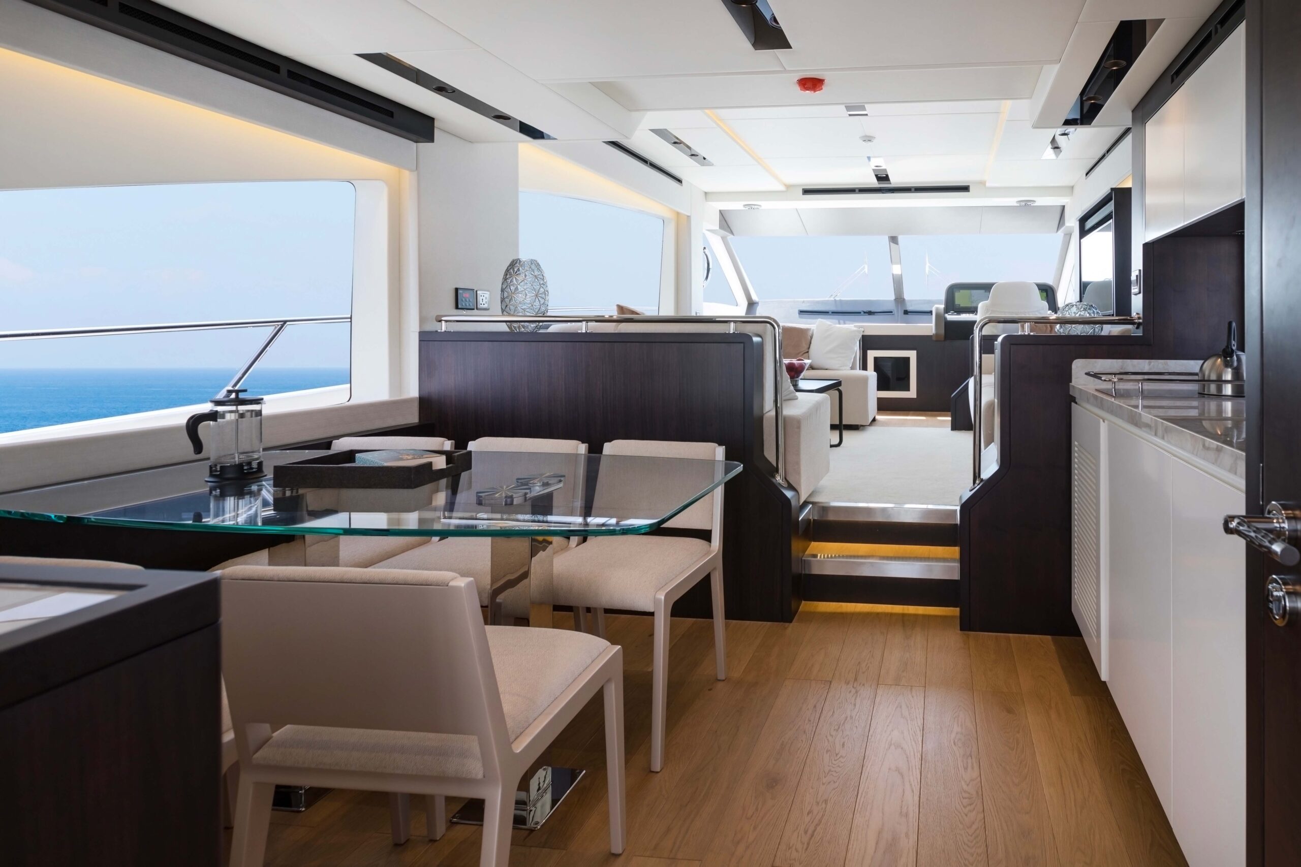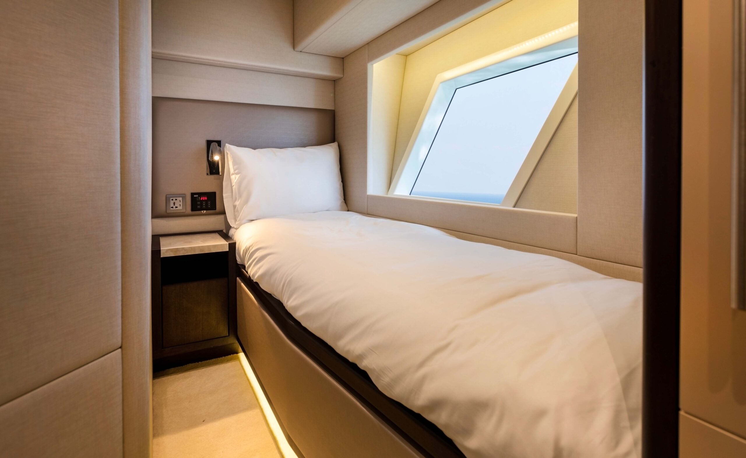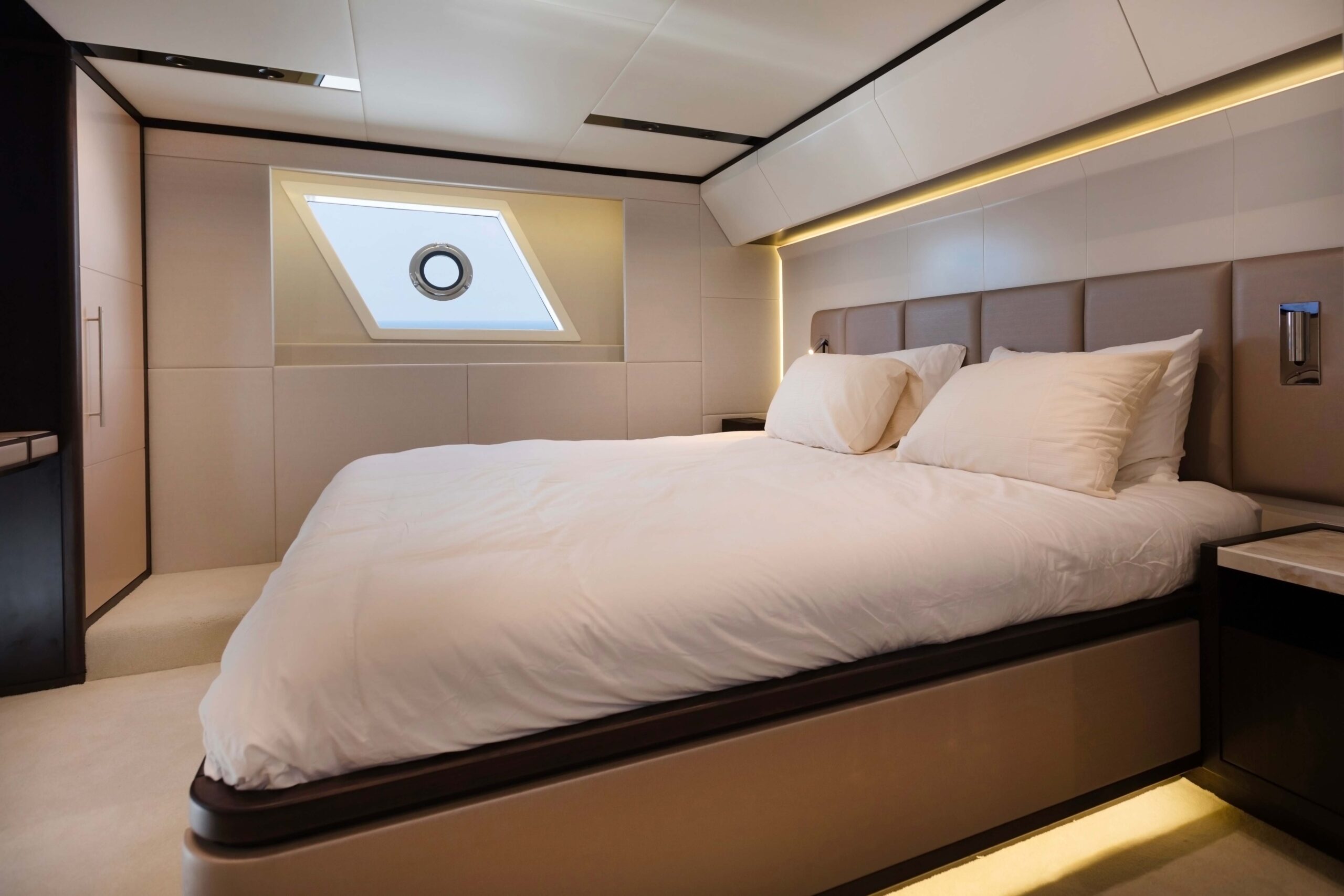 The Majesty 62’s sleek profile conceals the skillful design of her decks, which include saloon and dining space, 4 guest cabins, 3 heads and separate accommodation for the crew. The fly-bridge is designed to maximize outside space making this the perfect choice for leisure cruising. The elegance of her design continues into the sleeping quarters, with the owner’s cabin being situated mid ship allowing large windows to bring the feel of light and space to the lower deck.