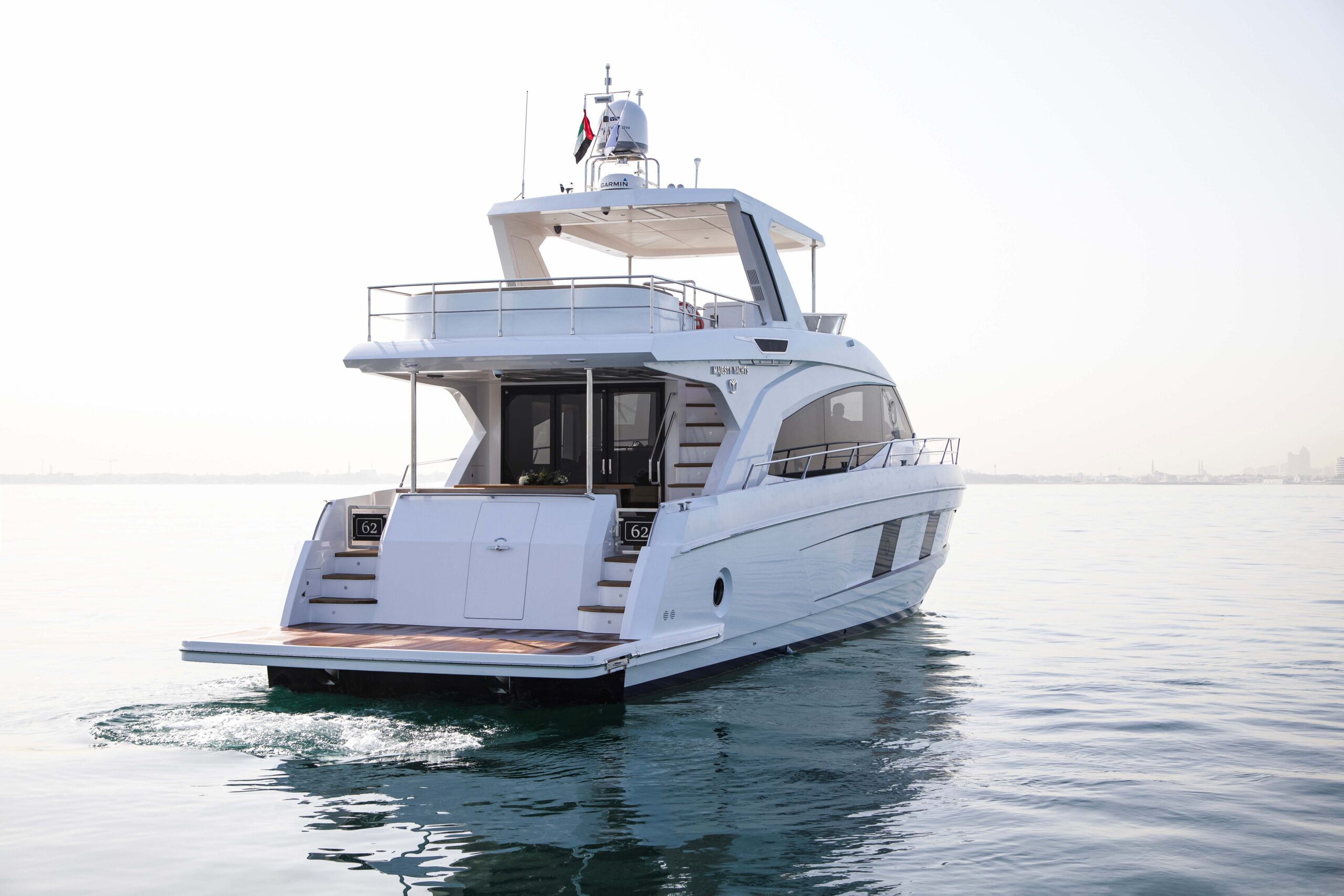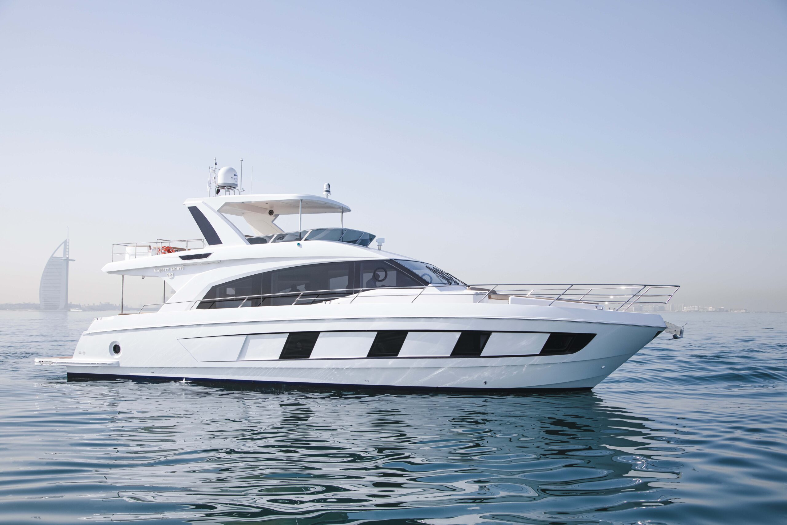 Featuring a distinctively sleek profile, the 18.80 meter Majesty 62 provides amazing indoor living and entertainment spaces with 4 bedrooms, 3 bathrooms and separate accommodation for the crew. The semi-covered fly-bridge is designed for maximum outdoor space making this the perfect choice for leisure cruising with family and friends