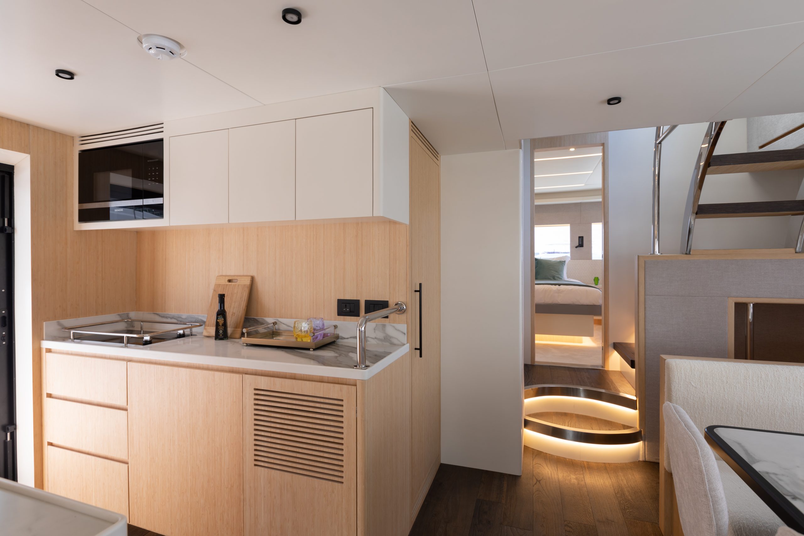 Her semi-displacement hull provides exceptional seakeeping, effortlessly cutting through challenging seas while offering a top speed of 26 knots and an efficient cruising speed of 12 knots, enabling a range of up to 1,000 nautical miles. The yacht’s interior spaces are bathed in natural light, with carefully chosen finishes and sustainable materials creating a sense of understated luxury. Owners can select from two interior palettes—light and breezy or warm and sophisticated—tailoring the ambiance to their lifestyle.