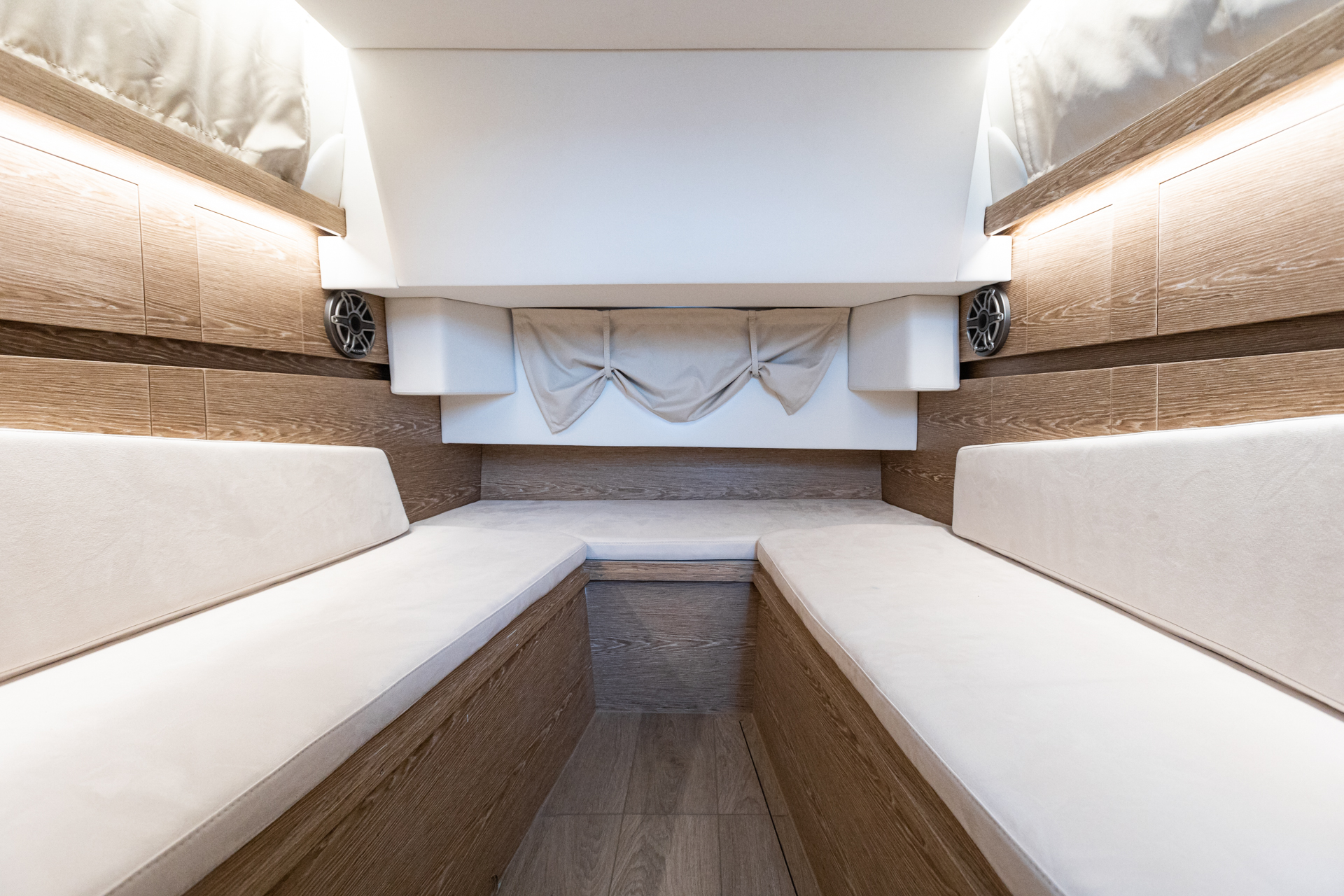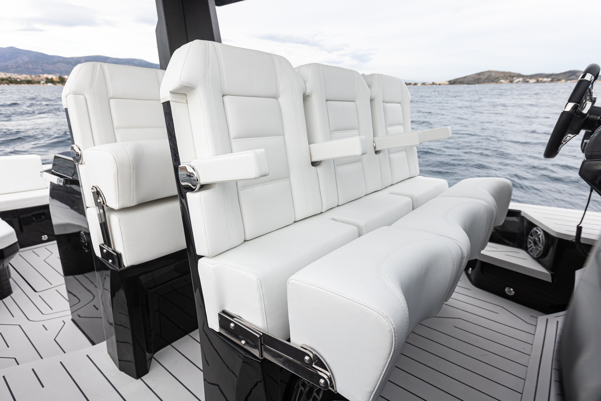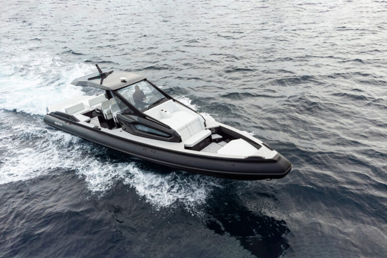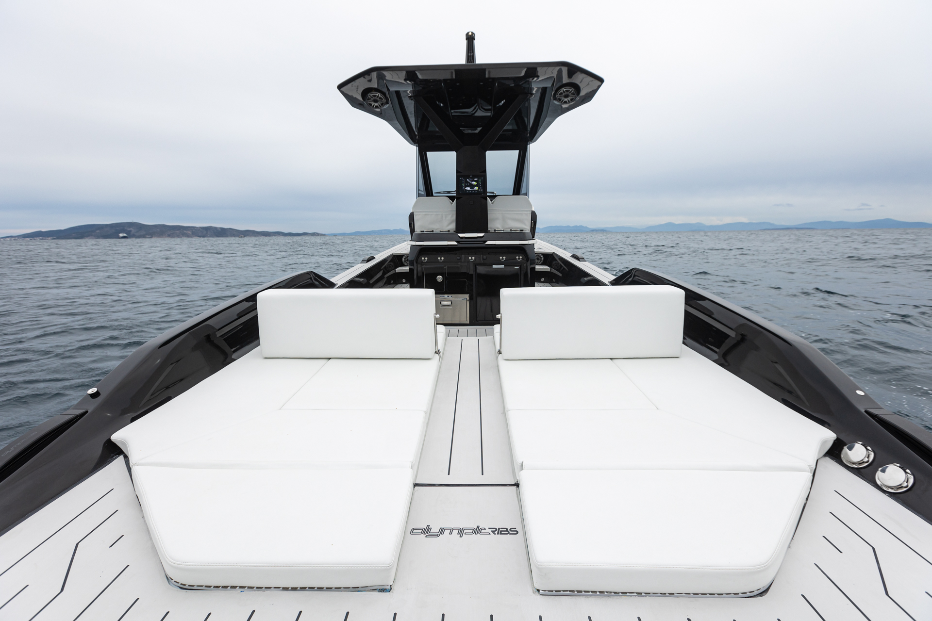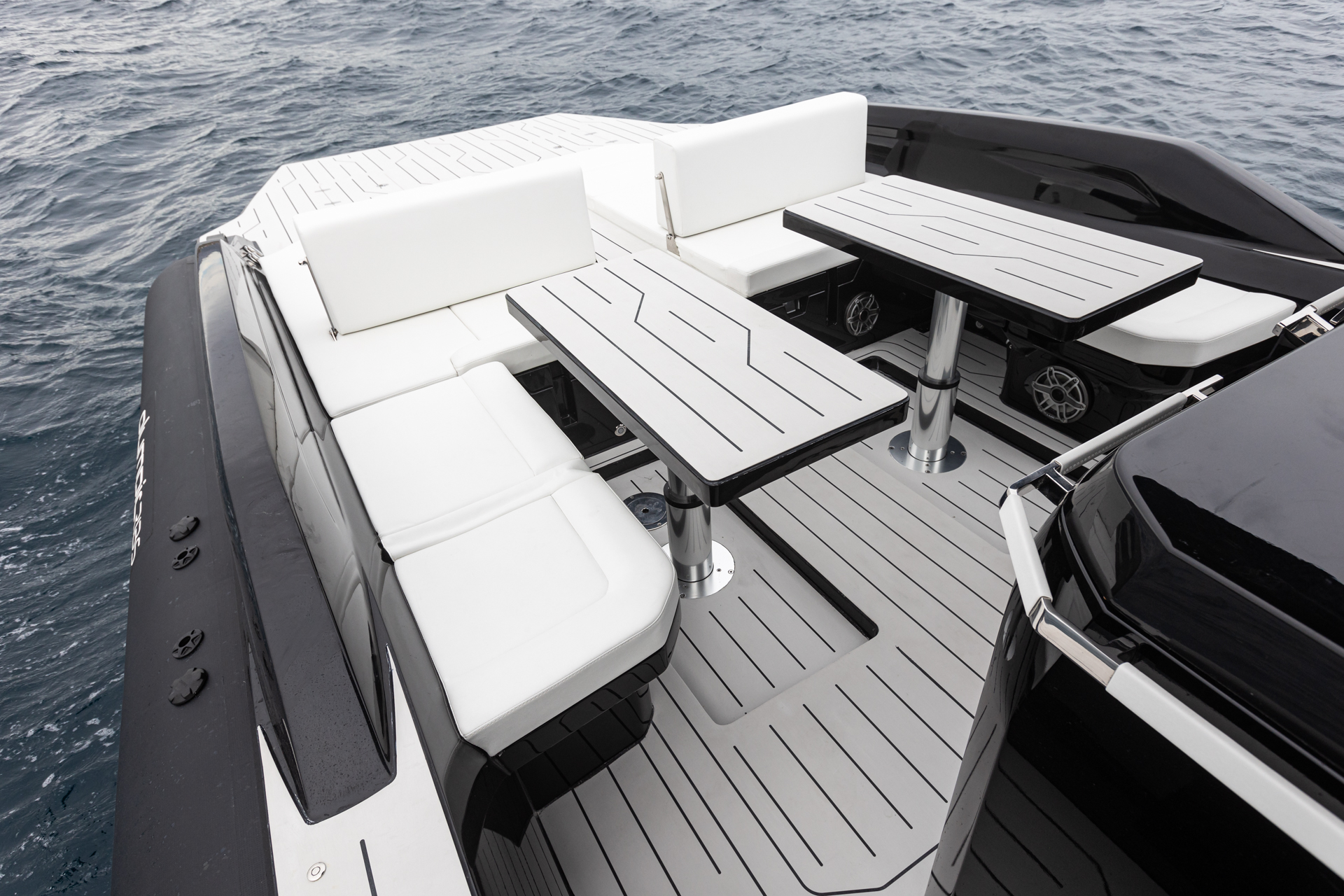 The unique style options available with the 45SRC Stern allow for full personalization, adapting to and reflecting the owner's character. Custom color palettes and equipment upgrades can transform the 45SRC Stern into an elegant cruiser with a full teak deck, equipped with helm chairs and twin inboard diesel engines, or into a supersport beast with carbon fiber details, Ullman mitigation seats, and triple outboard engines. The RIB's versatile stepped hull guarantees extraordinary performance without compromising passenger safety and comfort, while maintaining SRC Stern's high standards of luxury. Top-quality materials, fittings, fixtures, and finishes have been carefully selected to create the perfect balance between engineering and elegance. The RIB is a no-wood structure, equipped with a single-piece liner and manufactured with vinyl ester resins and multiaxial fabrics.