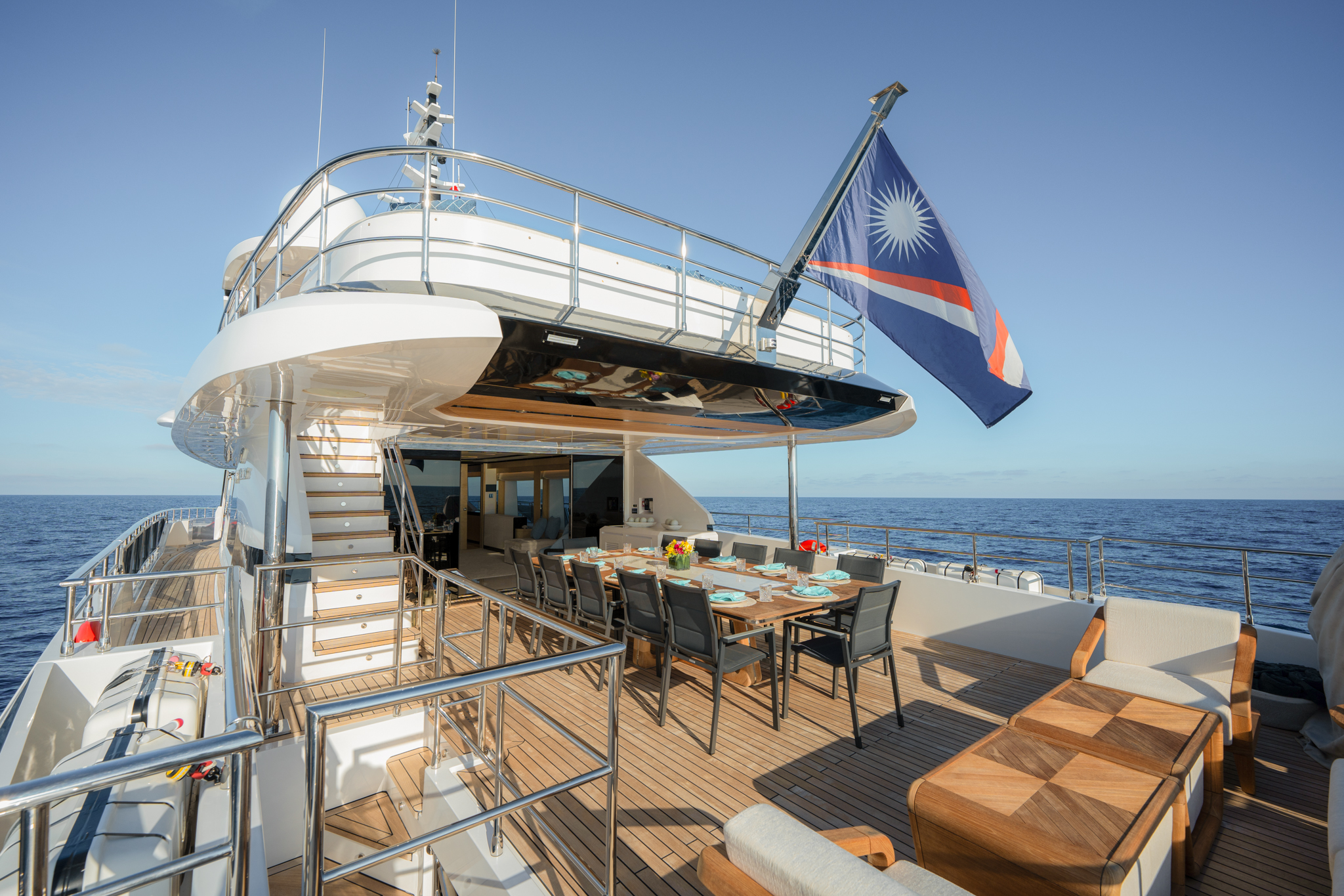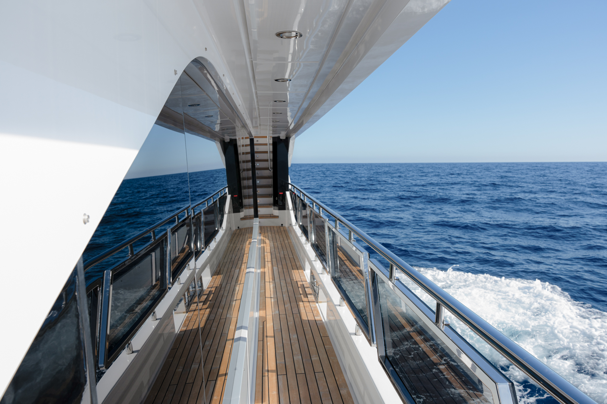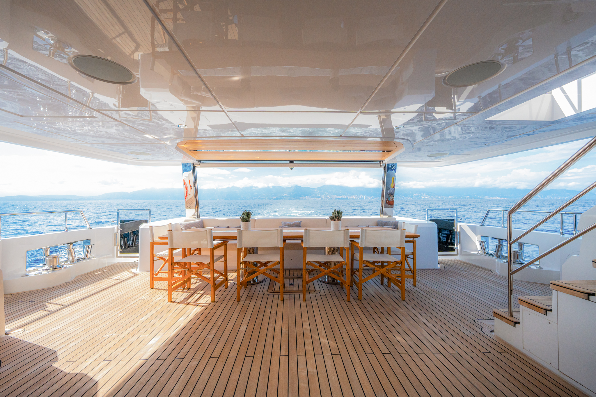 The smart layout onboard the Majesty 120 allows for a beachclub to double as a tender garage, creating a hybrid solution for the guests onboard. The multipurpose ladder that extends from the swim-platform allows for an easier and safer access to the superyacht while moored.