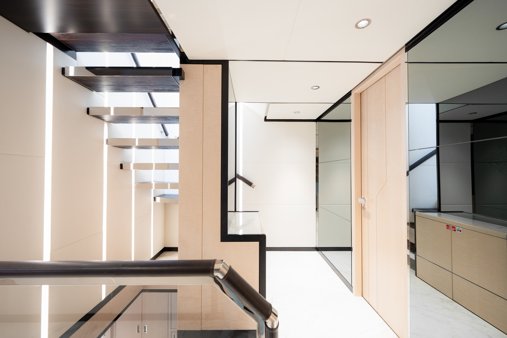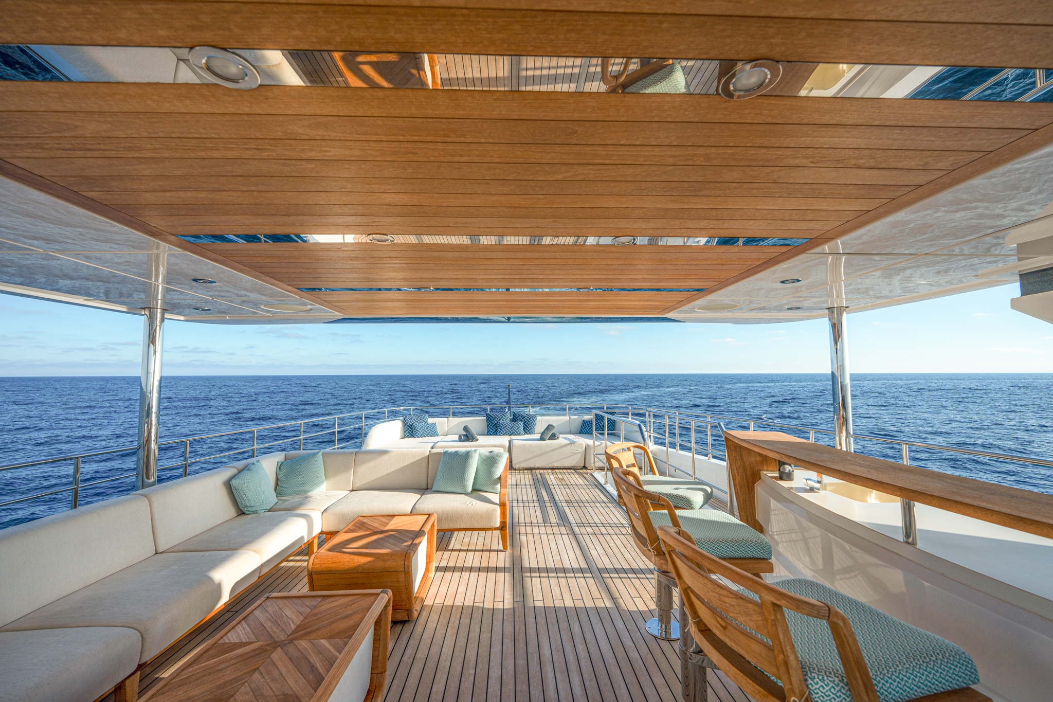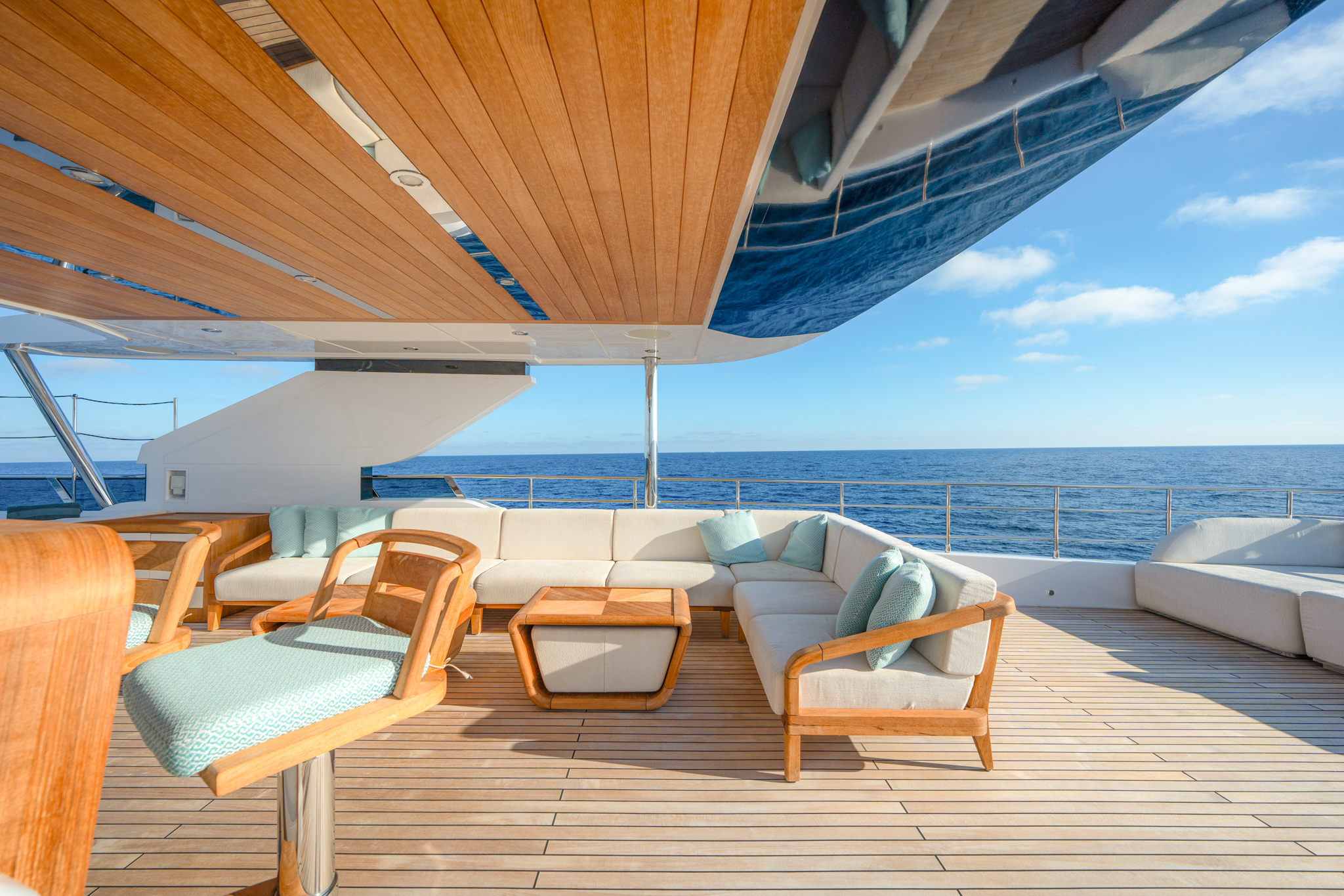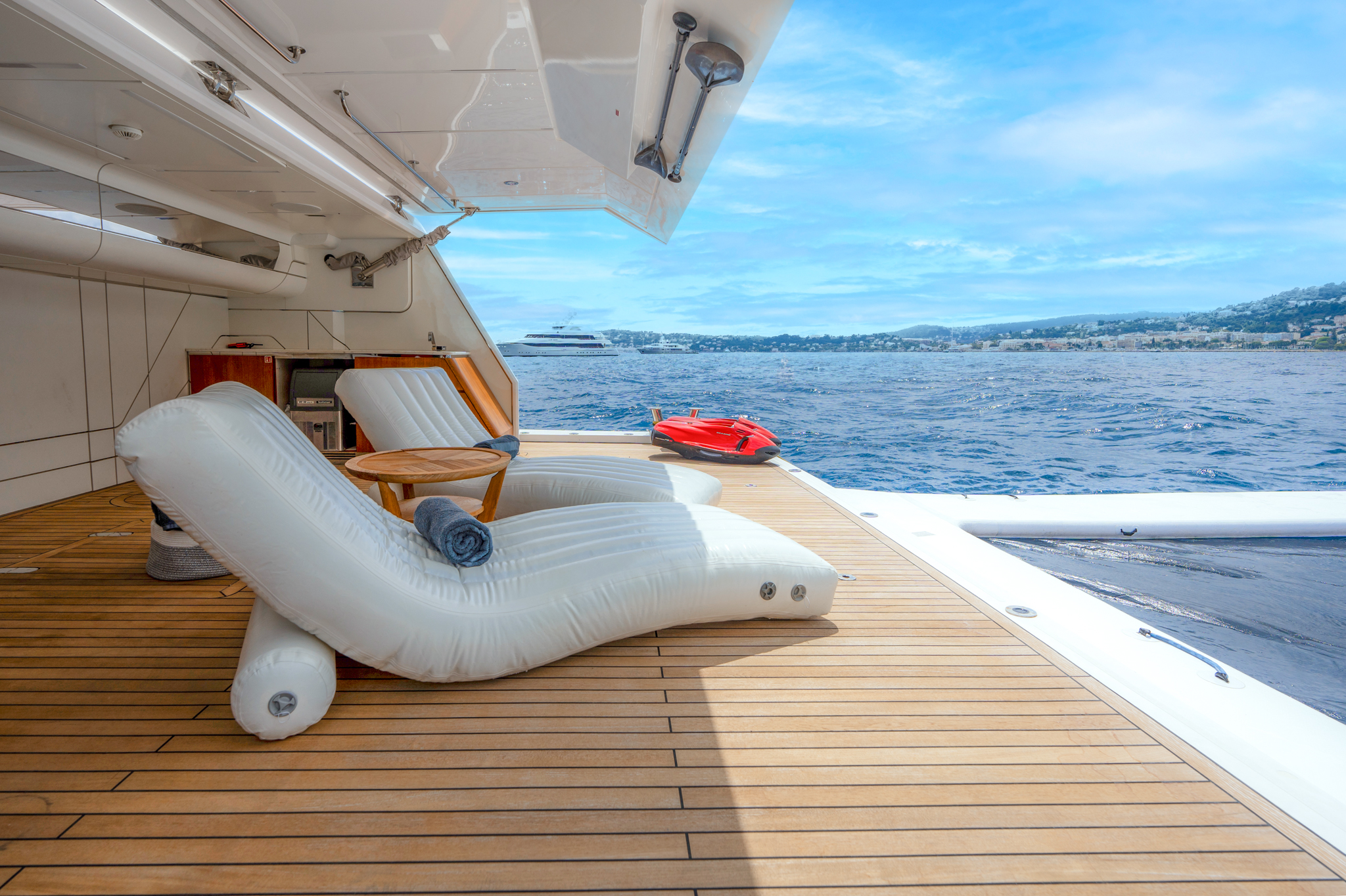 The smart layout onboard the Majesty 120 allows for a beachclub to double as a tender garage, creating a hybrid solution for the guests onboard. The multipurpose ladder that extends from the swim-platform allows for an easier and safer access to the superyacht while moored.