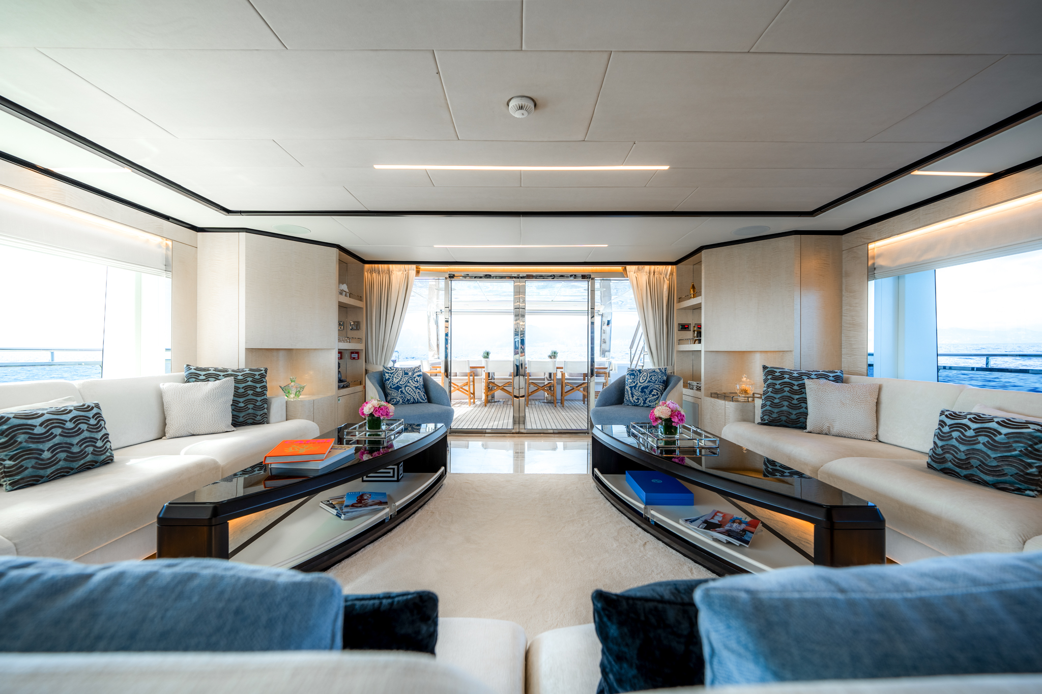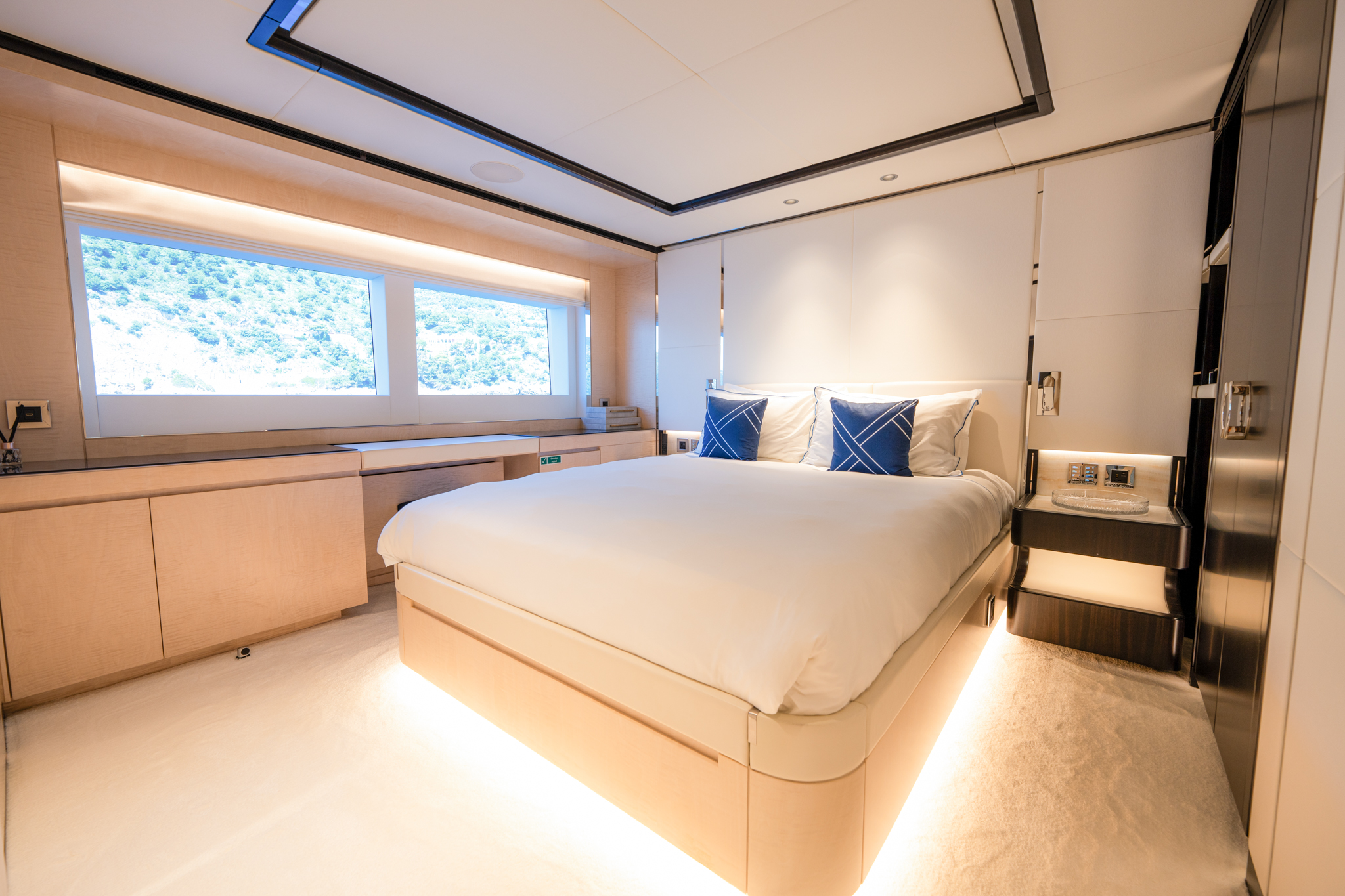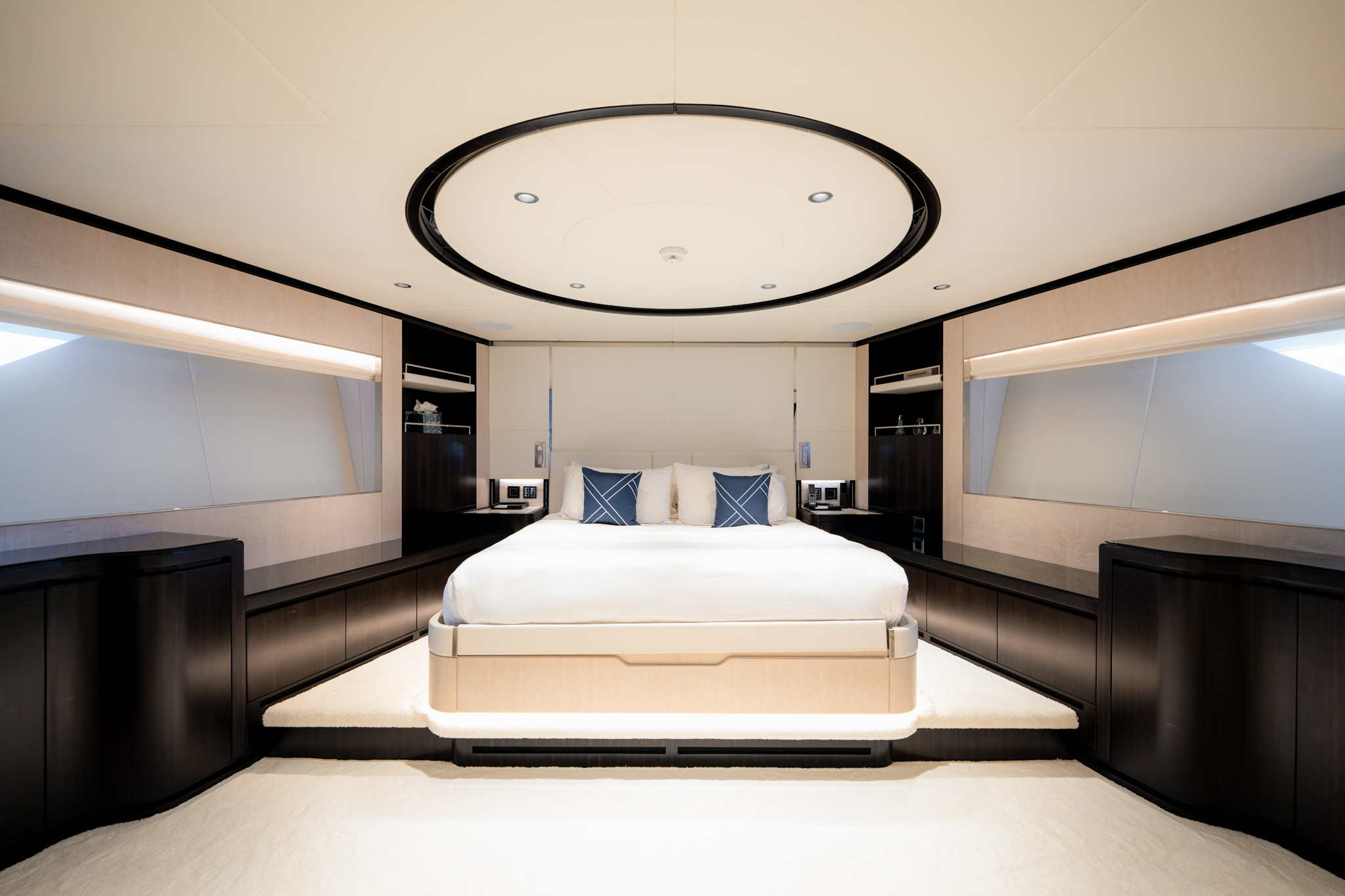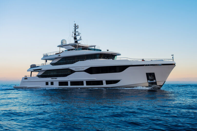Aggressive lines and a demanding profile define the Majesty 120, with the signature Majesty Yachts windows lining the hull. Extensive use of glass offers an unparalleled connection to the outdoors with low bulwarks allowing for an ornamental glass railing design. Amongst the standout features onboard the new Majesty 120 is a Jacuzzi situated on the sun deck. For optimal guest comfort, there are six cabins, including a full-beam master cabin on the main deck—a rare feature for super yachts of this length. This superyacht boasts 30% larger outdoor entertainment areas compared to any other yacht in its class.