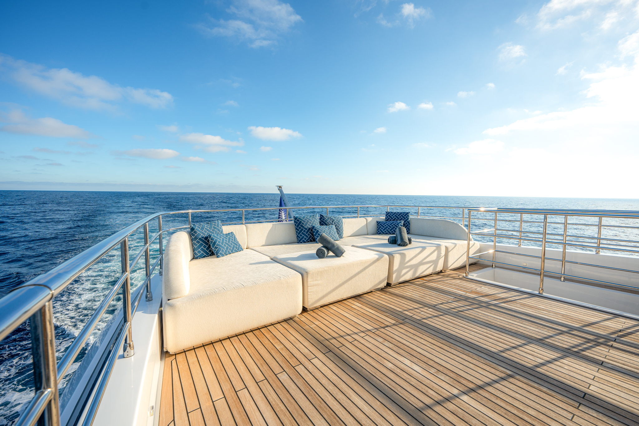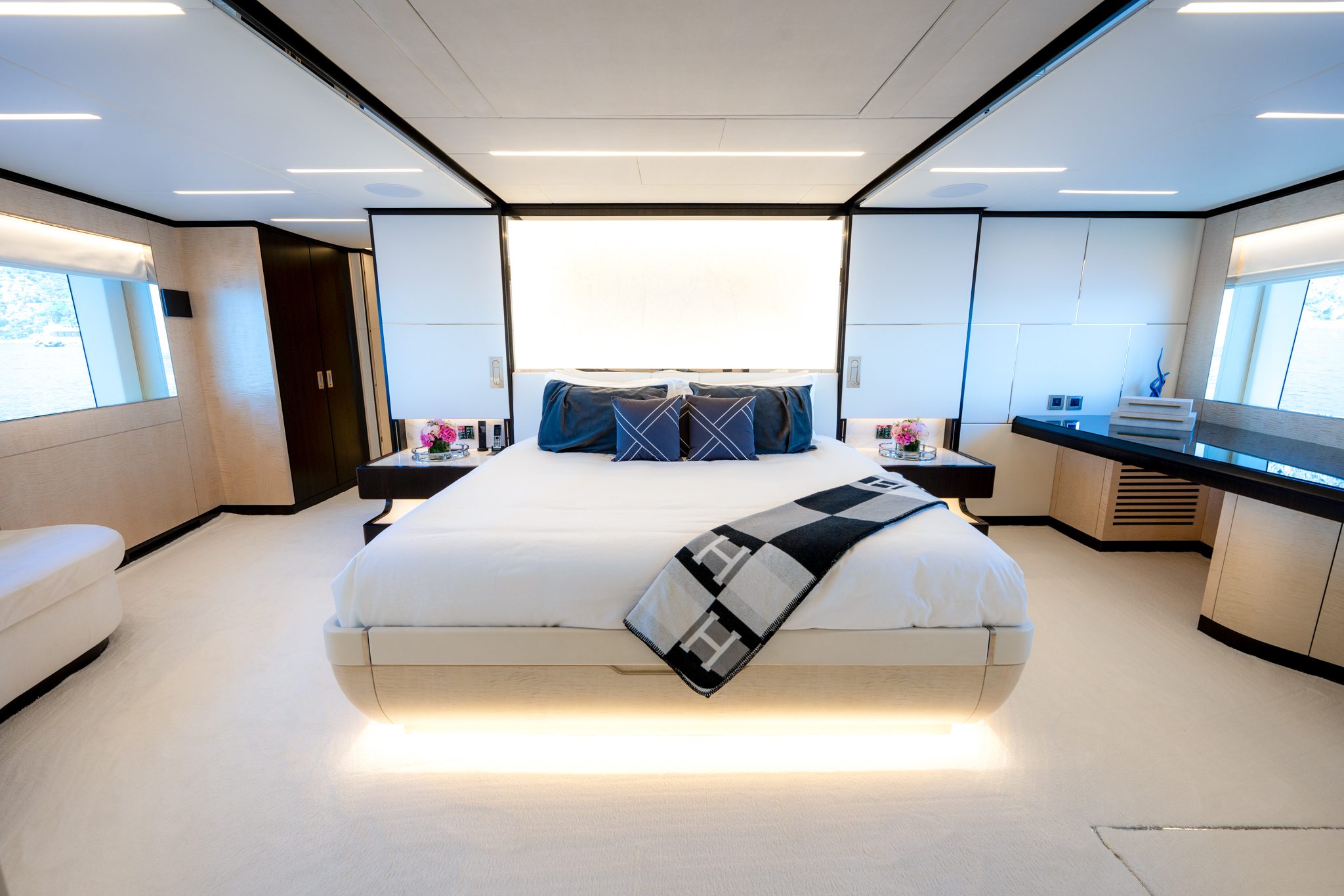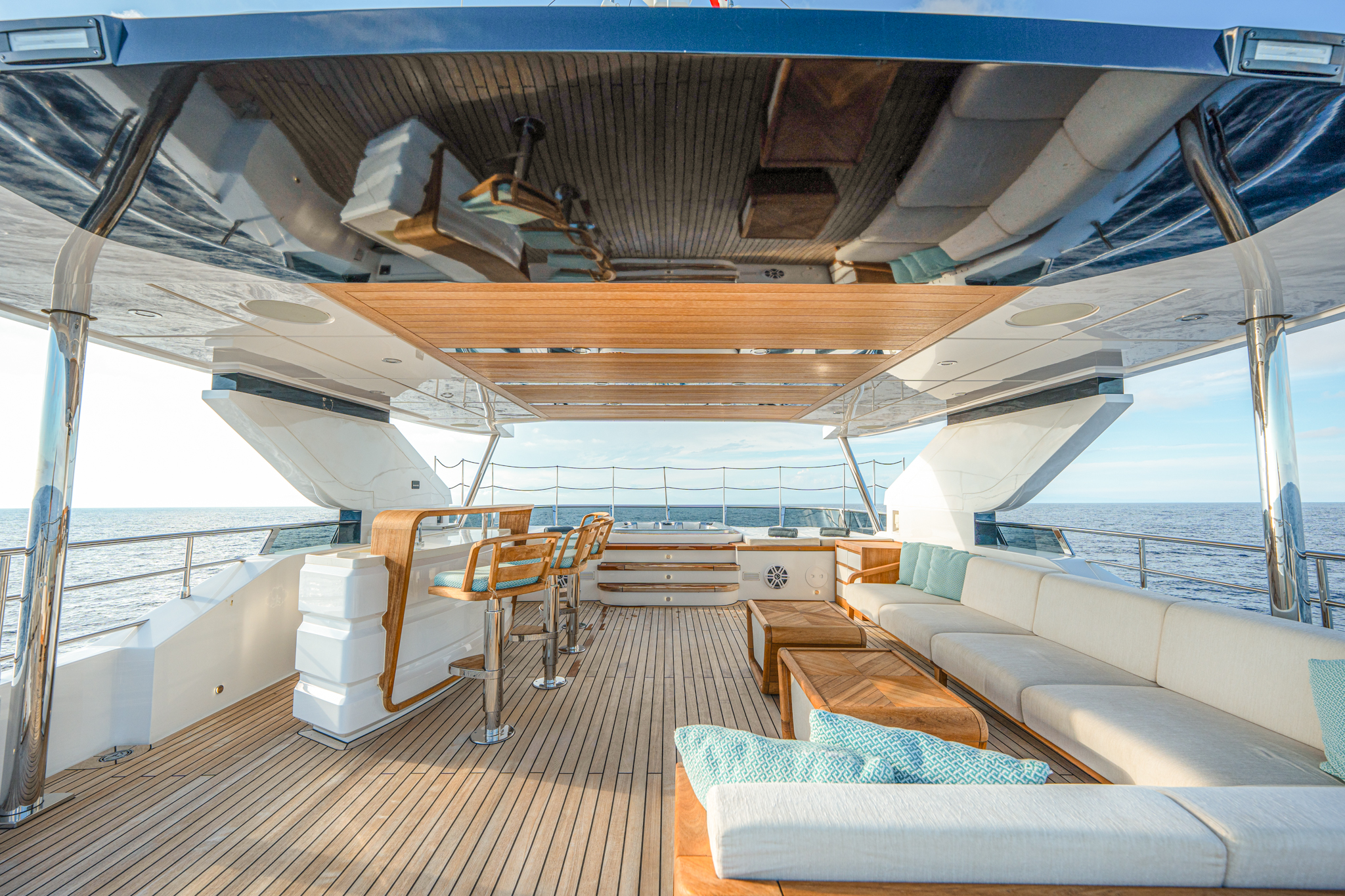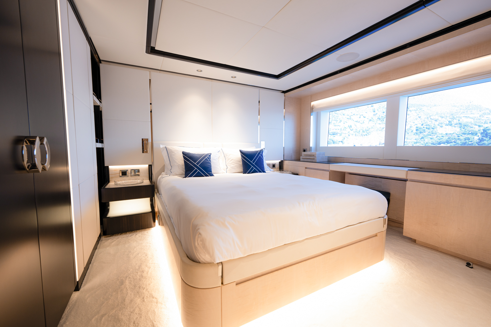 Aggressive lines and a demanding profile define the Majesty 120, with the signature Majesty Yachts windows lining the hull. Extensive use of glass offers an unparalleled connection to the outdoors with low bulwarks allowing for an ornamental glass railing design. Amongst the standout features onboard the new Majesty 120 is a Jacuzzi situated on the sun deck. For optimal guest comfort, there are six cabins, including a full-beam master cabin on the main deck—a rare feature for super yachts of this length. This superyacht boasts 30% larger outdoor entertainment areas compared to any other yacht in its class.